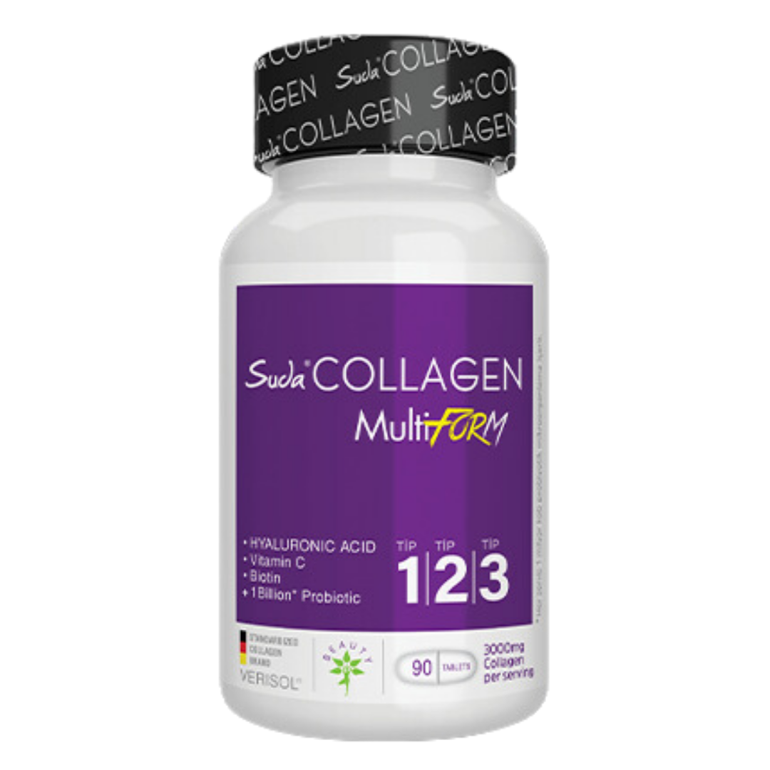 Türkiye’de ilk defa tip 1-2-3 tablet bir arada tablet formunda Suda Collagen Multiform’un tablet formu, kolajen ve probiyotik mikroorganizmaları beraber sunar. En büyük farklı, tip 1, tip 2 ve tip 3 kolajenin patentli formlarını bir arada içerir. Her servisinde (3 tablet) 3000 mg hidrolize kolajen peptiti ve 1 milyar probiyotik mikroorganizma içerir. Formülünde ayrıca C vitamini, hyaluronik asit, çinko ve biotin bulunur.