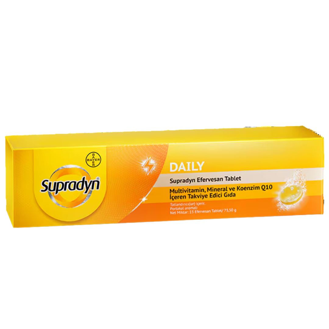Supradyn ® yoğun yaşamınızda aktif kalmanıza yardımcı olur. İçeriğindeki B1, B2, B5, B6, B7, B12, C vitaminleri ve Demir, Kalsiyum , Bakır, İyot, Magnezyum , Mangan ile normal enerji oluşum metabolizmasına katkıda bulunur. İçeriğindeki B2, B3, B5, B6, B9, B12, C vitaminleri ve Demir, Magnezyum ile yorgunluk ve bitkinliğin azalmasına katkıda bulunur.