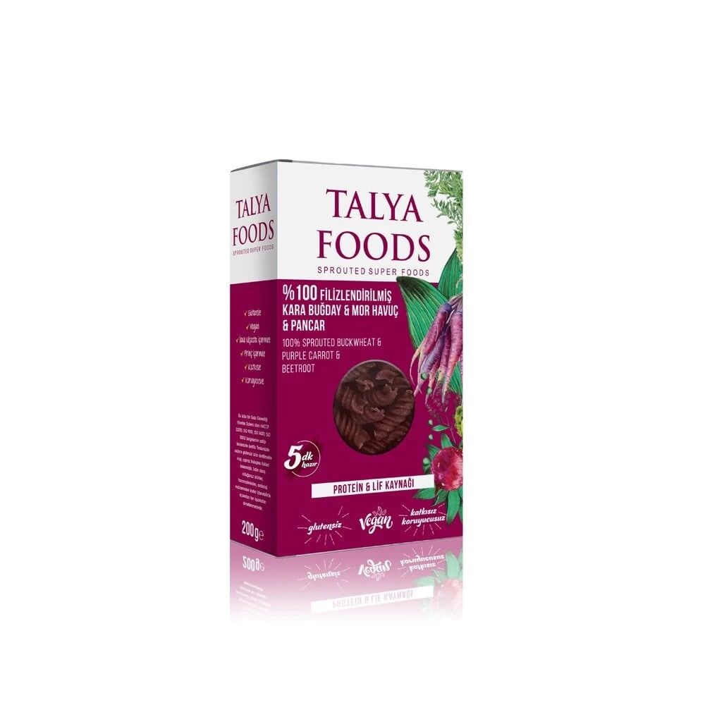 Talya Foods ÇiğKarabuğday Mor Havuç Pancar Makarnası 200g, glutensiz ve vegan beslenenleriçin uygundur. pancar püresi ile zenginleştirilmiş bu makarna, lezzetli bir alternatif sunar. Çiğ Karabuğday Pancar Makarnası 200g, pratik pişirme süresi ve k günlük öğünlerinizde lezzetli tercihler yapmanıza yardımcı olur.Yumurta, süt ürünleri, renklendirici, tatlandırıcı, mısır, pirinç ve ilave nişasta içermez.