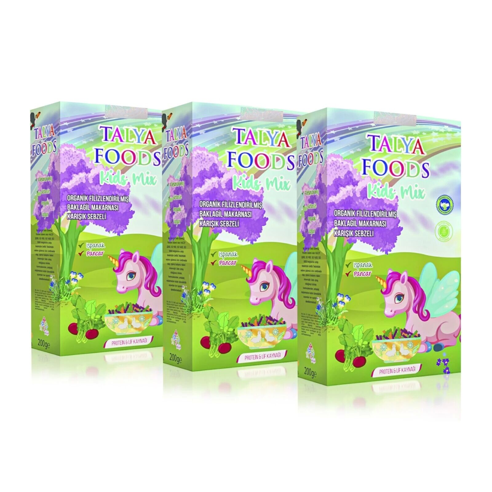 Talya Foods Glutensiz Vegan Unicorn Serisi 3x200g, besleyici ve lezzetli bir glutensiz makarna serisidir. Bu ürünün içerisinde organik filizlendirilmiş kırmızı mercimek unu, organik filizlendirilmiş yeşil mercimek unu, organik filizlendirilmiş nohut unu, organik ıspanak, organik pancar ve su bulunur. Üç adet 200 gramlık paketler halinde sunulan bu makarna serisini, t hem siz hem de çocuğunuz için güvenle tercih edebilirsiniz.