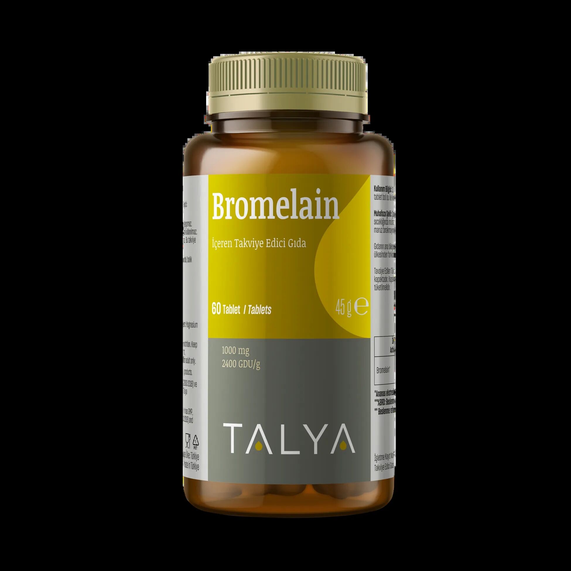 Her iki tablette 1000 mg bromelain (ananas ekstresinden elde edilmiştir) içerir.