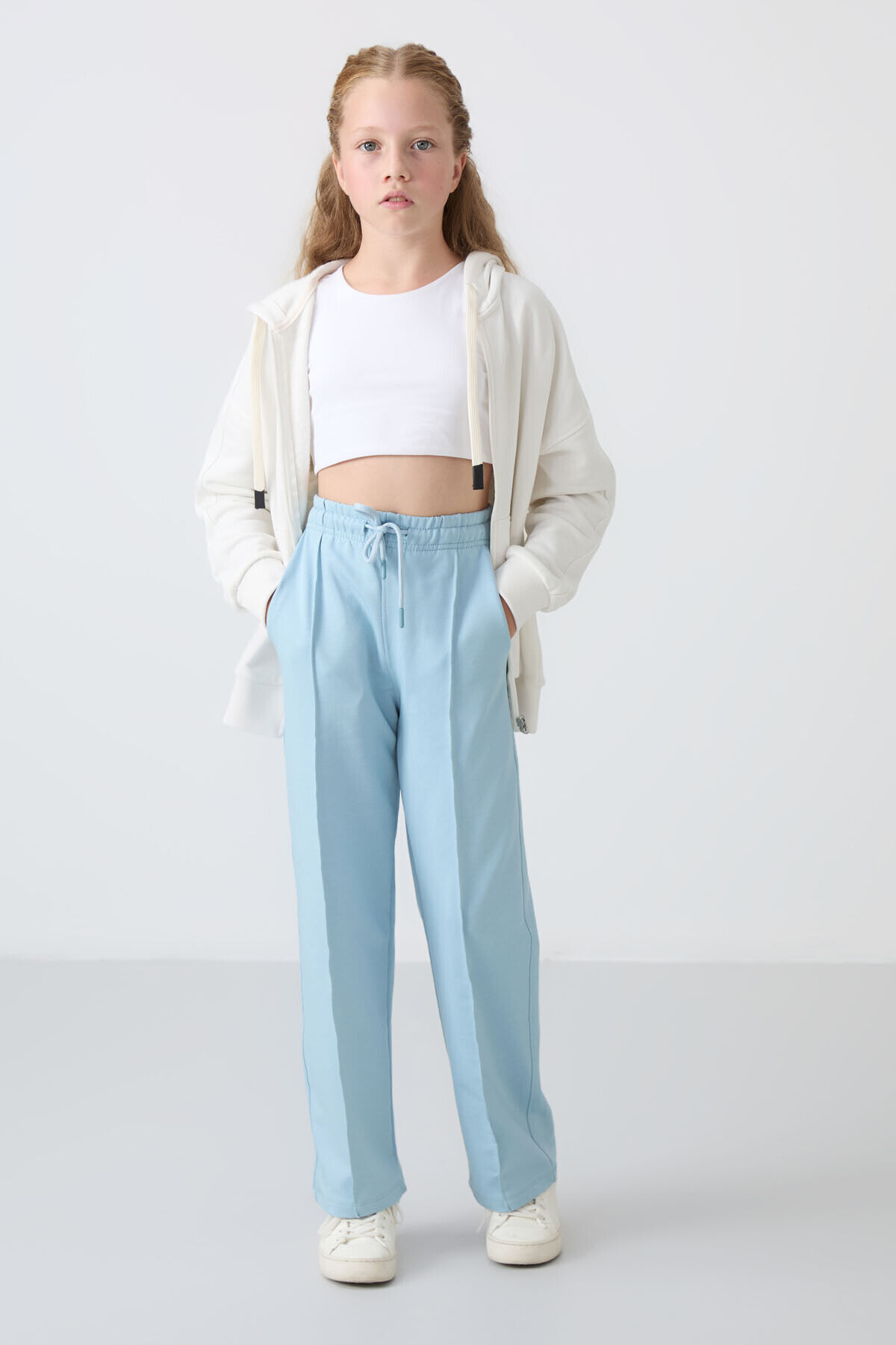 TommyLife Açık Mavi Cepli Ön Dikiş Detaylı Geniş Paça Kız Çocuk Eşofman Altı -75144