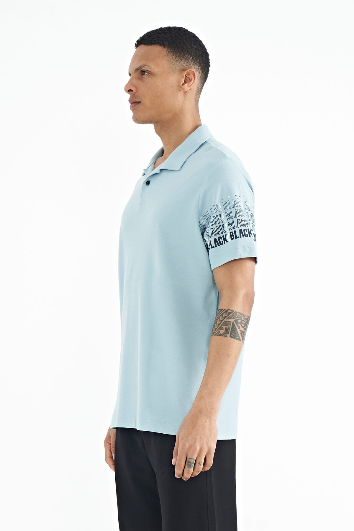 TommyLife Açık Mavi Kol Baskı Detaylı Polo Yaka Standart Form Erkek T-shirt - 88240