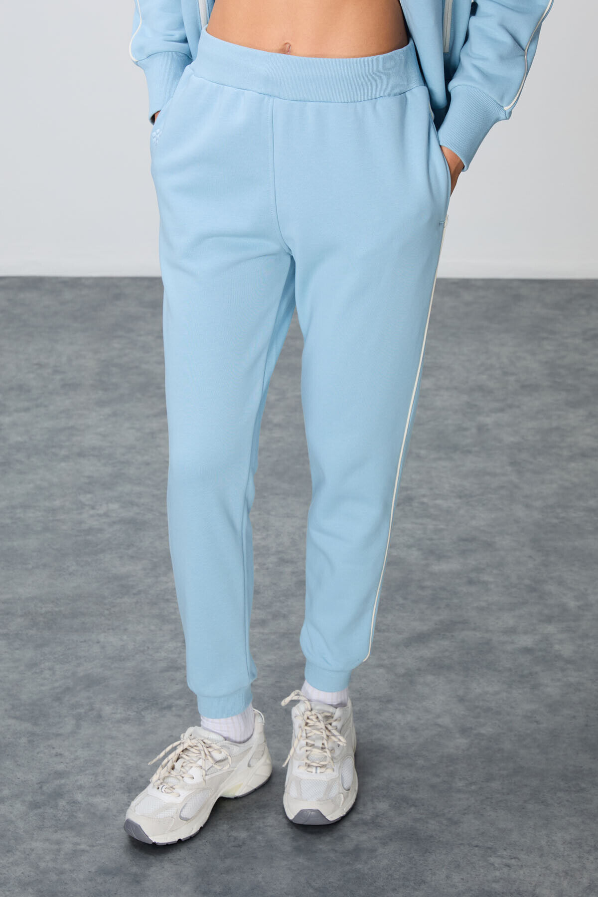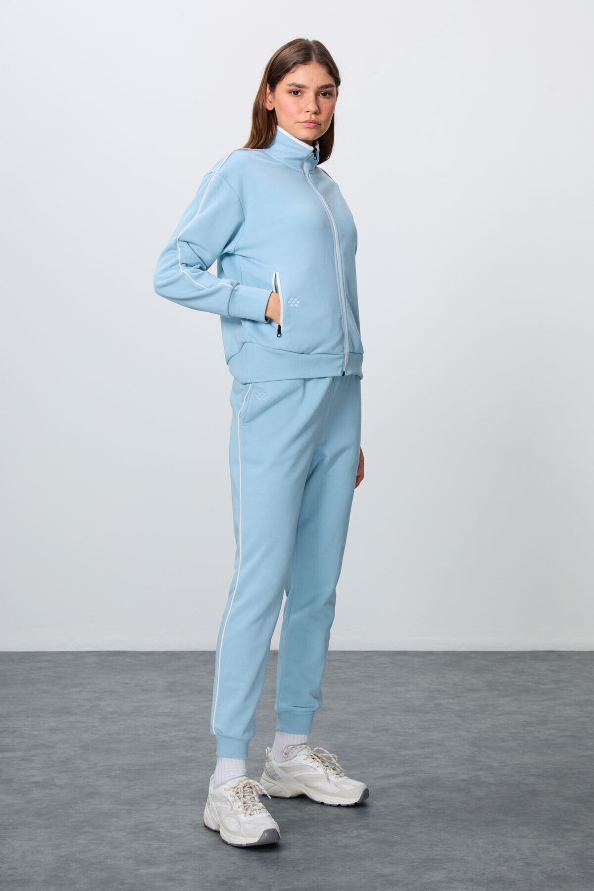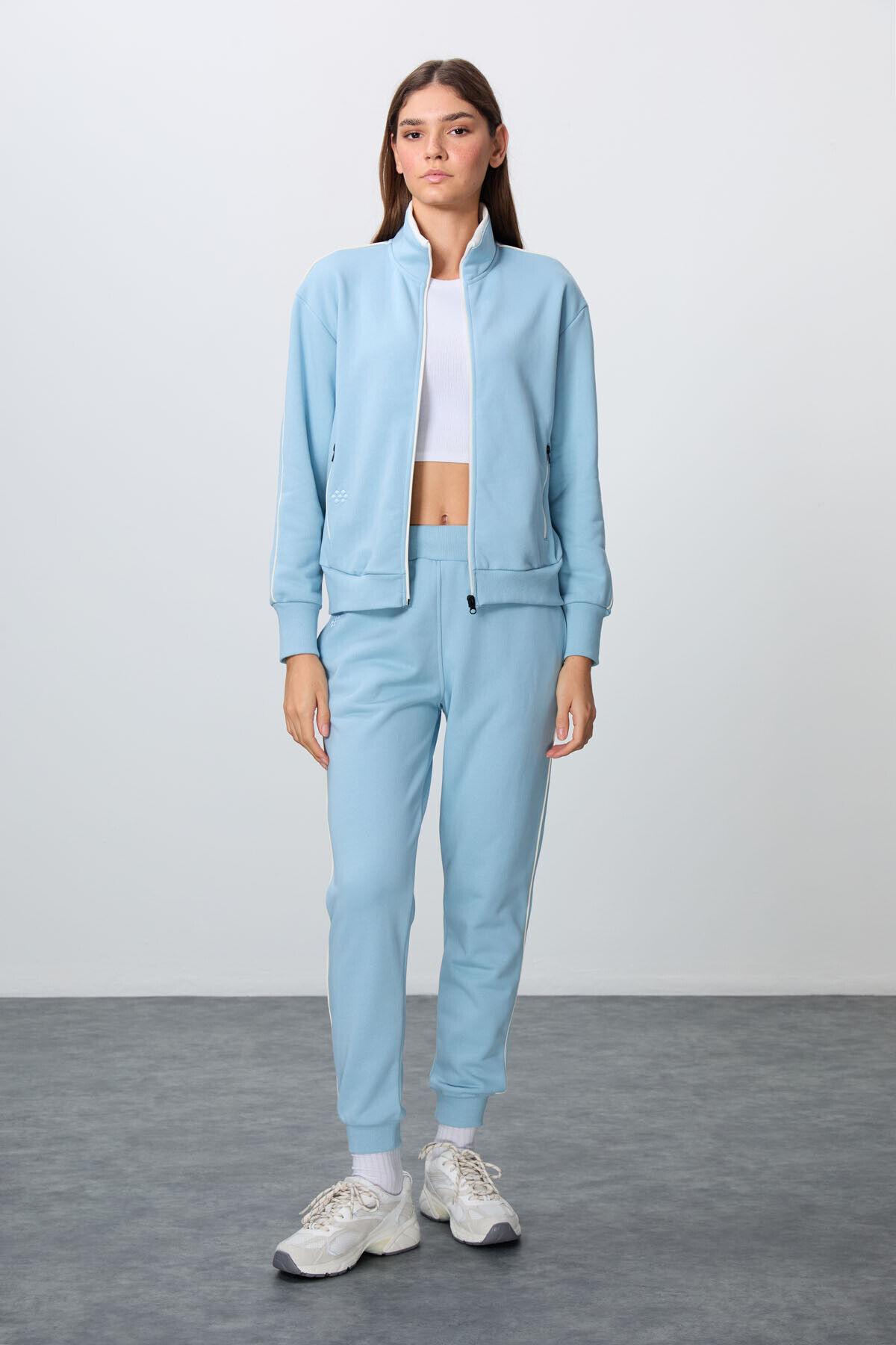 TommyLife Açık Mavi Kompakt Pamuklu Kalın Pürüzsüz Dokulu Dik Yaka Oversize Fit Kadın Eşofman Takım - 95340