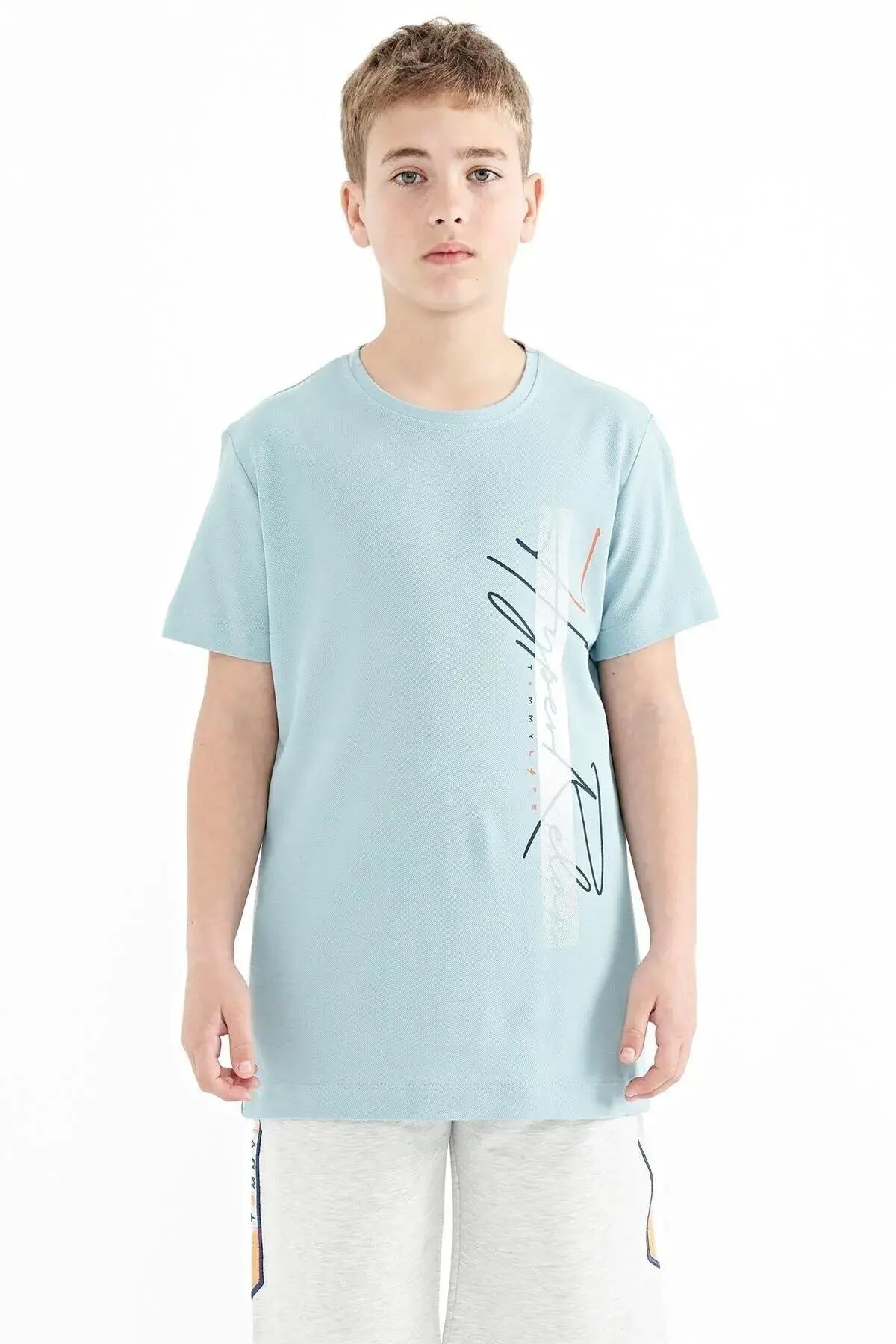 TommyLife Açık Mavi Yazı Baskılı O Yaka Standart Kalıp Erkek Çocuk T-Shirt - 11119