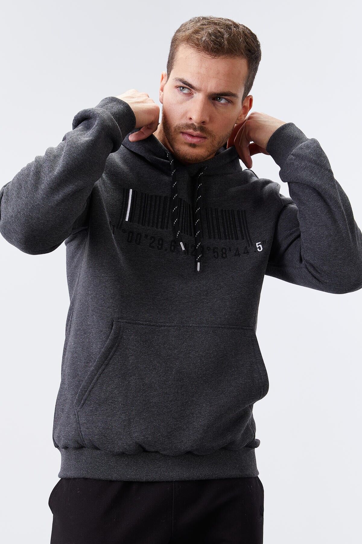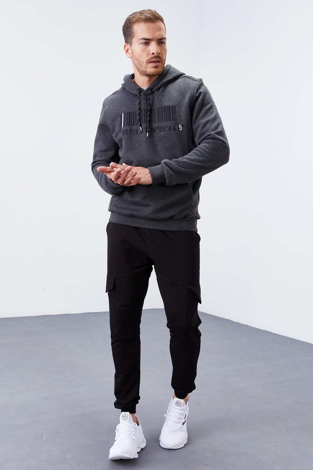 TommyLife Antrasit Melanj Nakışlı Kanguru Cep Standart Kalıp Kapüşonlu Erkek Sweatshirt - 87839