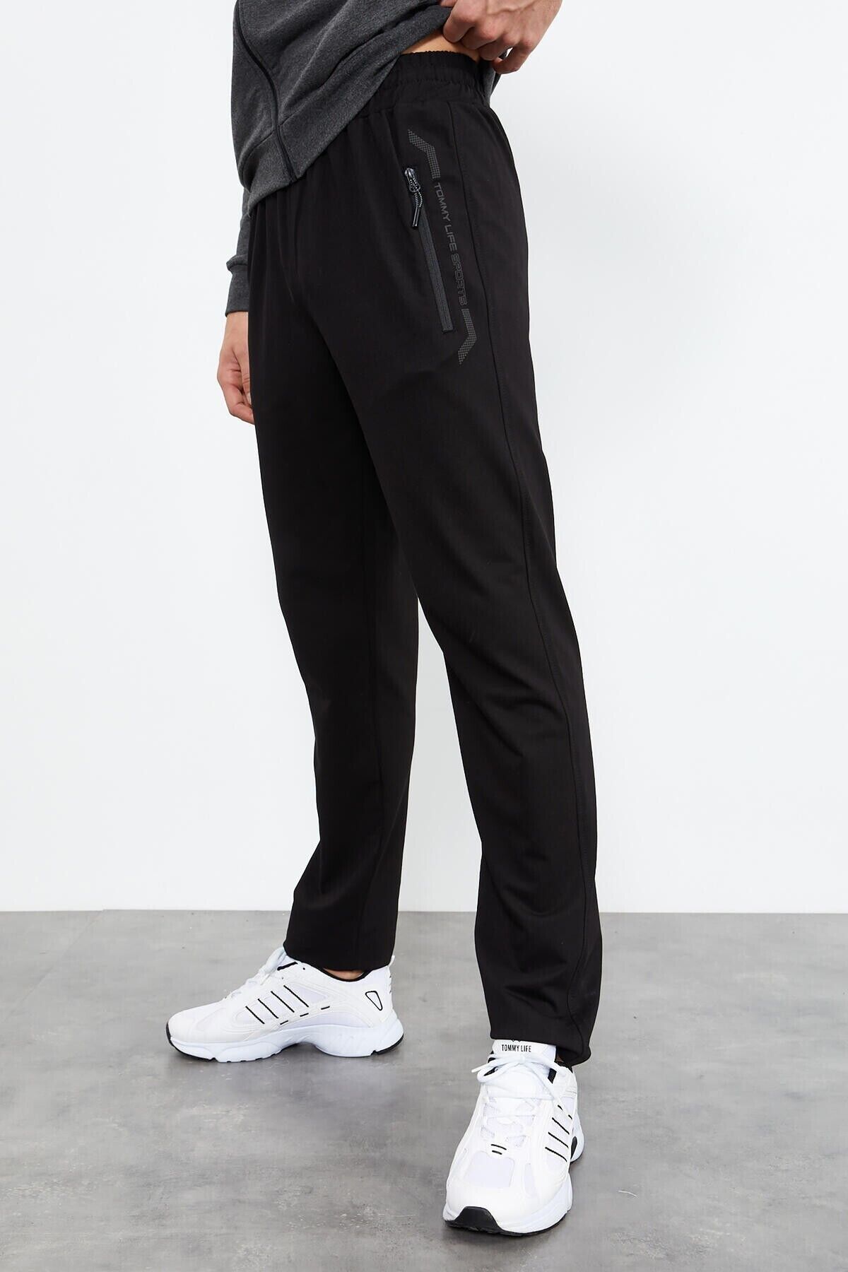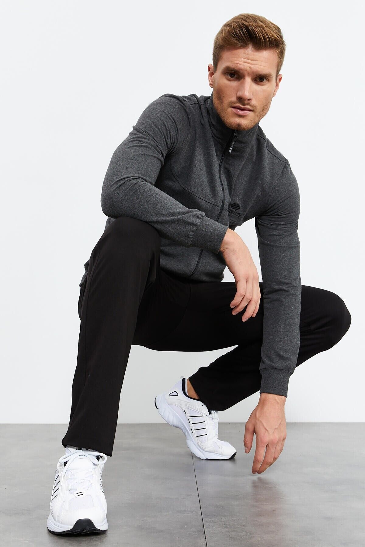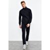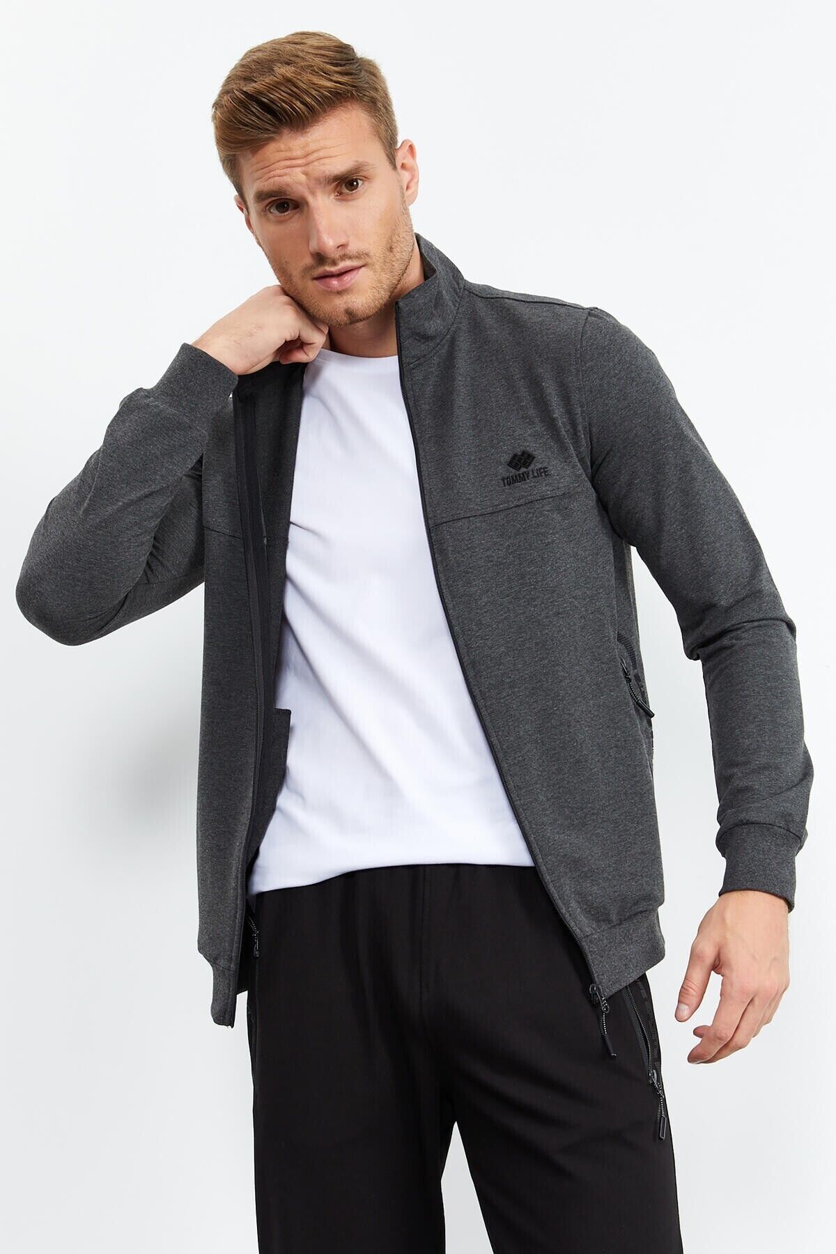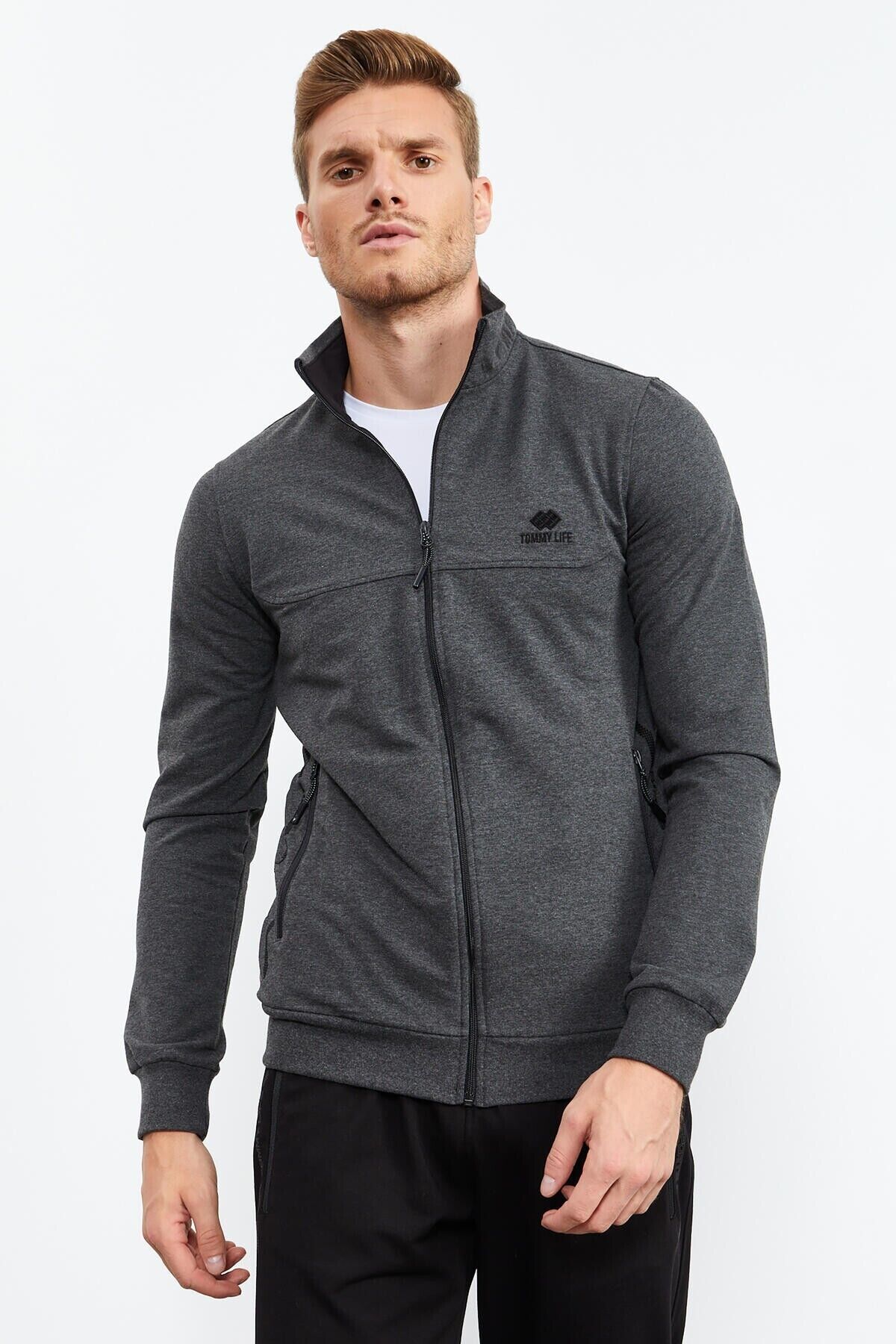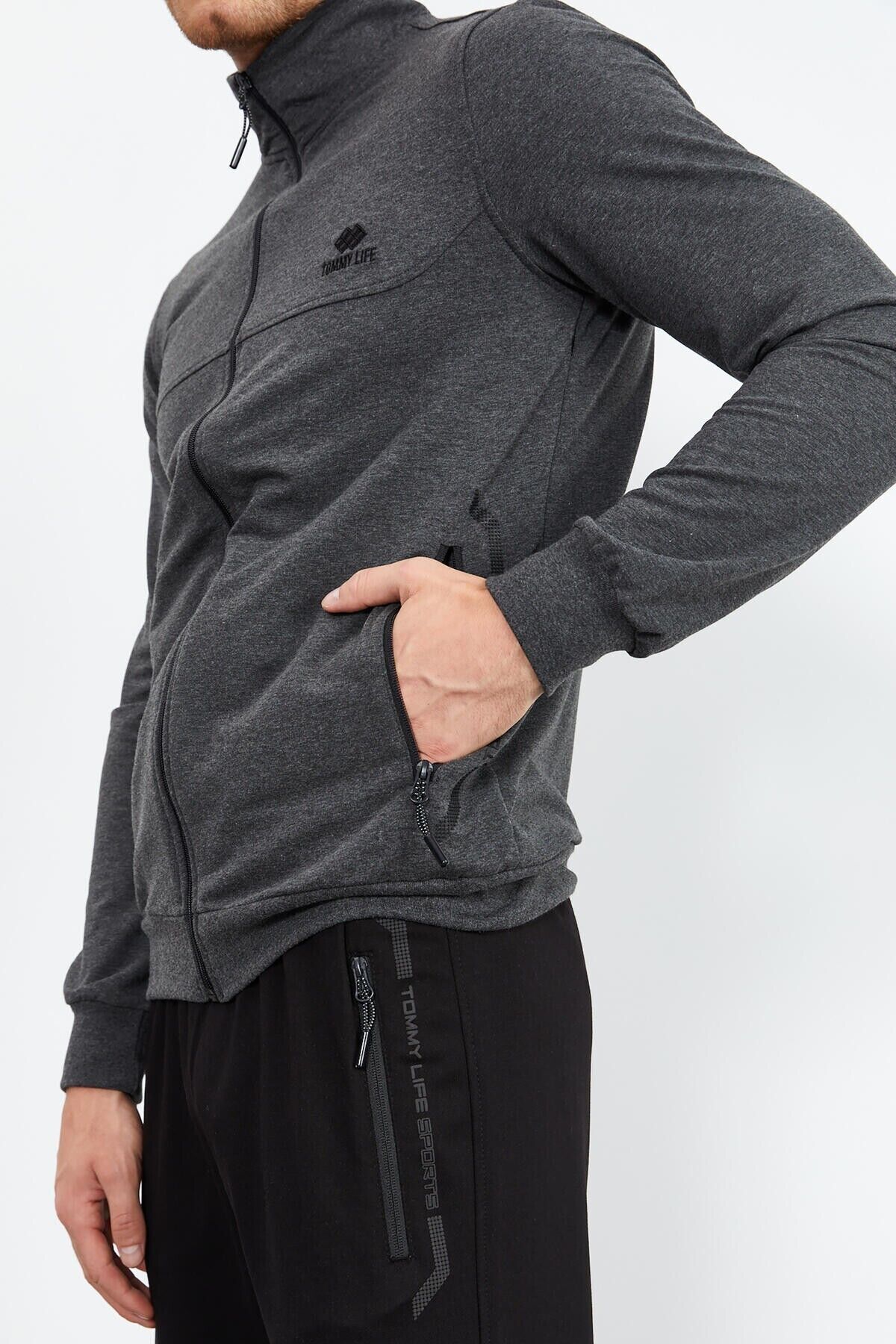 TommyLife Antrasit Melanj - Siyah Dik Yaka Fermuarlı Standart Kalıp Klasik Paça Erkek Eşofman Takımı - 85152