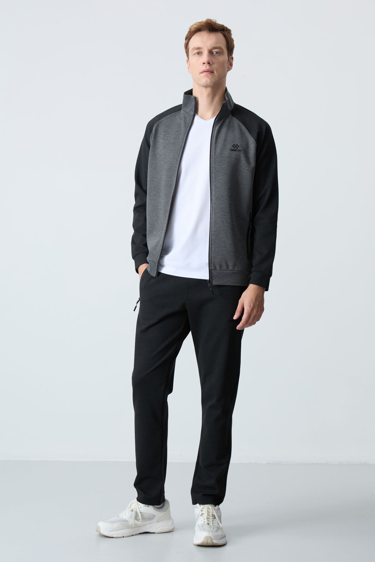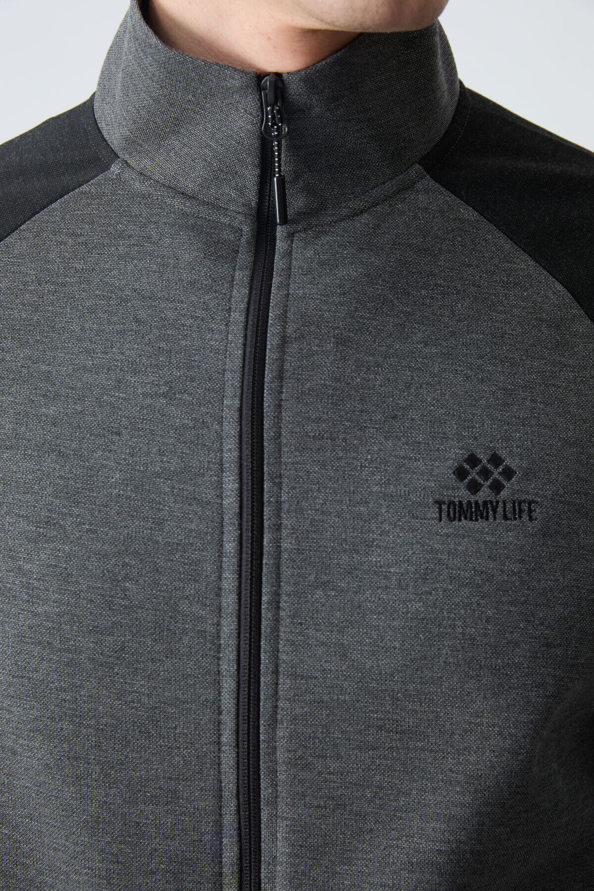 TommyLife Antrasit - Siyah Dik Yaka Çift Renk Rahat Form Klasik Paça Erkek Eşofman Takımı - 85113