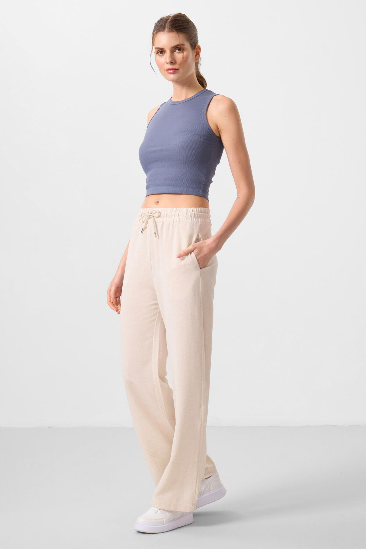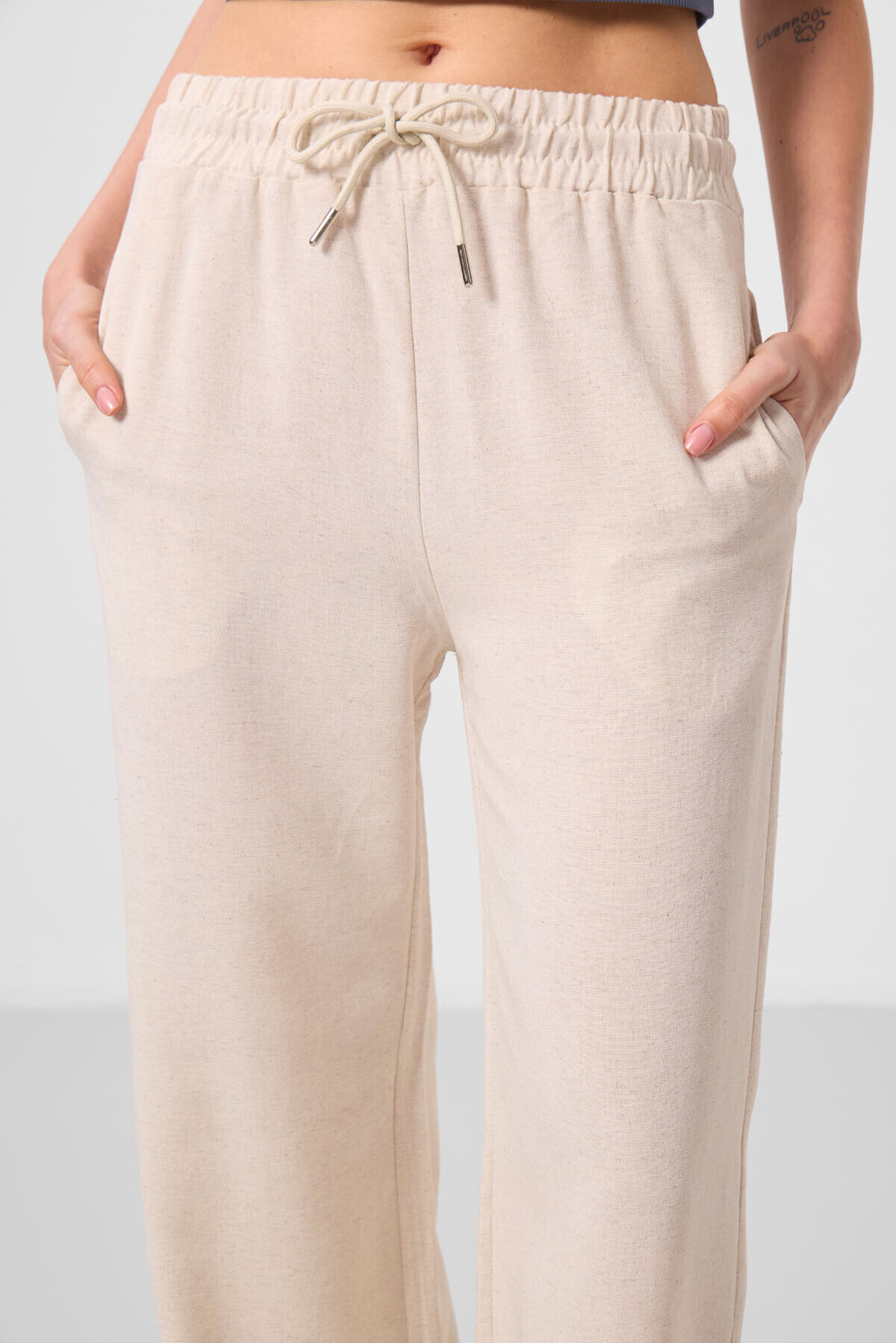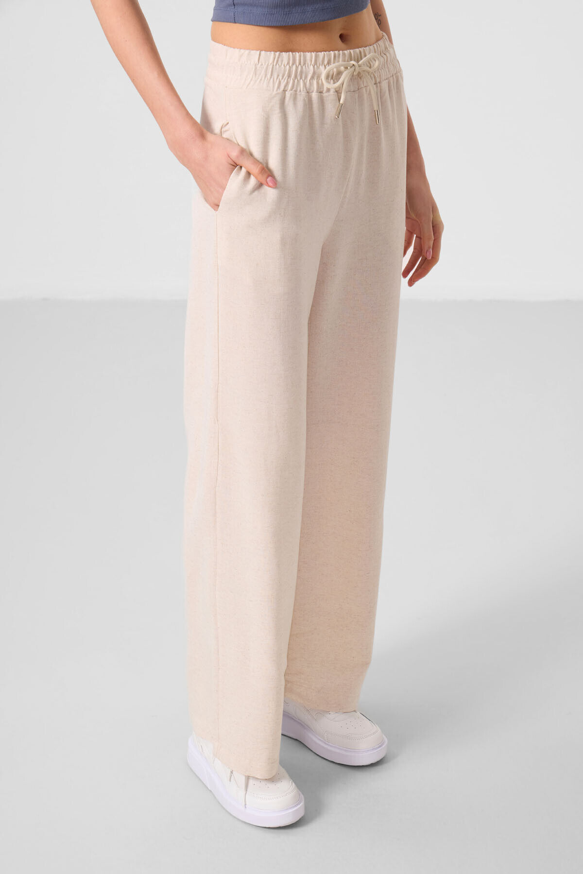 TommyLife Bej Keten Geniş Paça Rahat Form Kadın Palazzo Pantolon - 94675