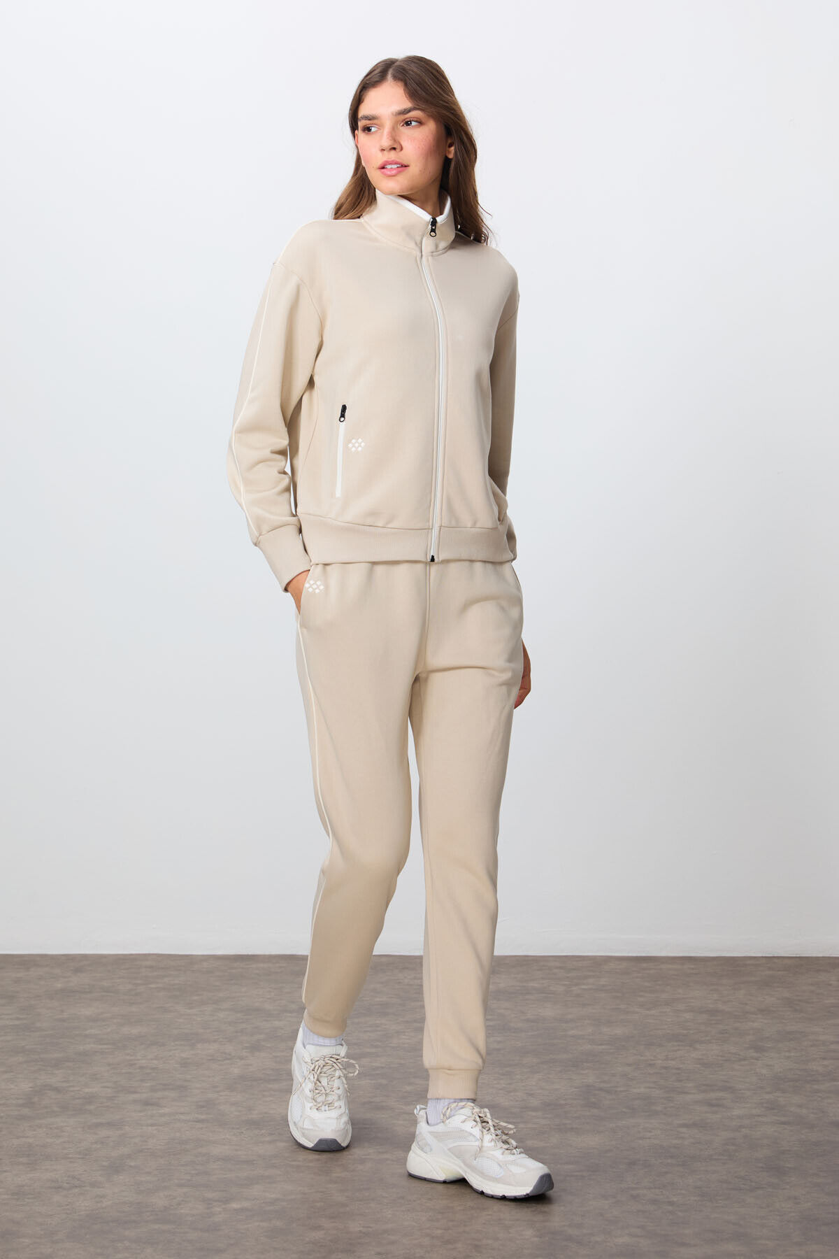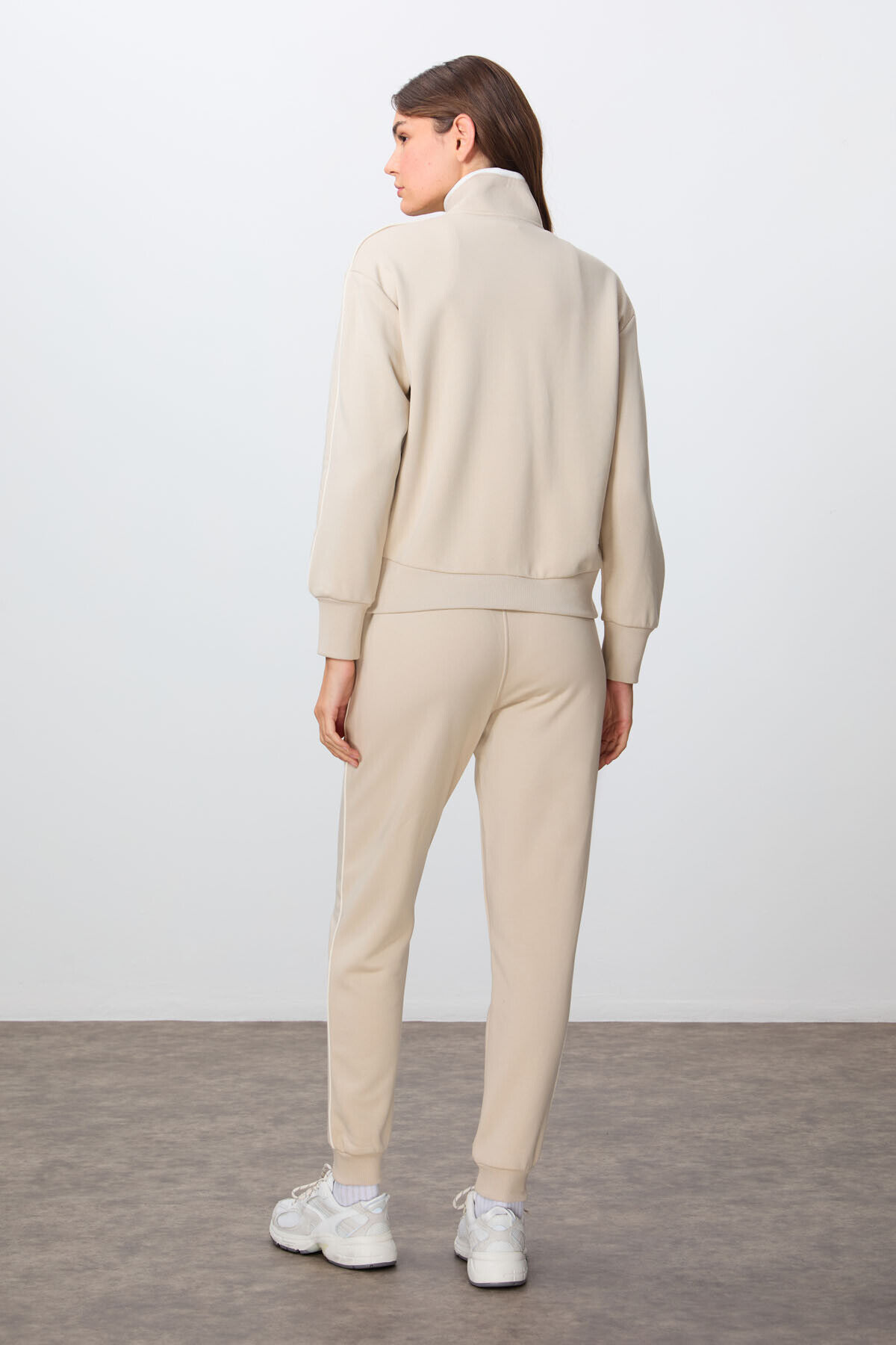 TommyLife Bej Kompakt Pamuklu Kalın Pürüzsüz Dokulu Dik Yaka Oversize Fit Kadın Eşofman Takım - 95340
