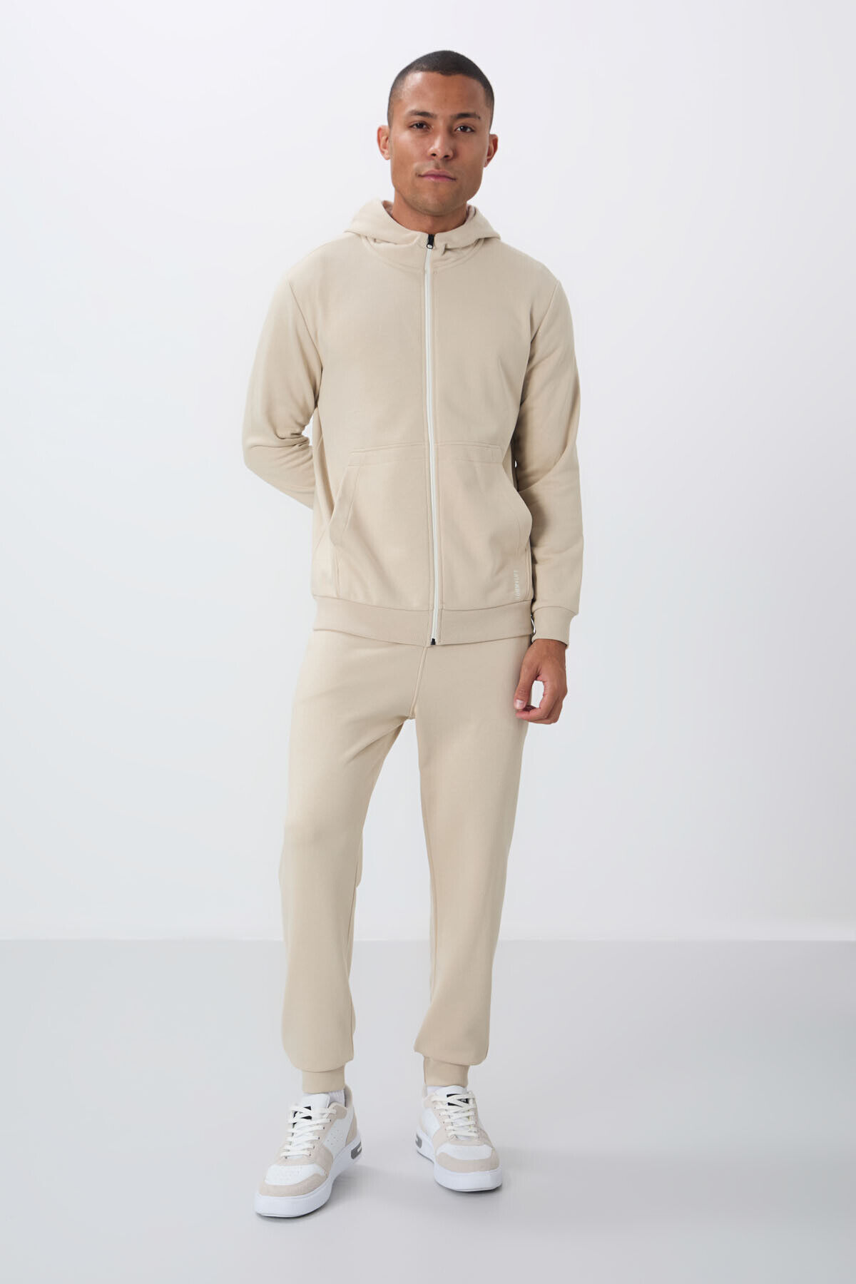TommyLife Bej Kompakt Pamuklu Kalın Pürüzsüz Dokulu Kapüşonlu Comfort Fit Erkek Eşofman Takım - 85262