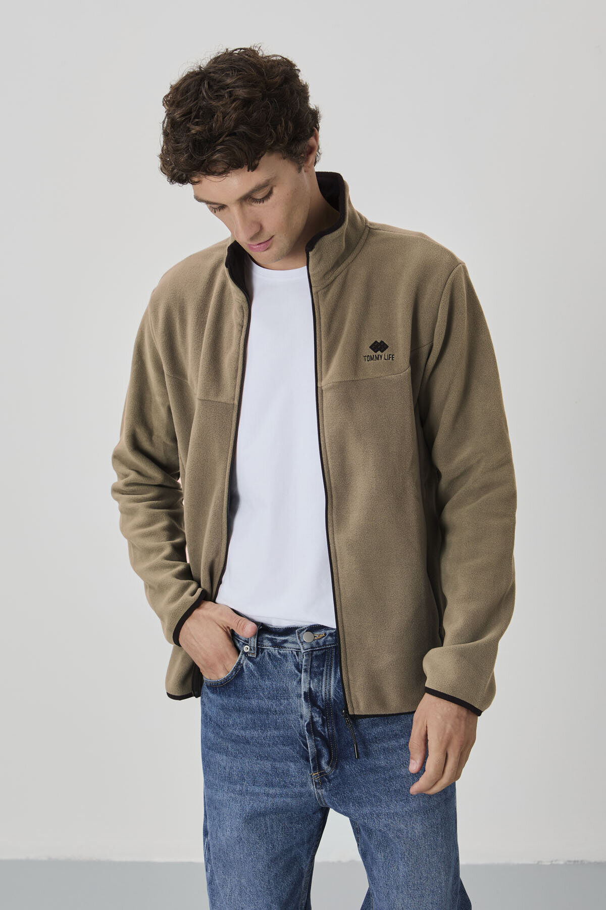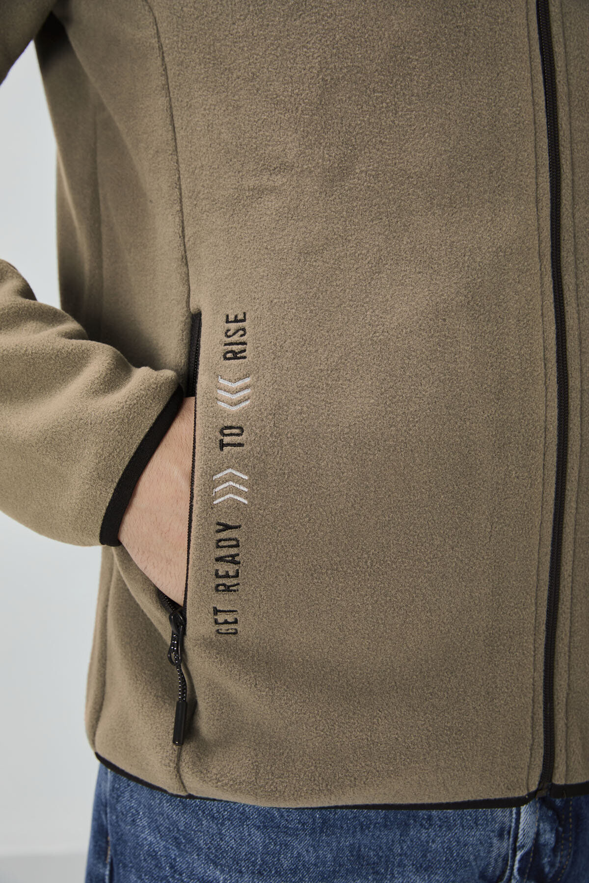TommyLife Camel Yazı Nakışlı Dik Yaka Fermuarlı Standart Kalıp Erkek Sweatshirt Polar - 87992