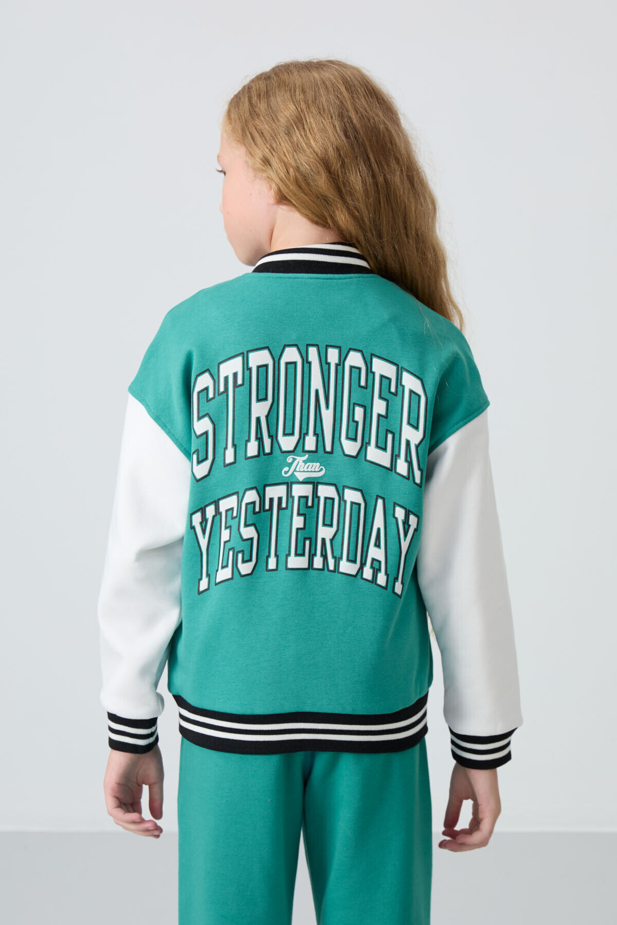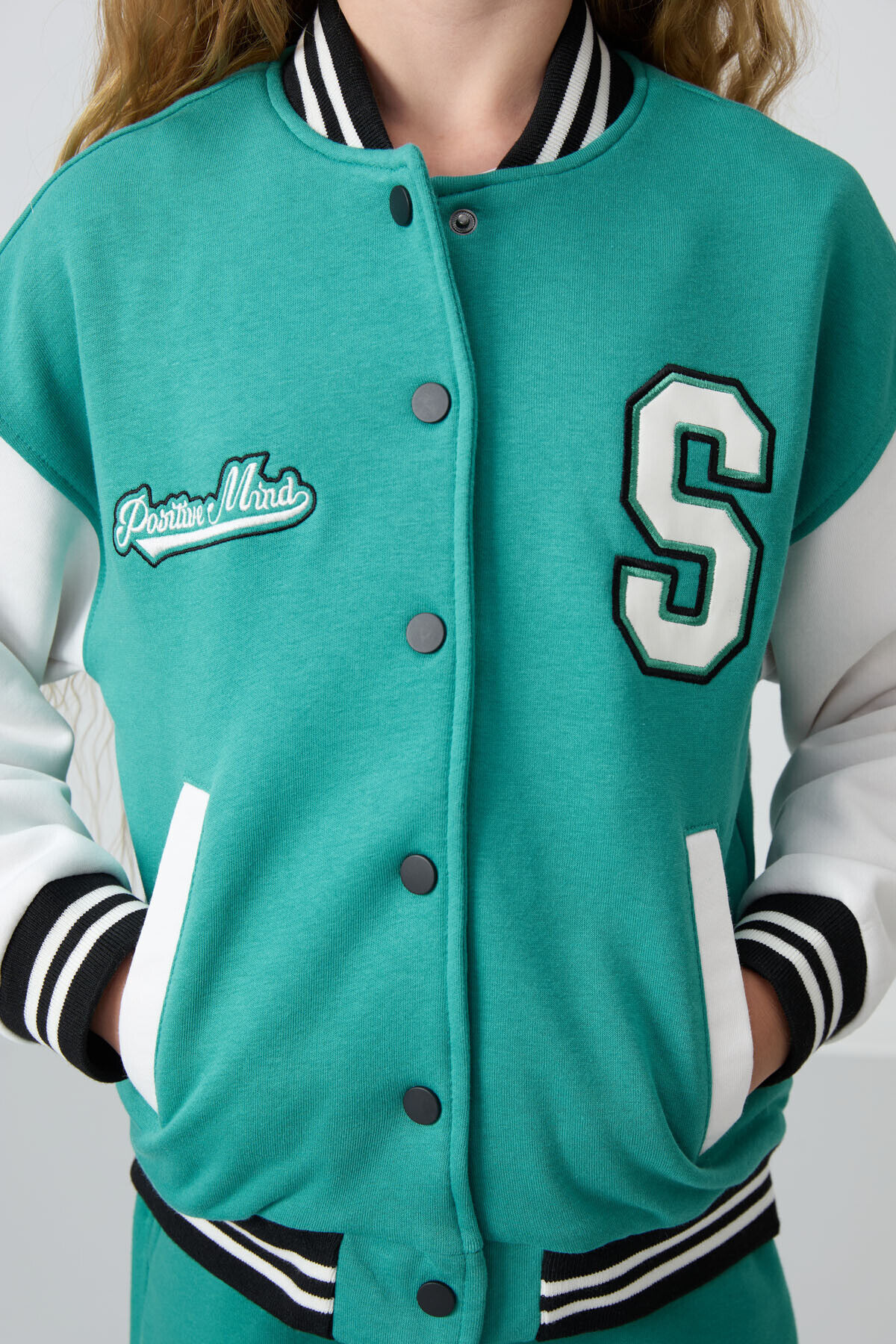 Deniz Yeşil Pamuklu İçi Tüylü Yumuşak Dokulu Standart Fit Nakışlı Kız Çocuk Kolej Ceket - 75163