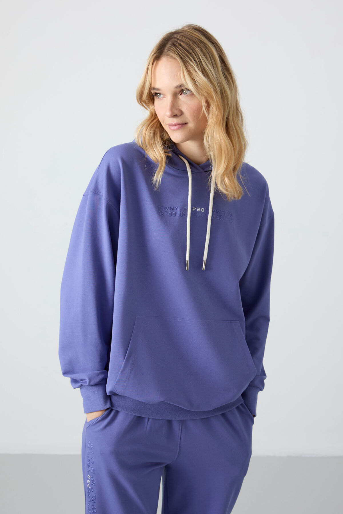 TommyLife Eflatun Kapüşonlu Kanguru Cep Oversize Lastik Paça Kadın Eşofman Takımı - 95288