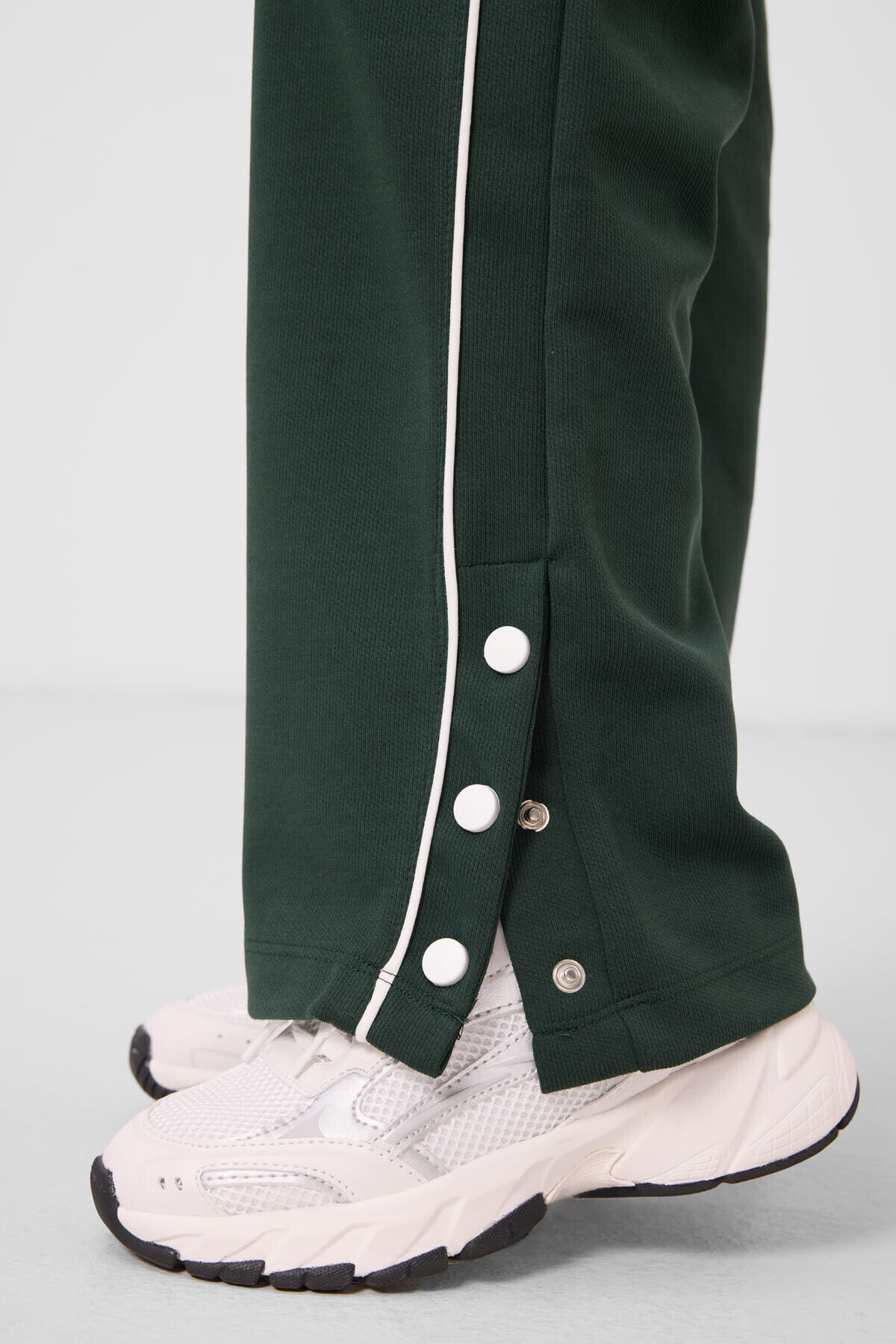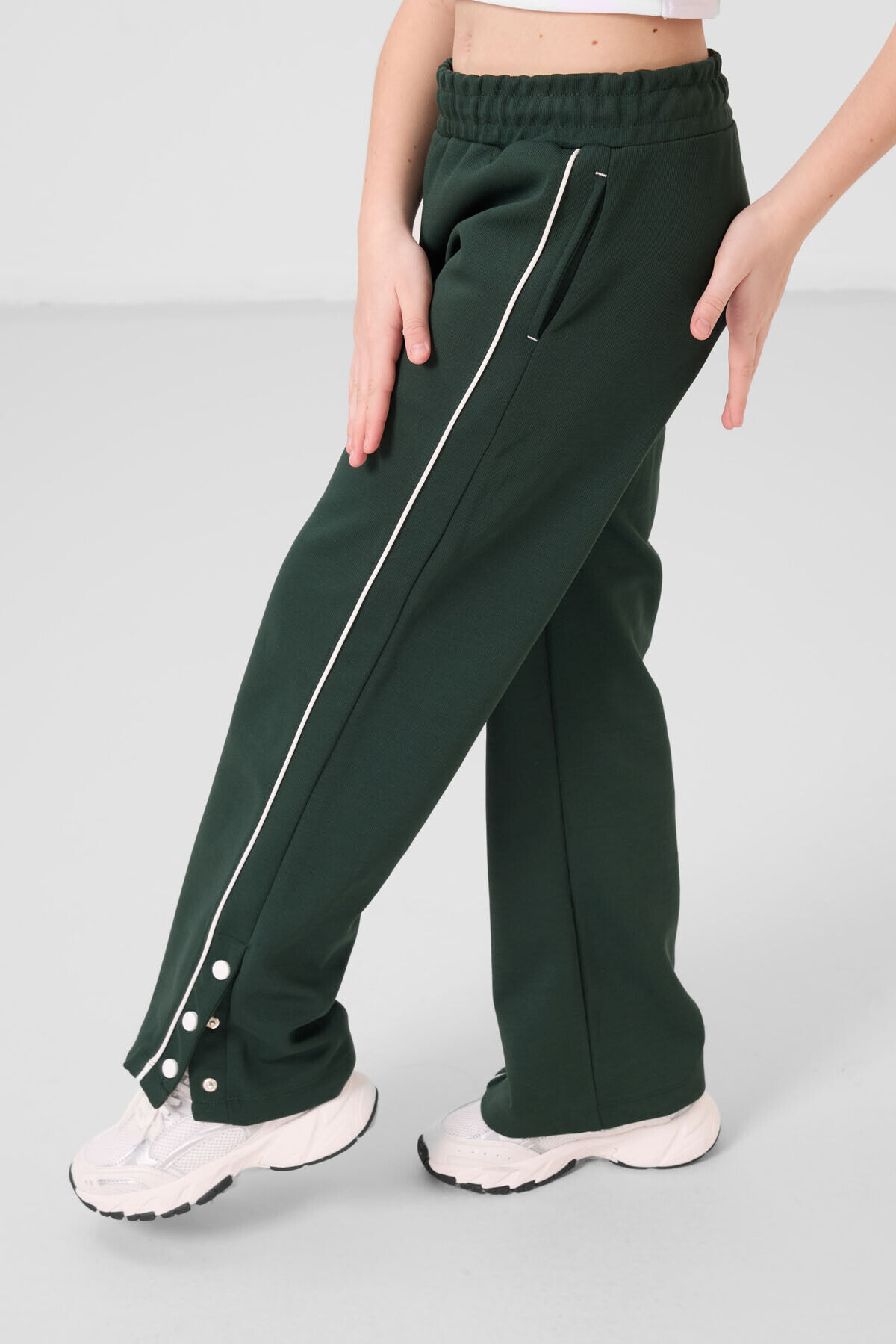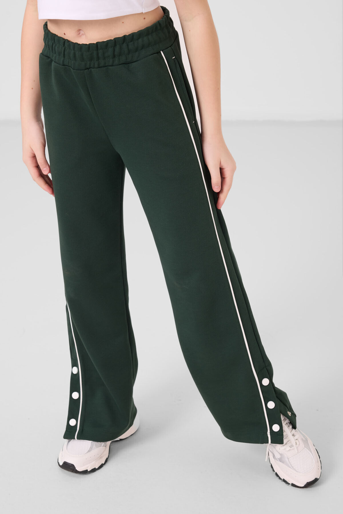 TommyLife Ekru-Çam Yeşil O Yaka Baskılı Geniş Paça Çıt Çıt Detaylı Kız Çocuk Palazzo Eşofman Takım - 75172