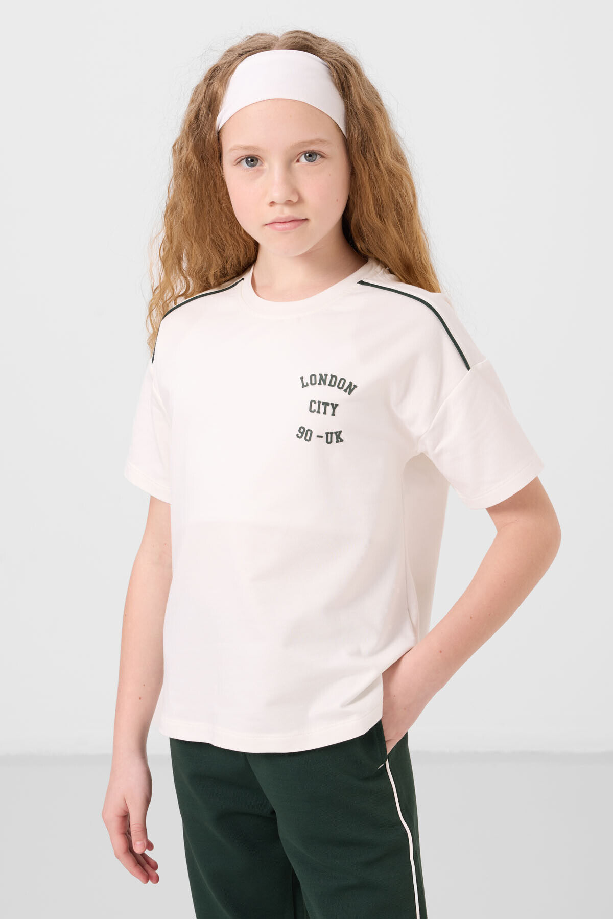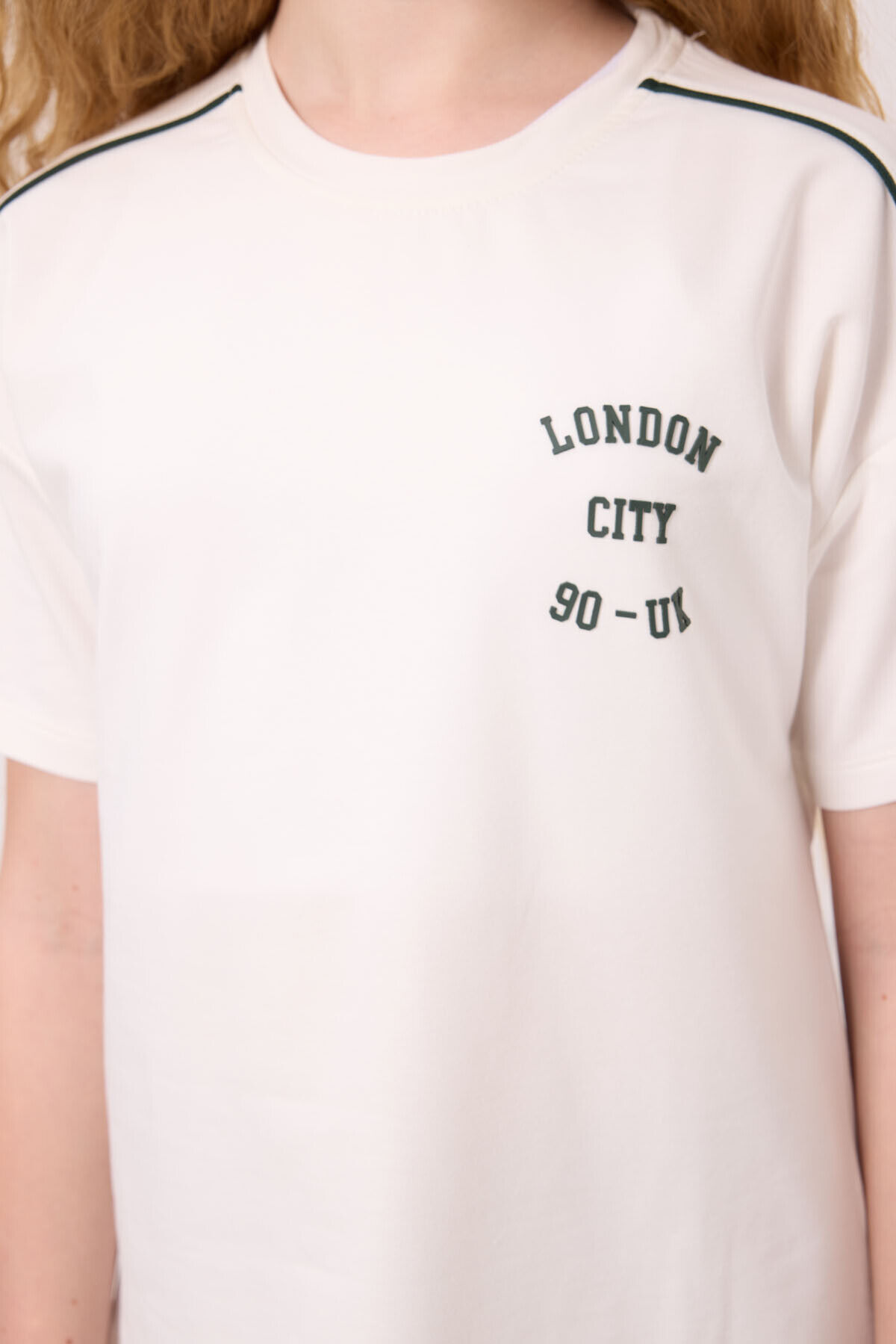 TommyLife Ekru-Çam Yeşil O Yaka Baskılı Lastik Paçalı Standart Fit Kız Çocuk Eşofman Takım - 75186