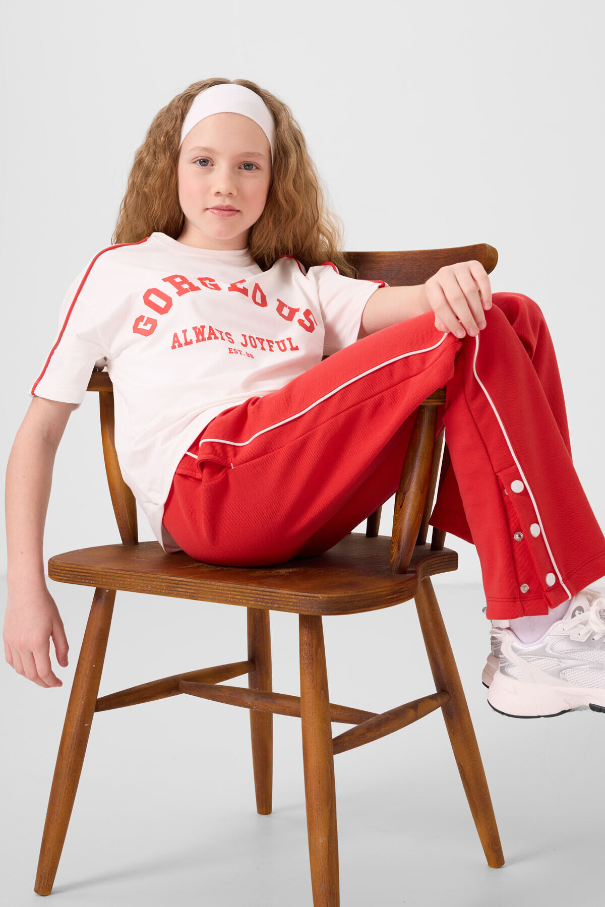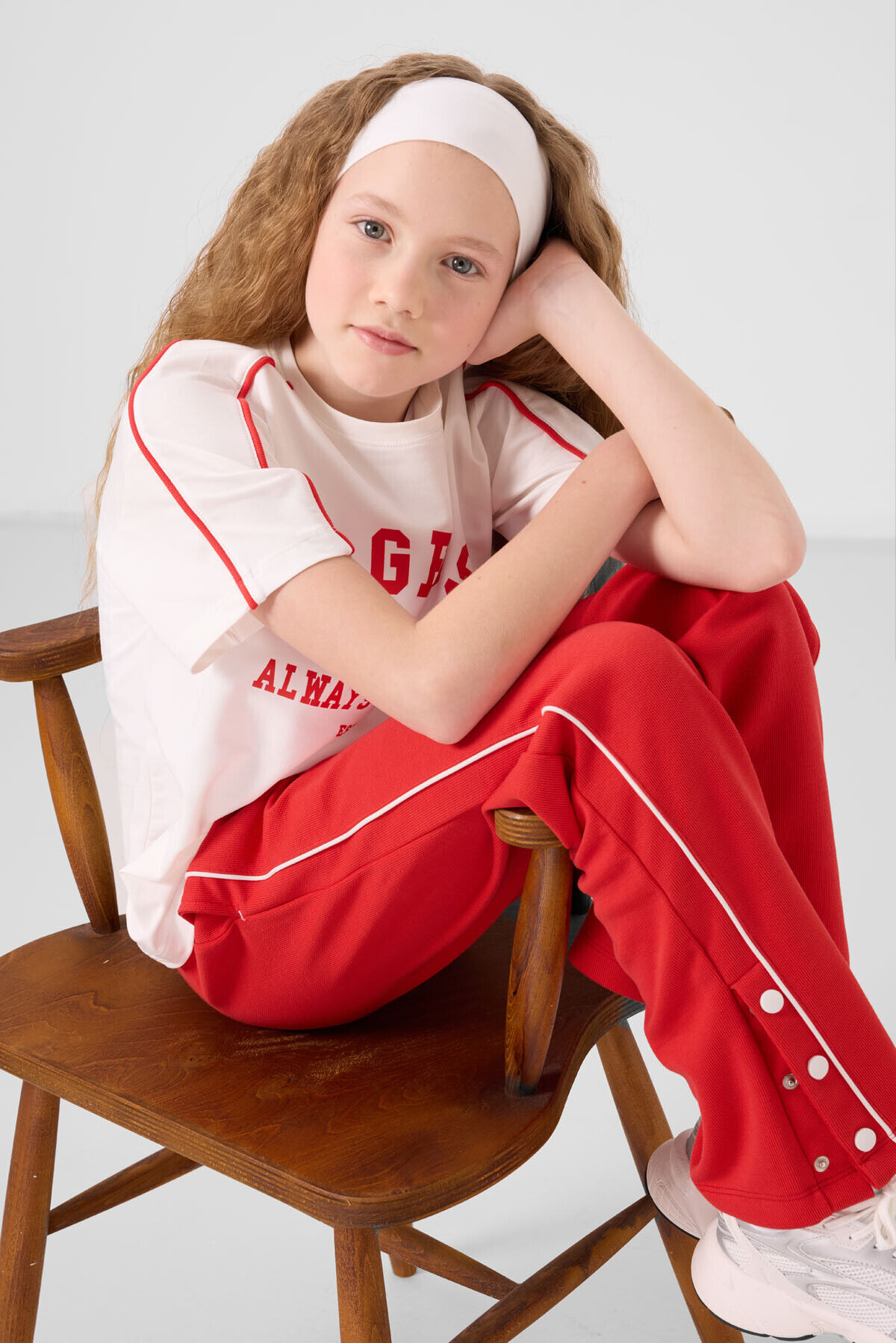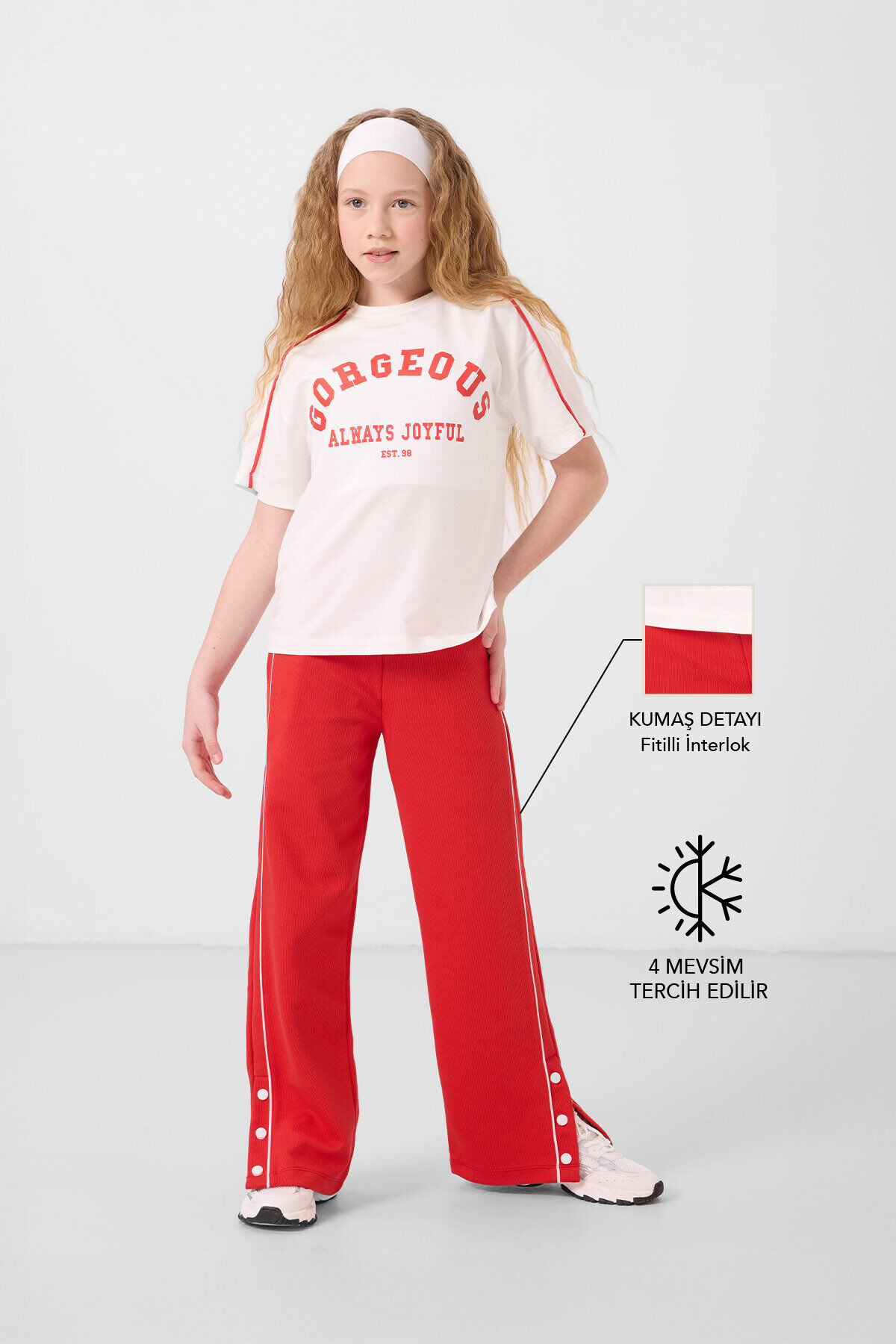 TommyLife Ekru-Fiesta O Yaka Baskılı Geniş Paça Çıt Çıt Detaylı Kız Çocuk Palazzo Eşofman Takım - 75172