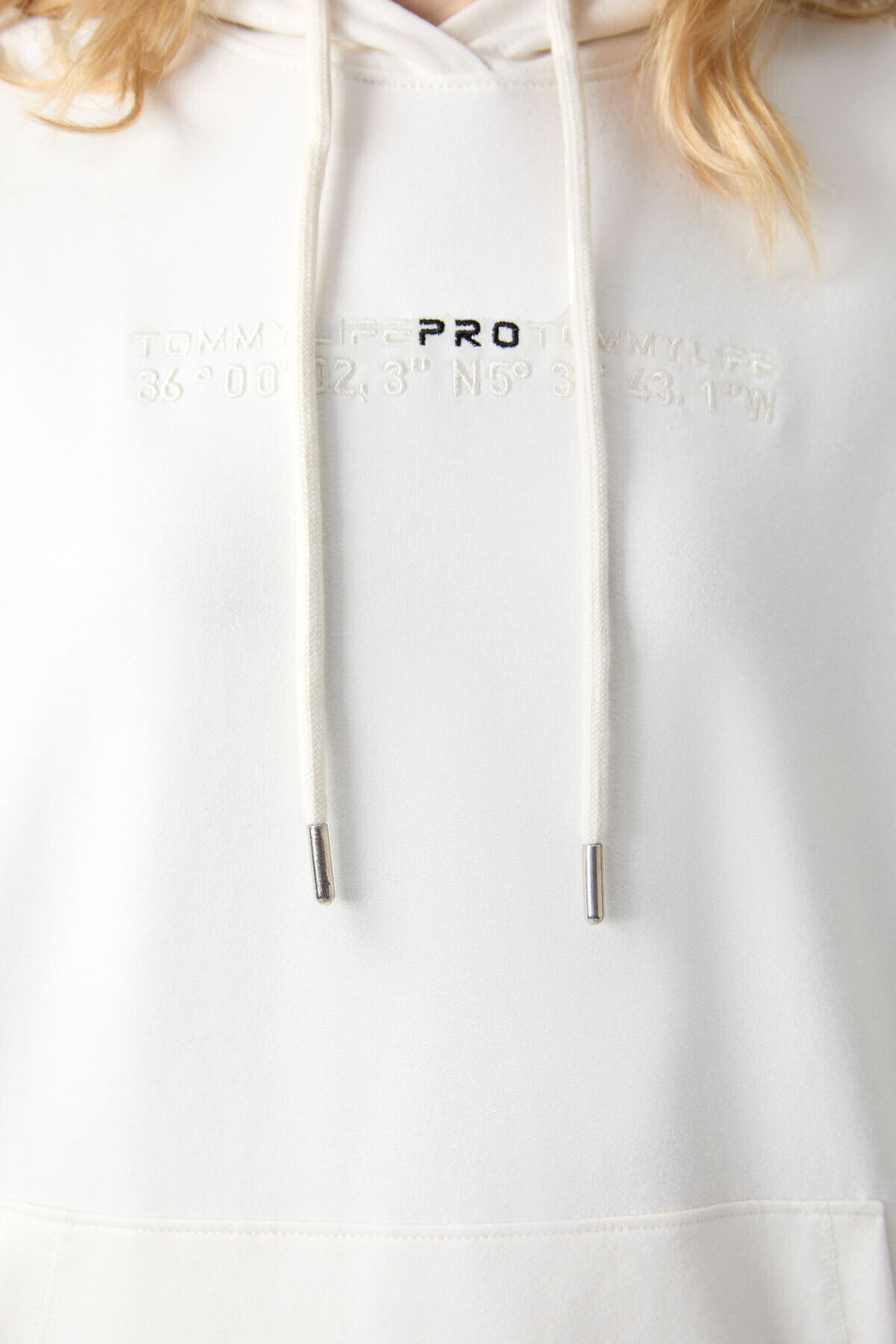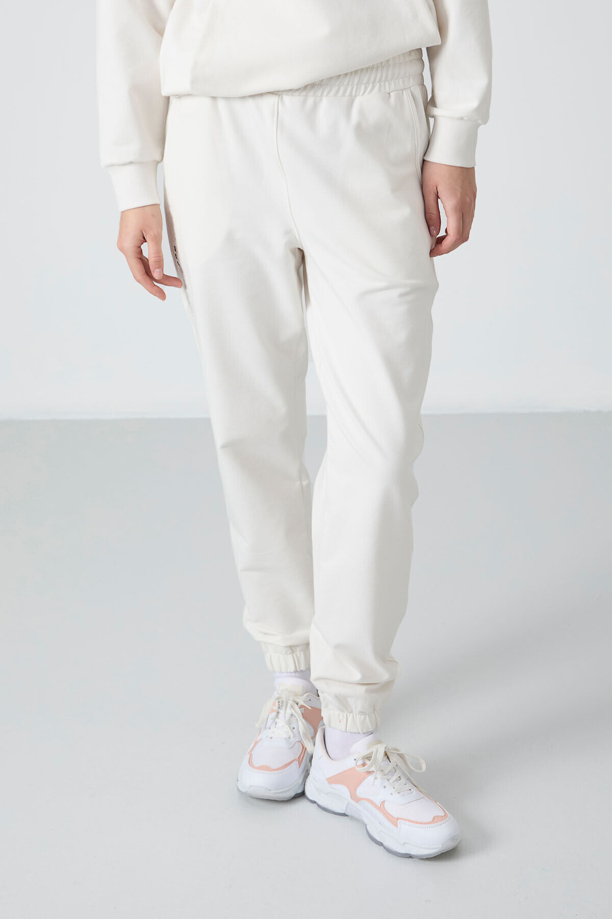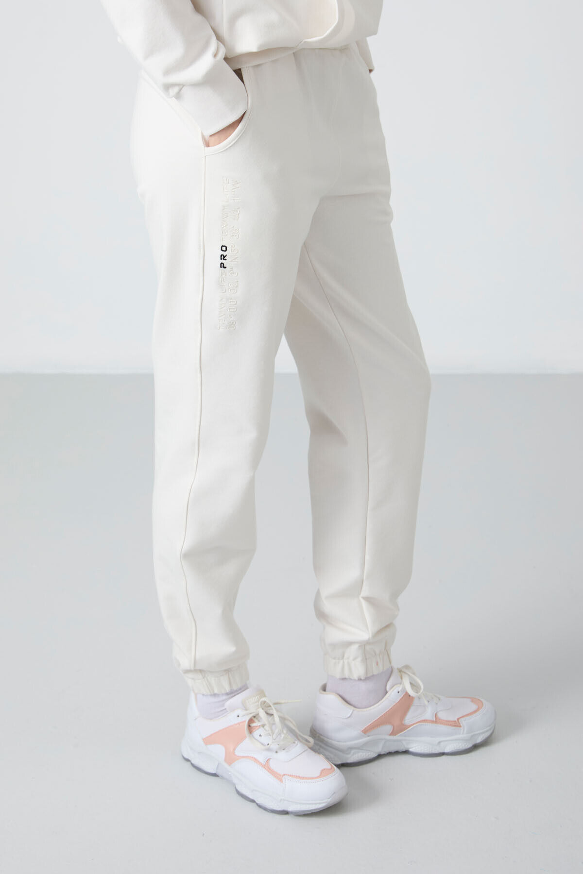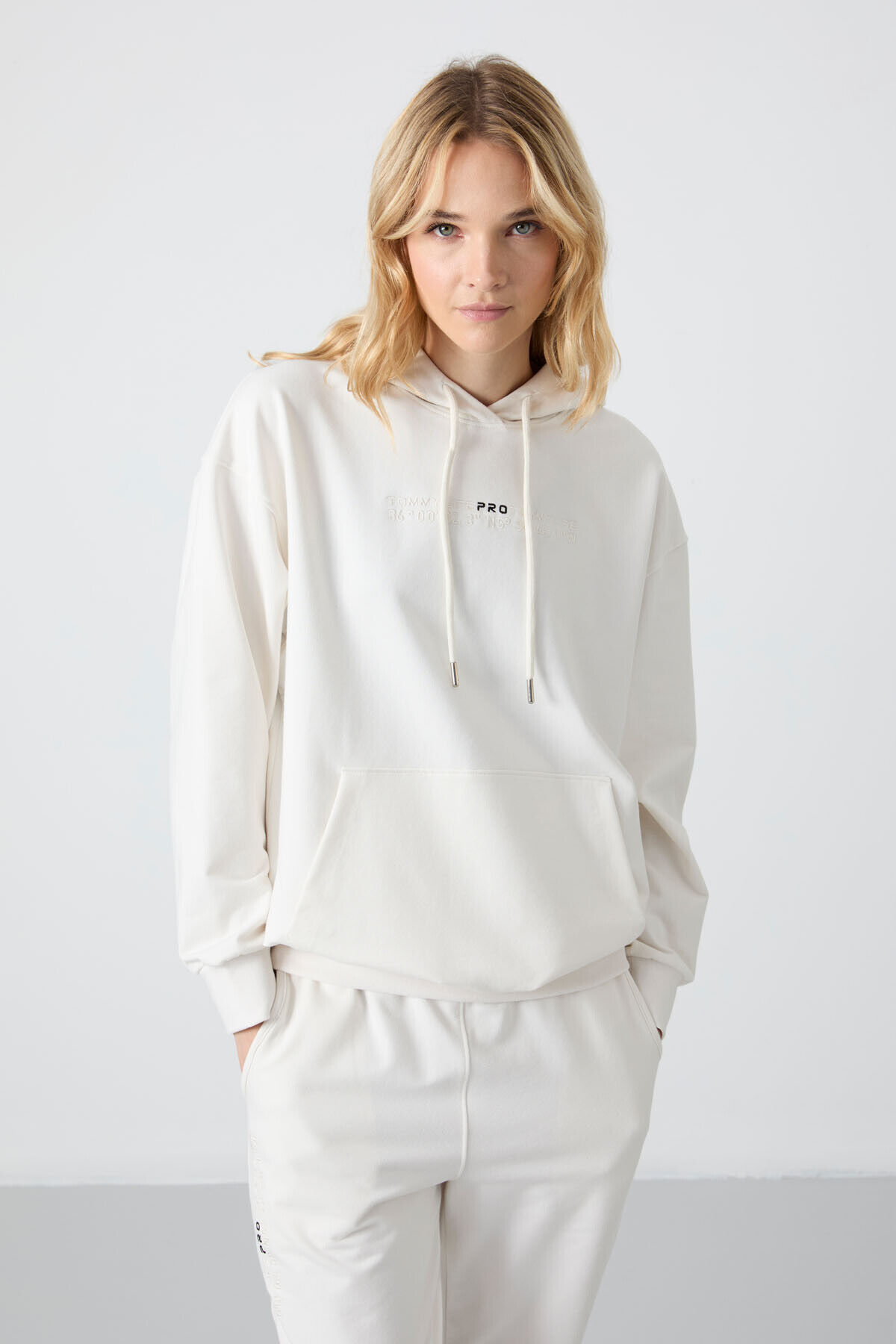 TommyLife Ekru Kapüşonlu Kanguru Cep Oversize Lastik Paça Kadın Eşofman Takımı - 95288