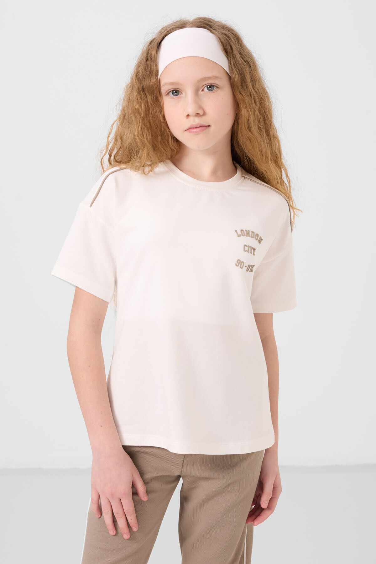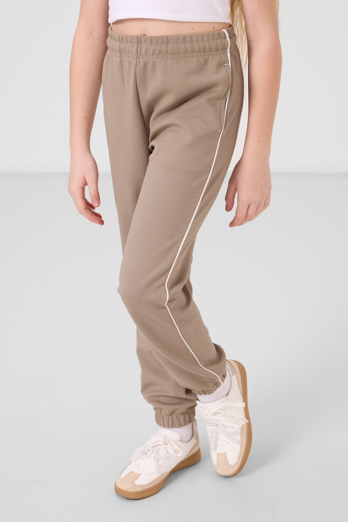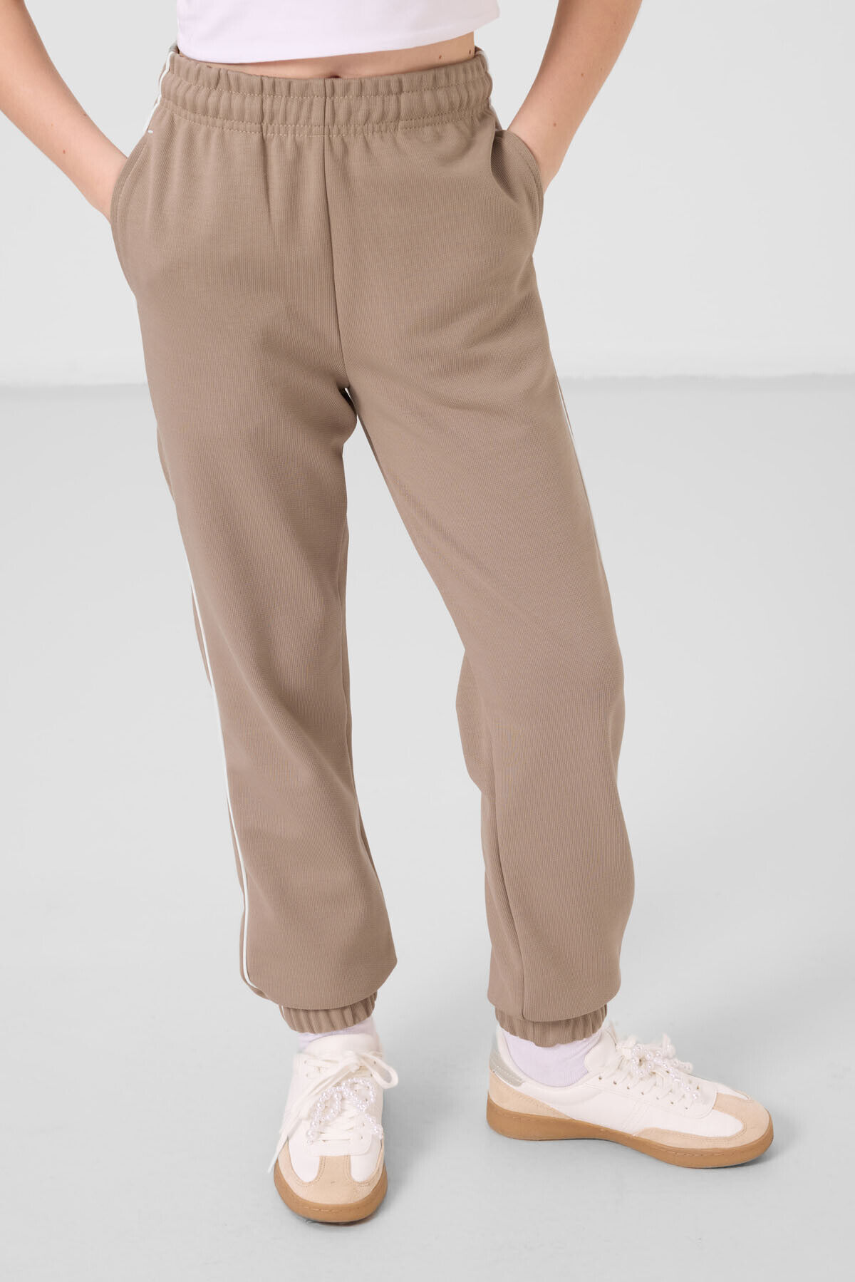 TommyLife Ekru-Koyu Bej O Yaka Baskılı Lastik Paçalı Standart Fit Kız Çocuk Eşofman Takım - 75186