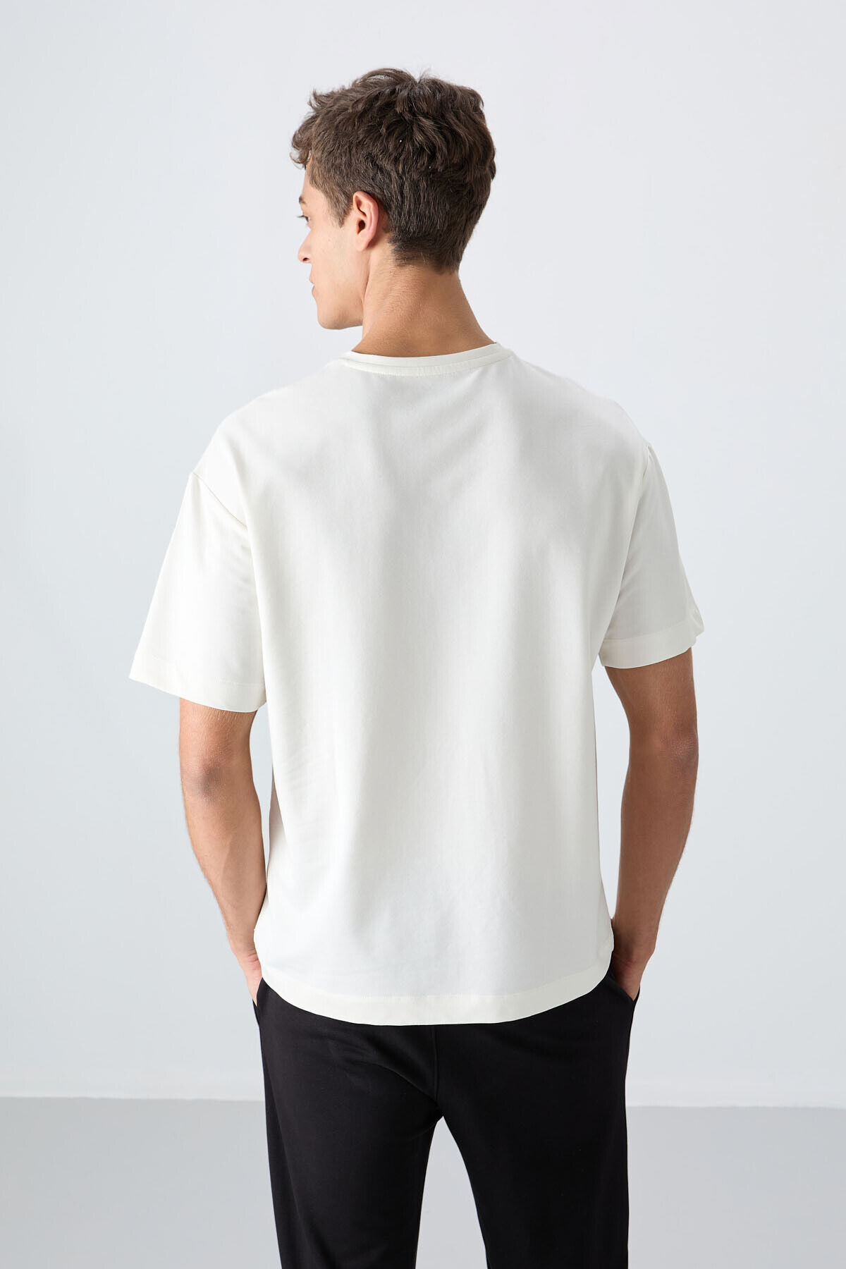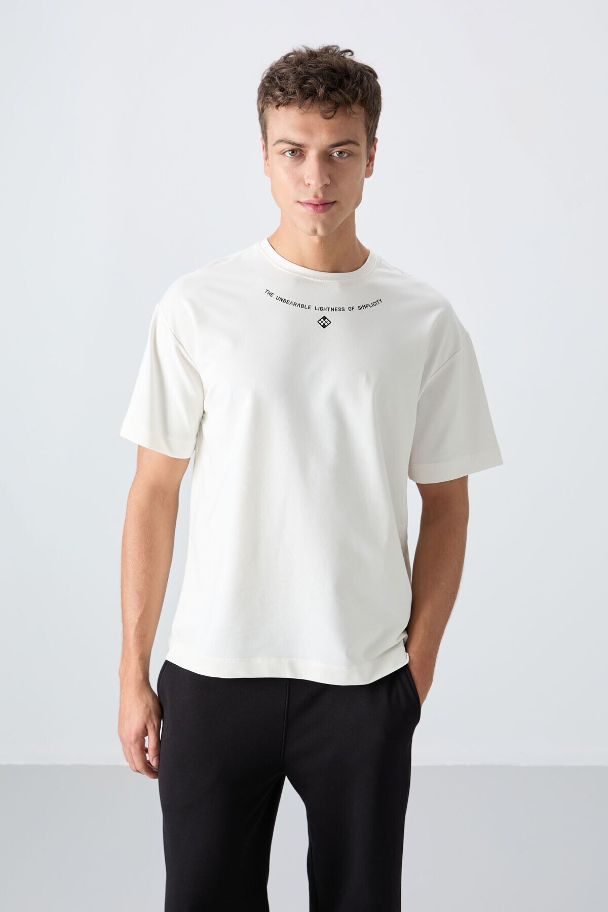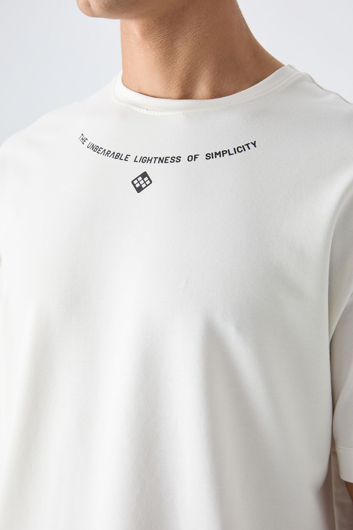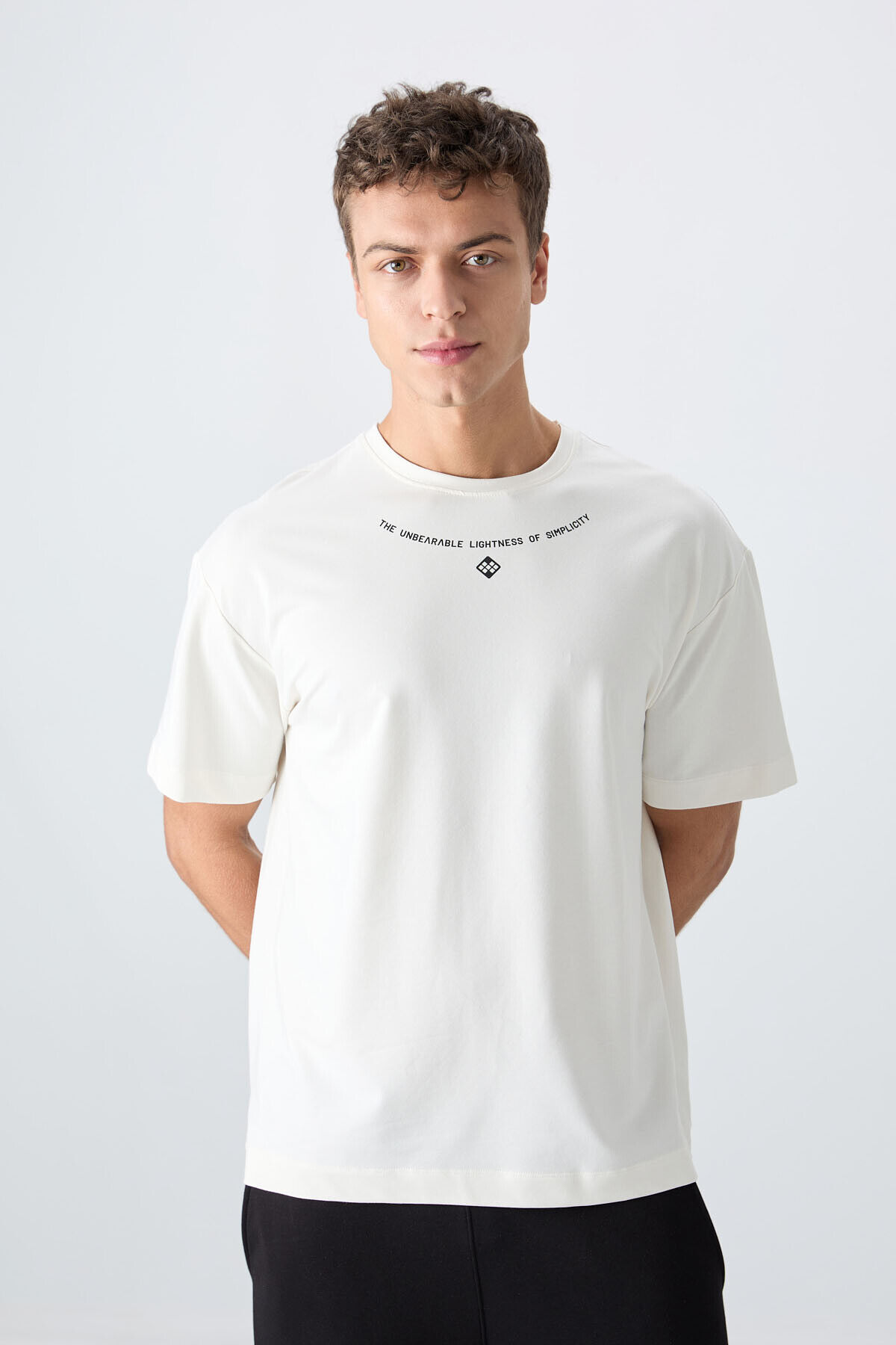 TommyLife Ekru Pamuklu Kalın Yumuşak Dokulu Oversize Fit Baskılı Erkek T-Shirt - 88343