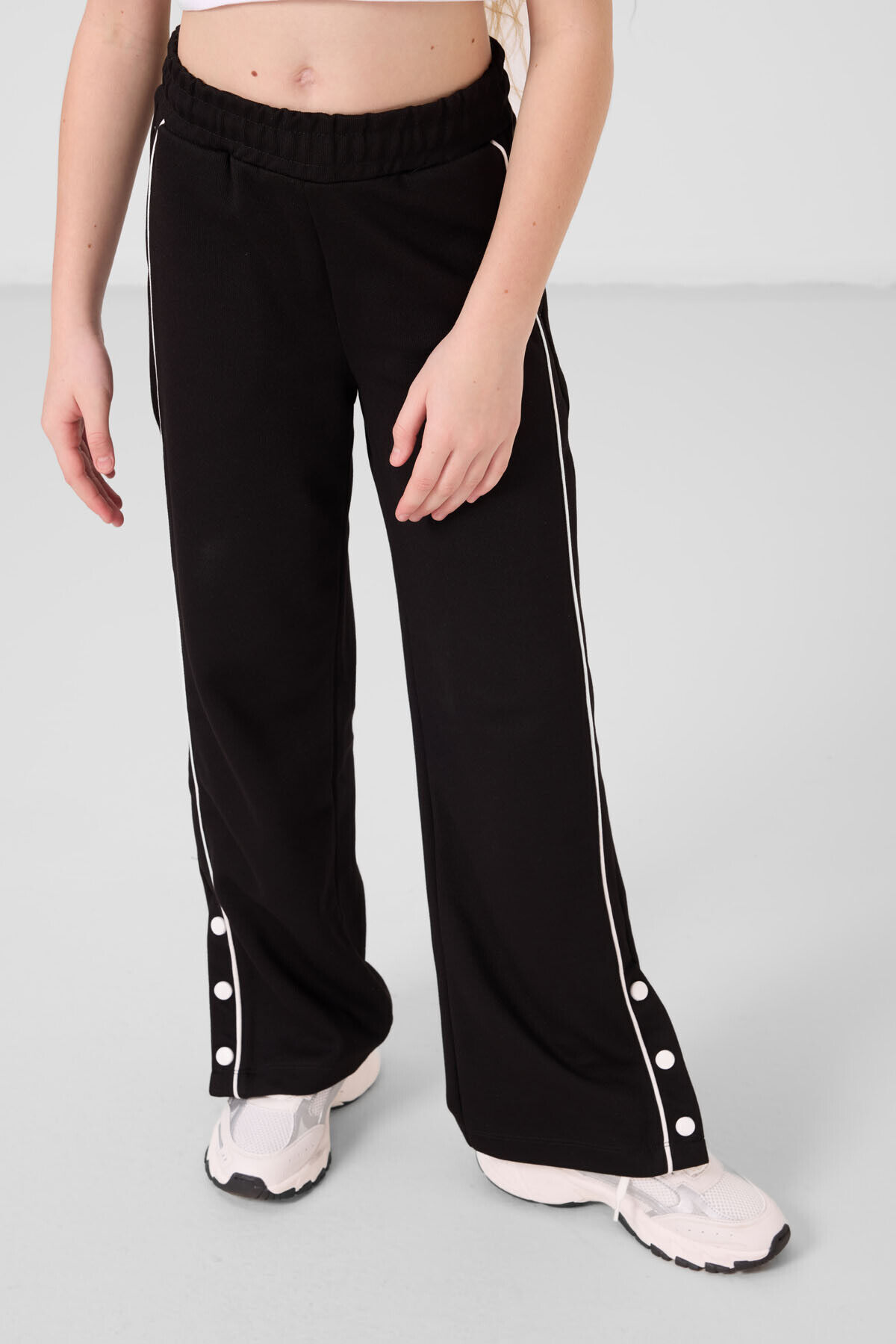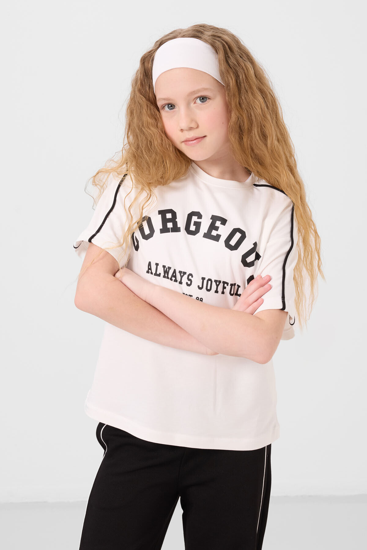TommyLife Ekru-Siyah O Yaka Baskılı Geniş Paça Çıt Çıt Detaylı Kız Çocuk Palazzo Eşofman Takım - 75172