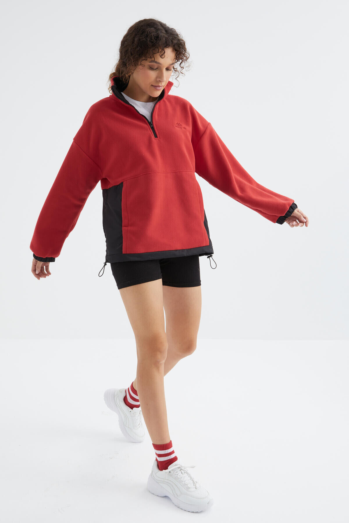 TommyLife Fiesta Yarım Fermuar Etek Ucu Büzgülü Dik Yaka Oversize Kadın Polar Sweatshirt - 97236