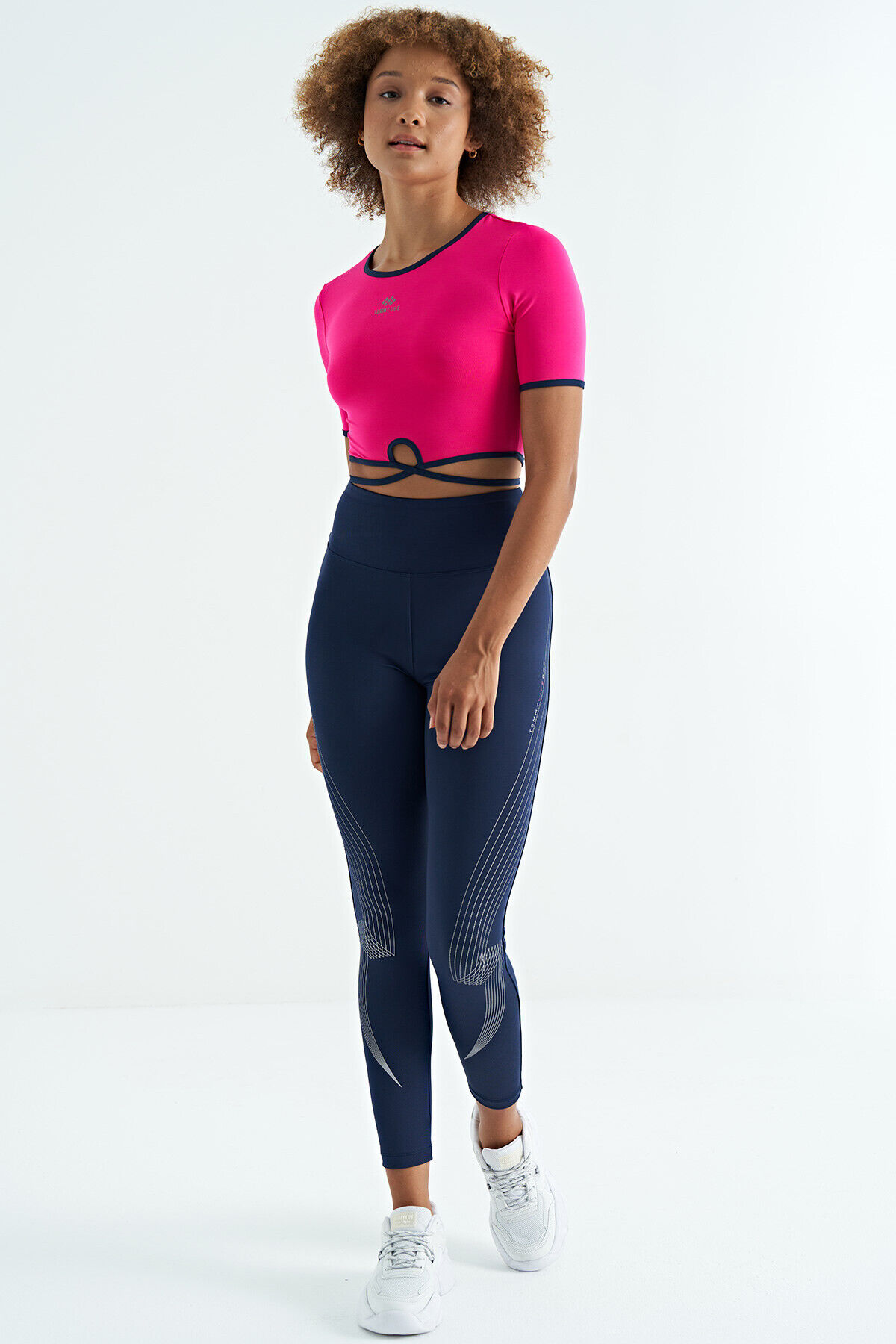 TommyLife Fuşya Bel Bağlama Detaylı O Yaka Standart Kalıp Dalgıç Kumaş Kadın Crop T-Shirt - 97266