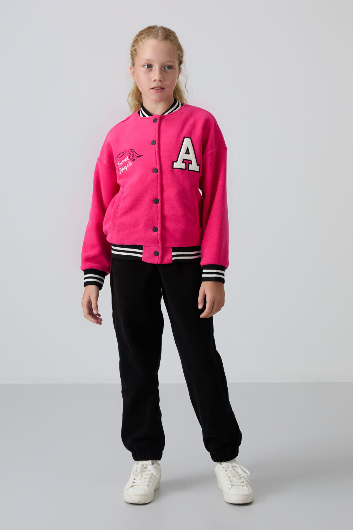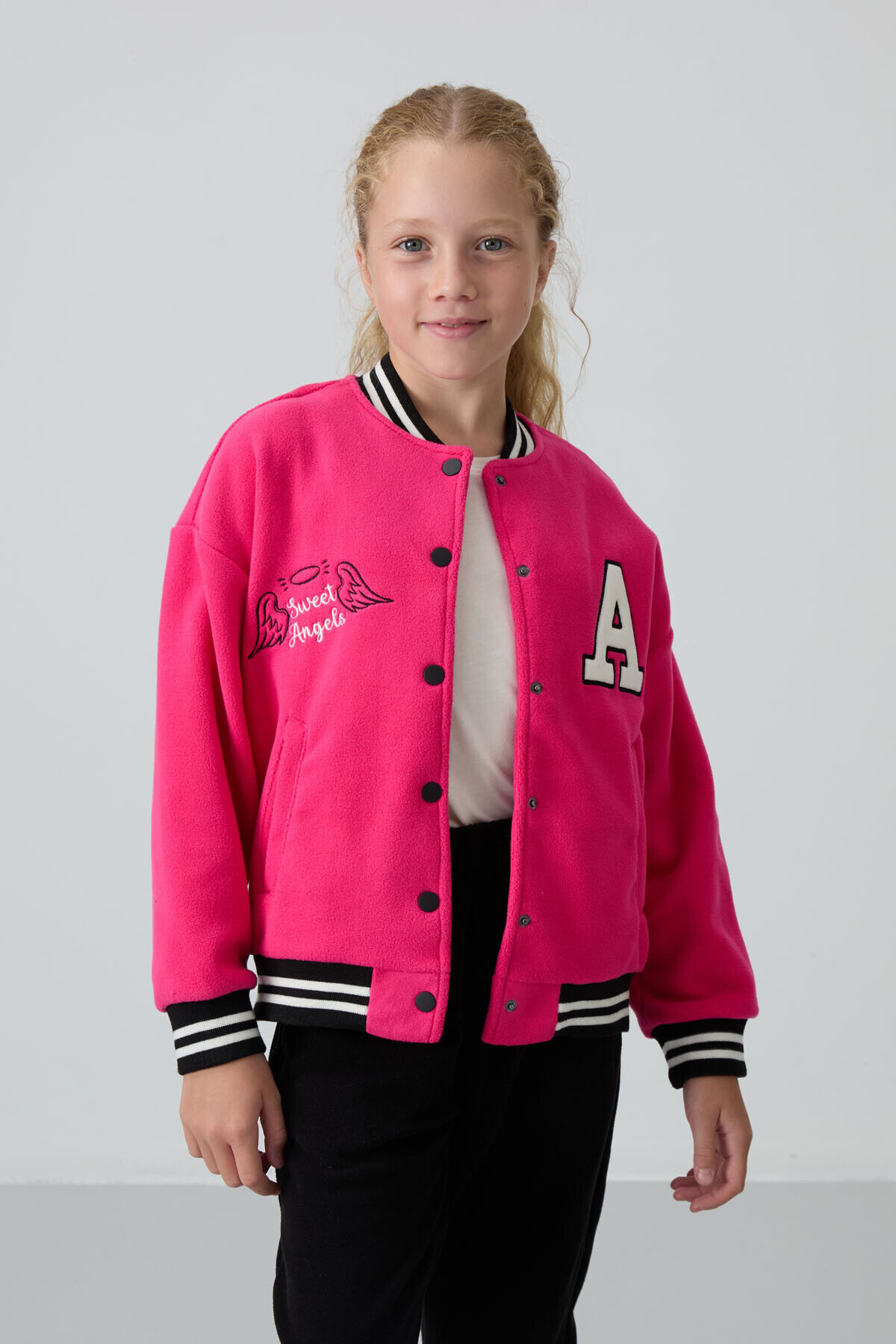 Fuşya Kalın Yumuşak Dokulu Standart Fit Nakışlı Polar Kız Çocuk Kolej Ceket - 75156