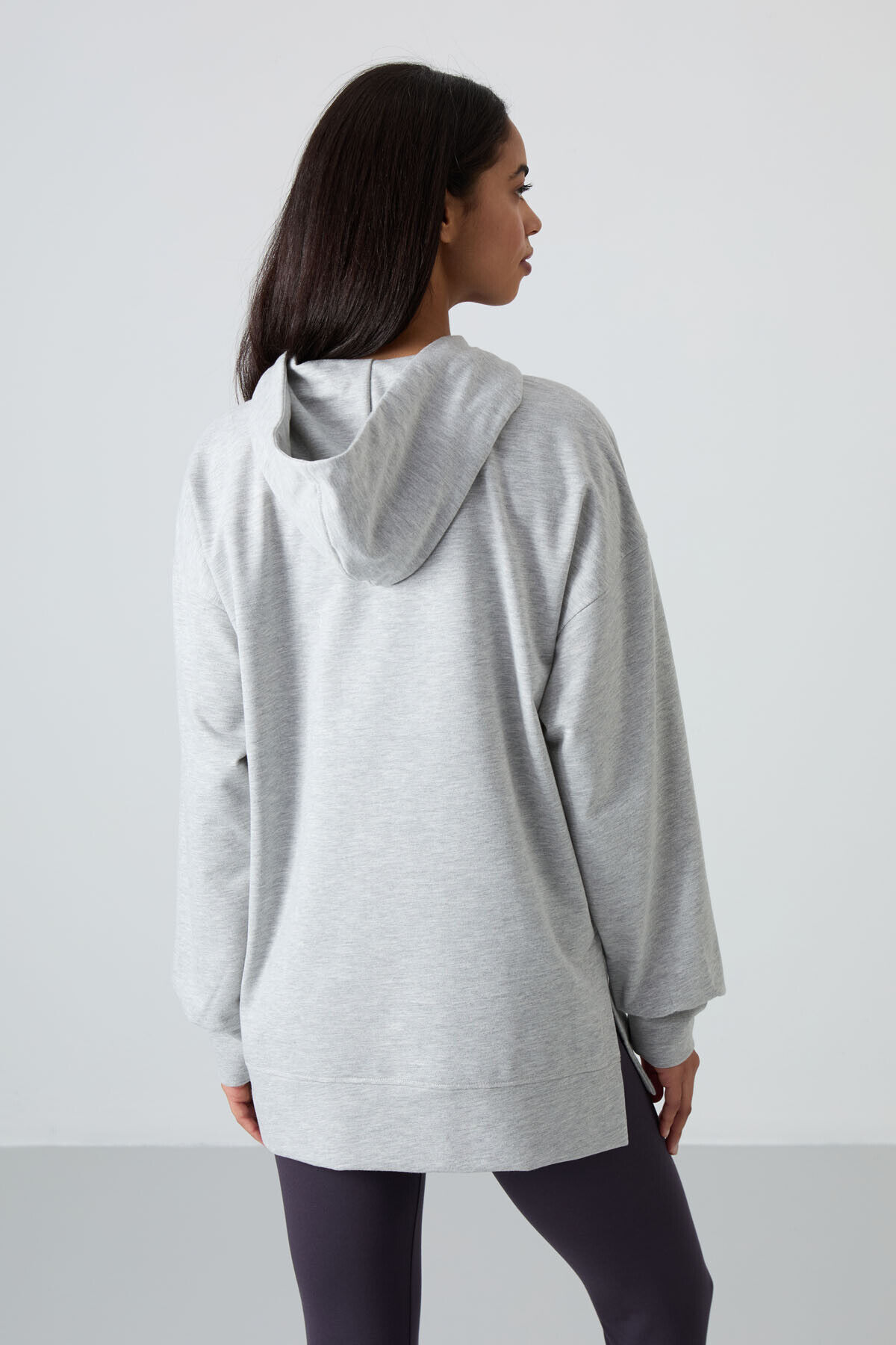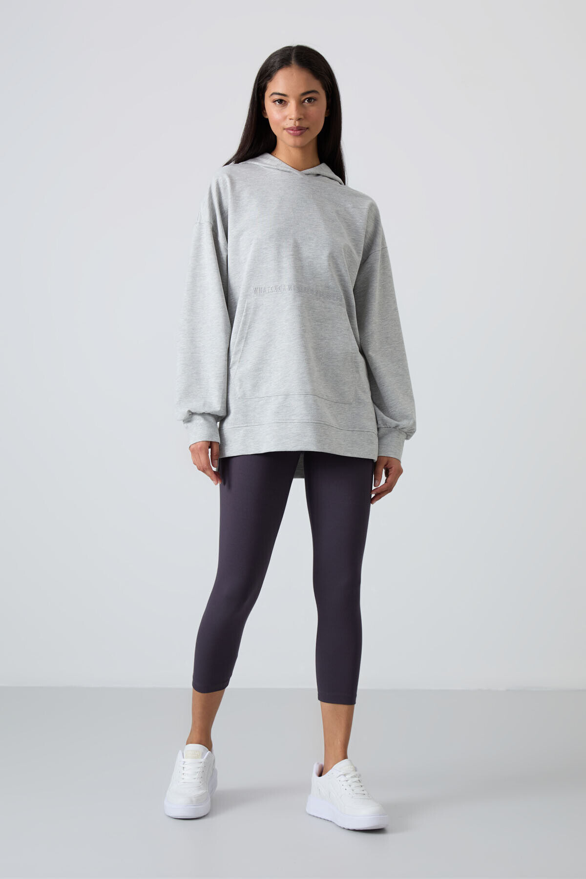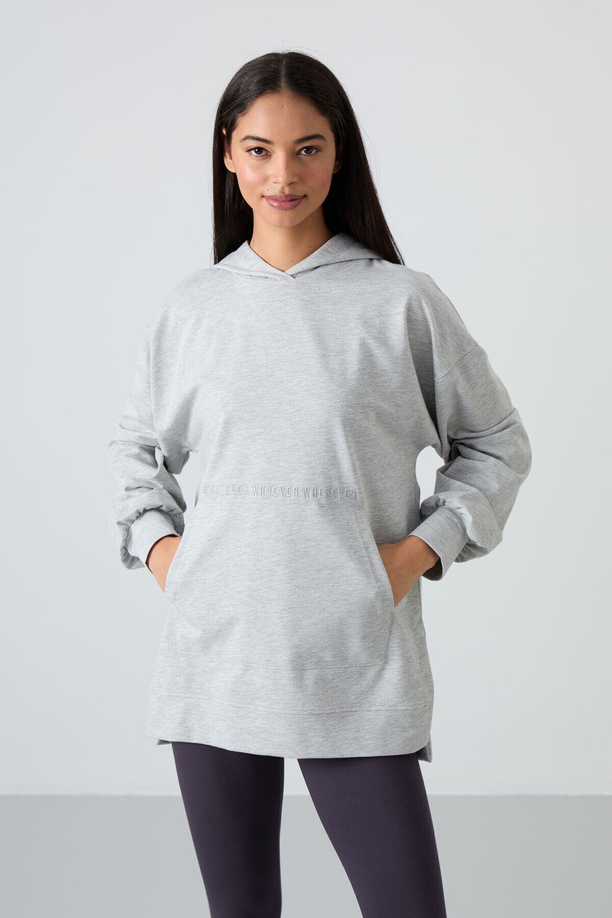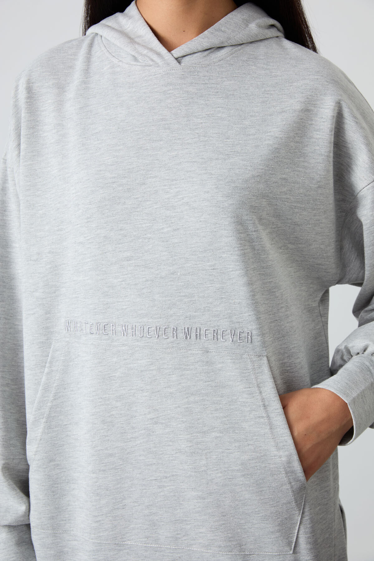 TommyLife Gri Melanj Balon Kol Yazı Nakışlı Kadın Oversize Tunik Sweatshirt - 97163