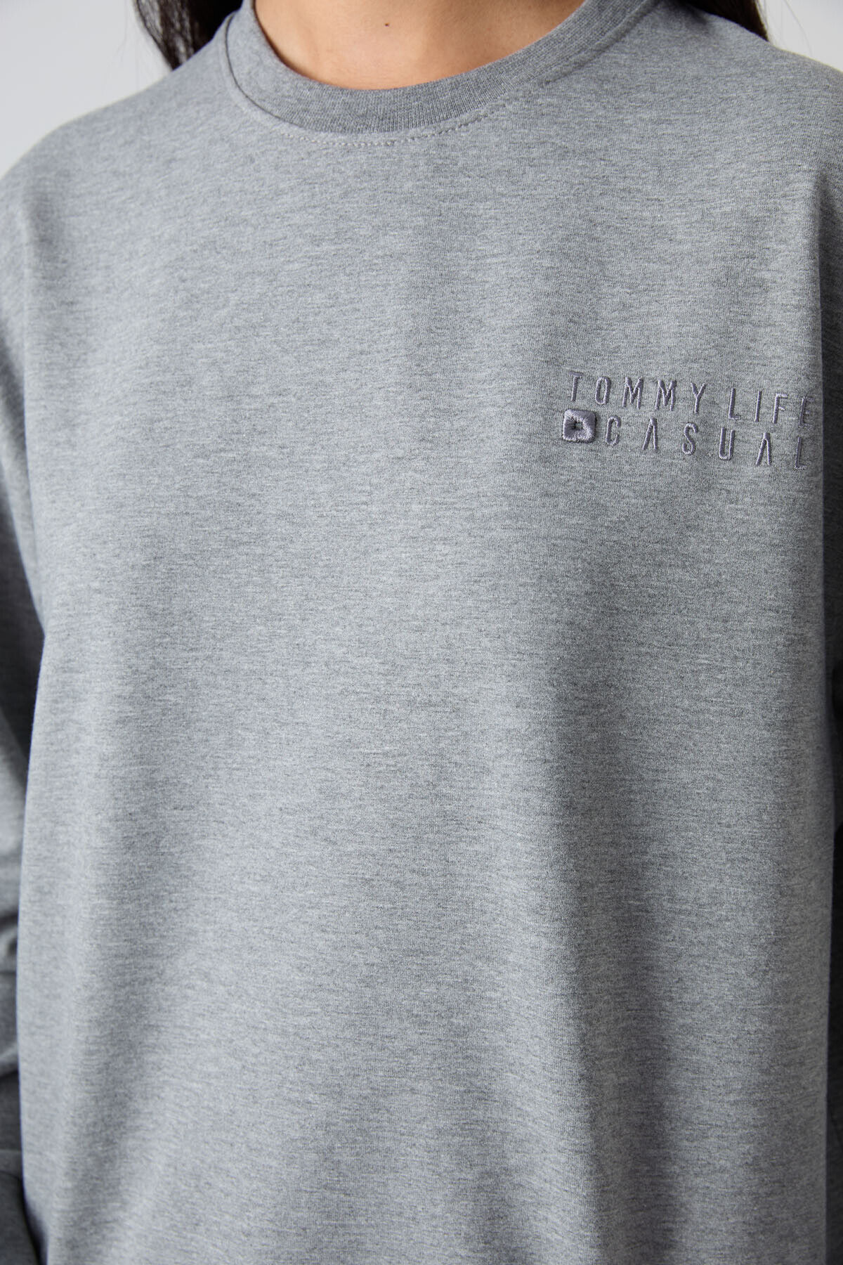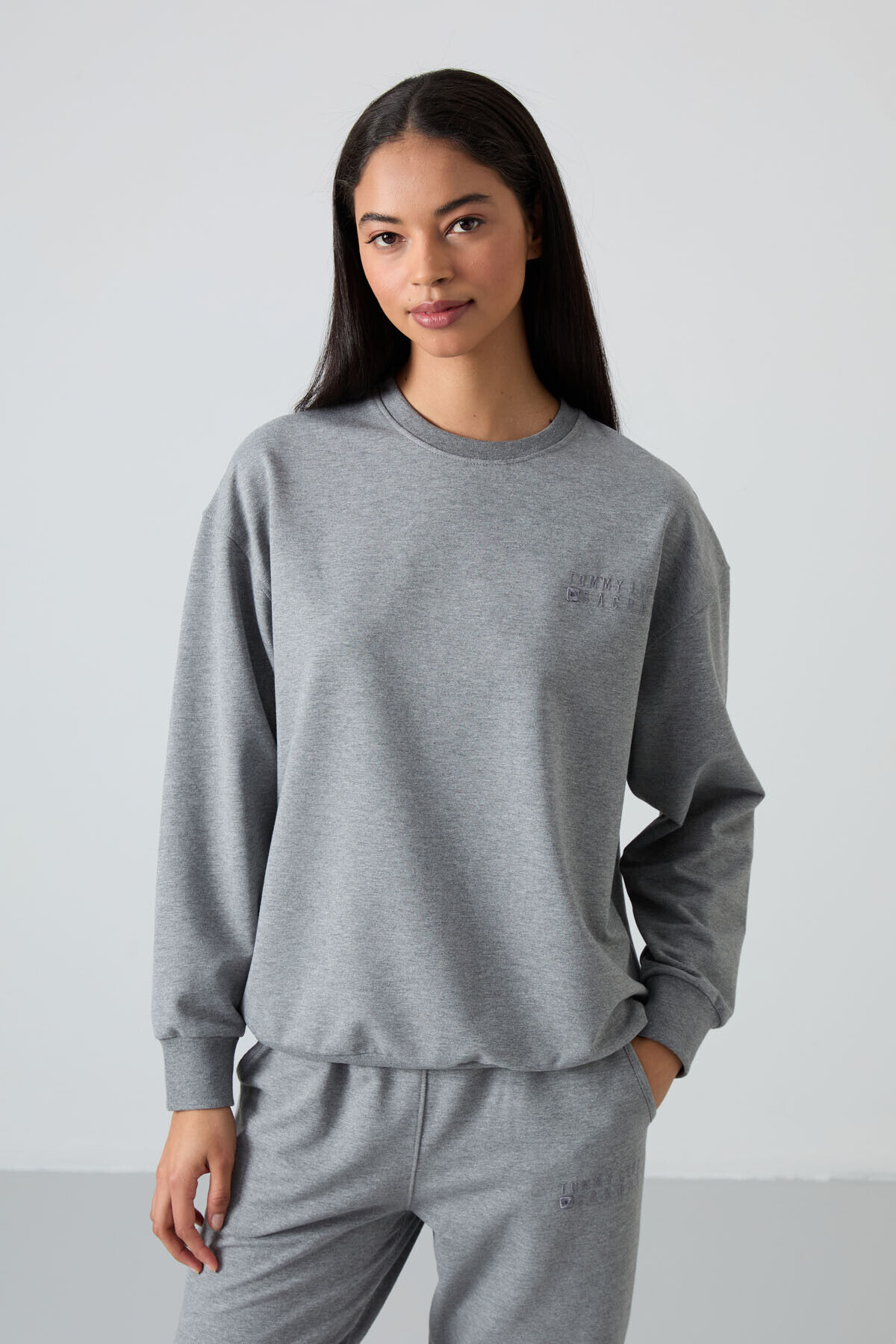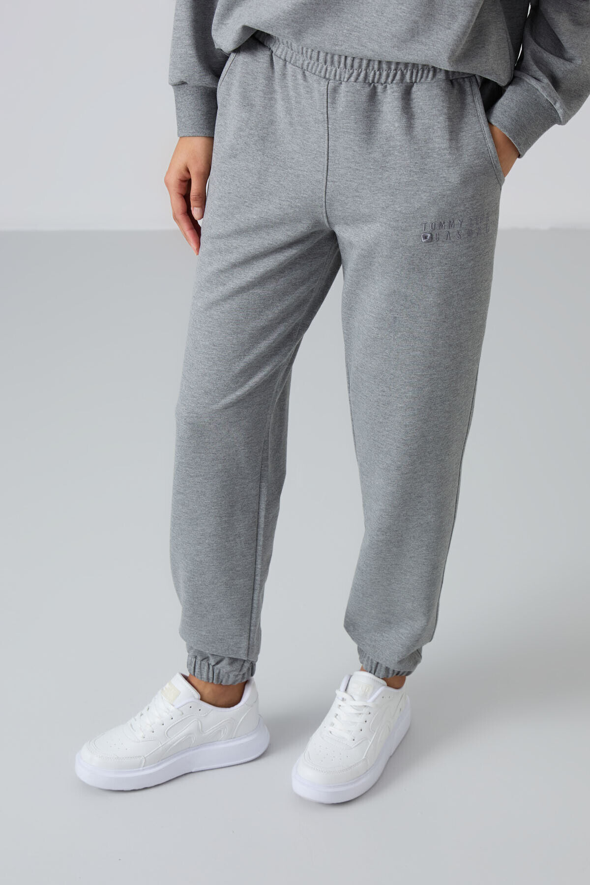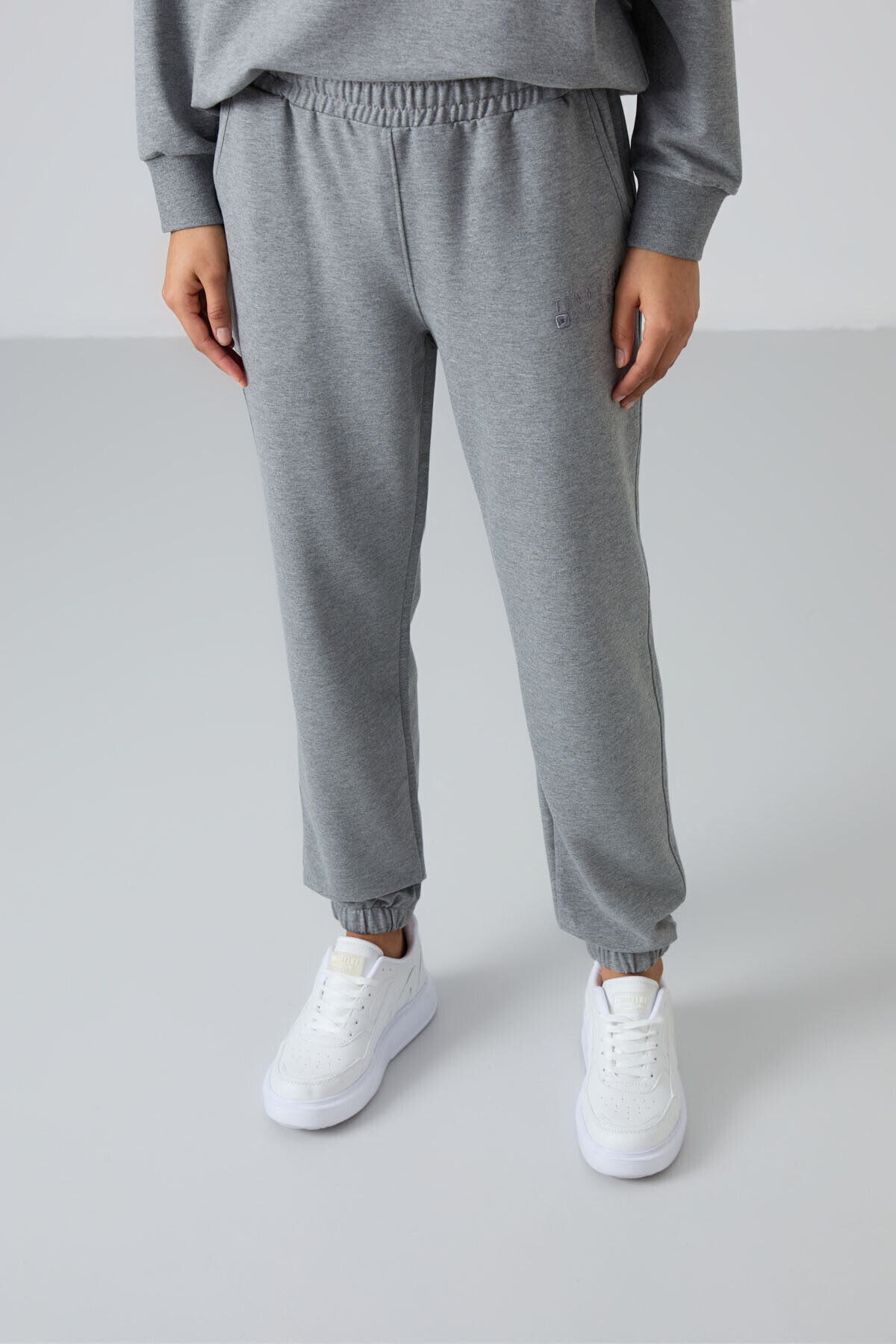TommyLife Gri Melanj Basic Pamuklu O Yaka Oversize Lastik Paça Kadın Eşofman Takım - 95287