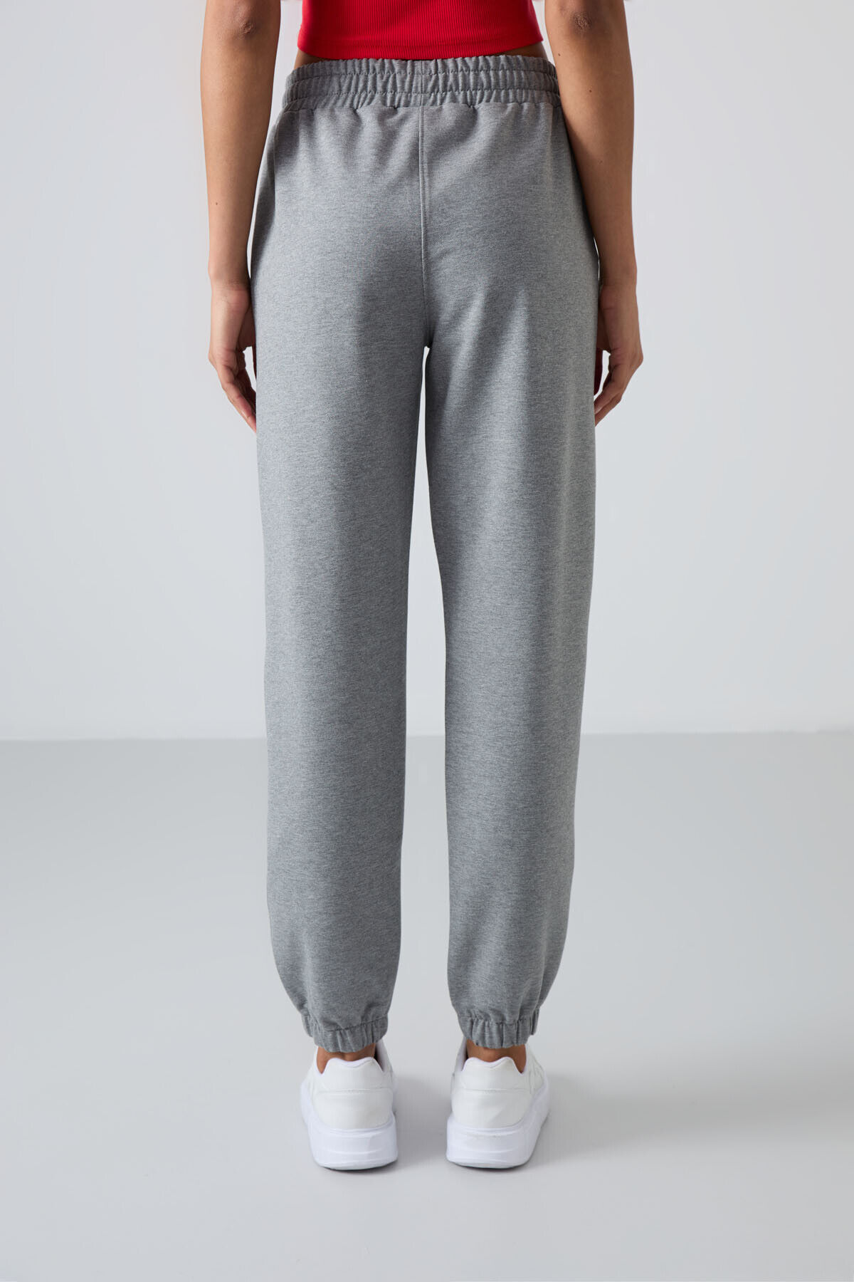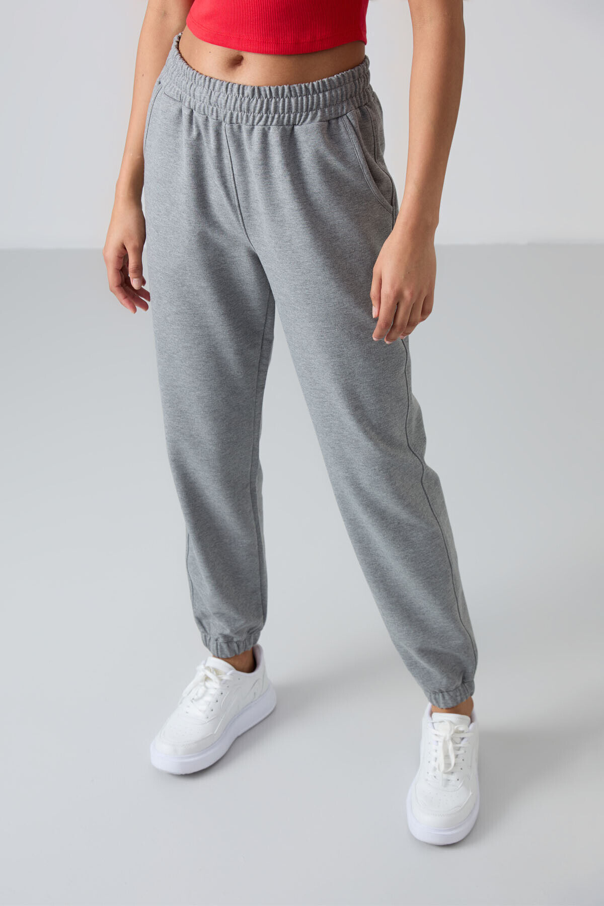 TommyLife Gri Melanj Cepli Yüksek Bel Rahat Form Lastik Paça Kadın Eşofman Alt - 94583