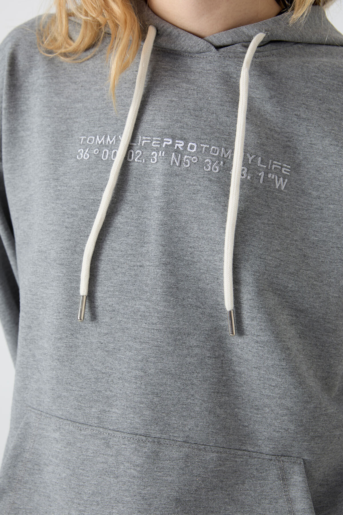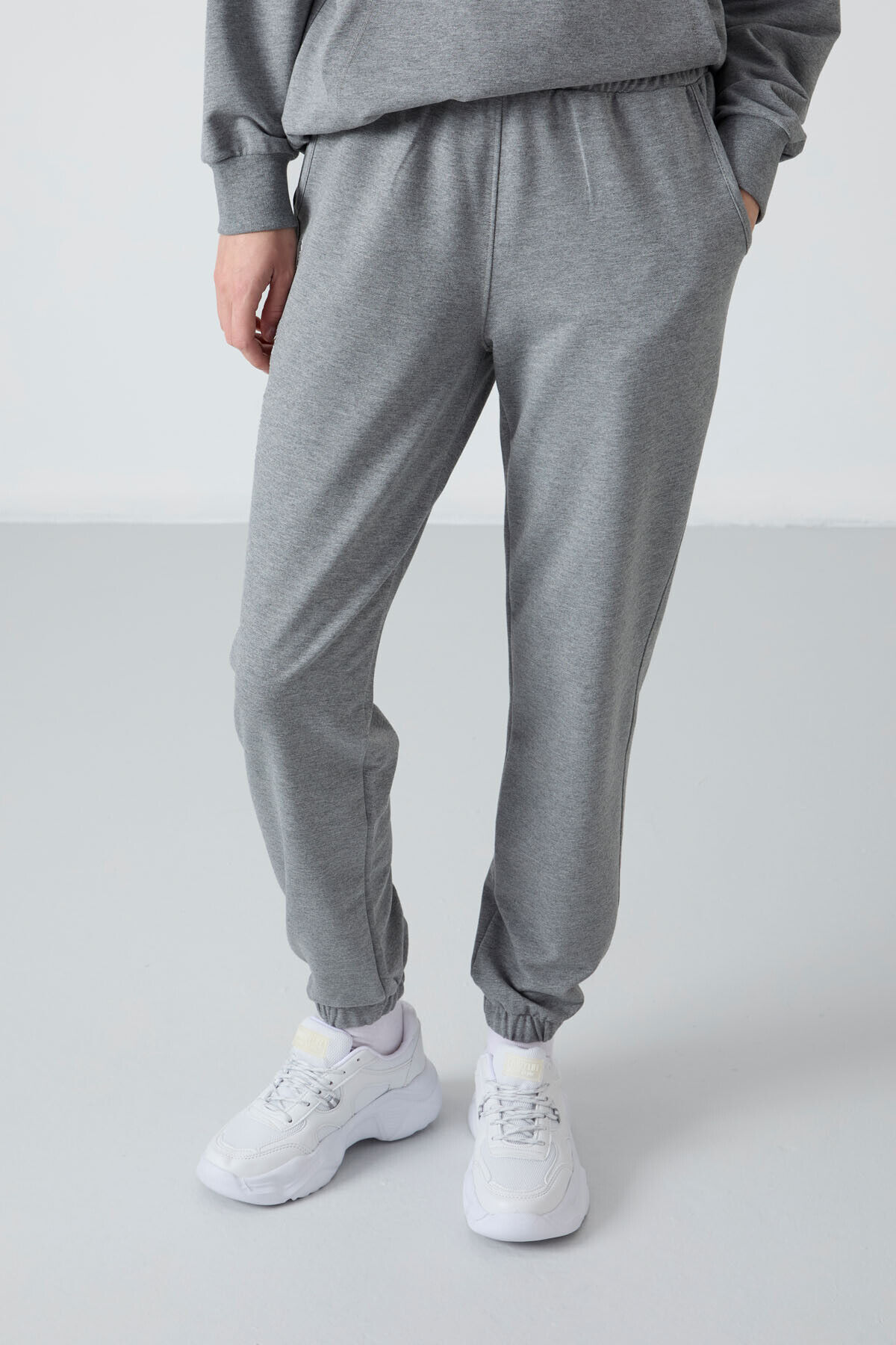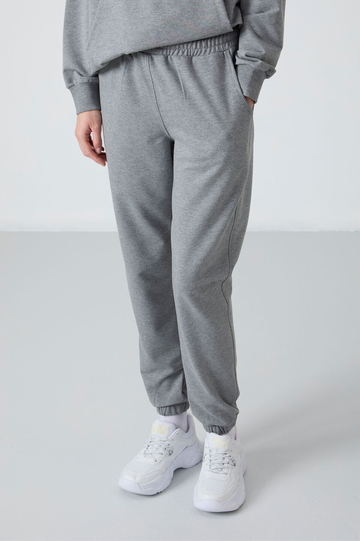 TommyLife Gri Melanj Kapüşonlu Kanguru Cep Oversize Lastik Paça Kadın Eşofman Takımı - 95288