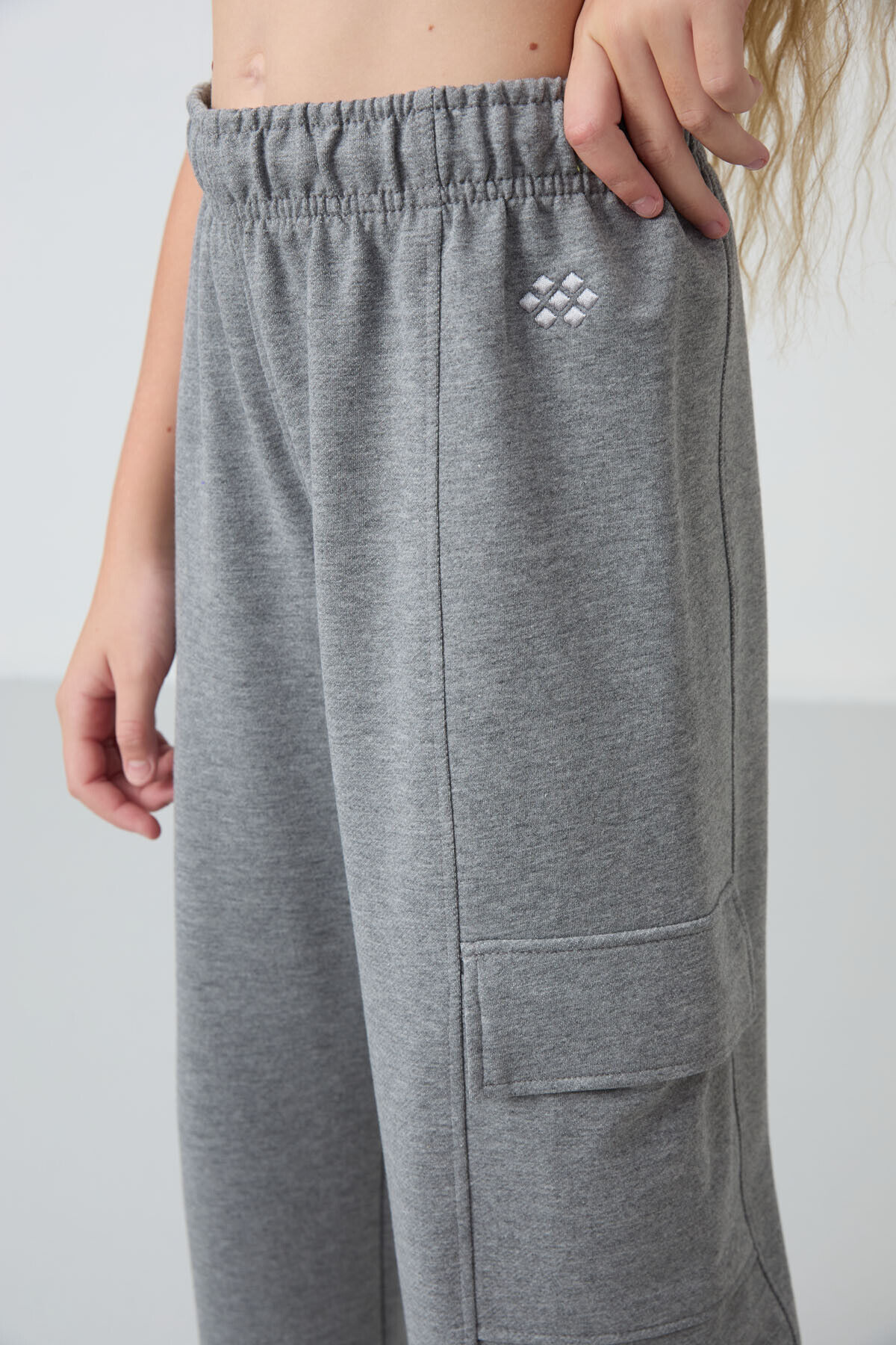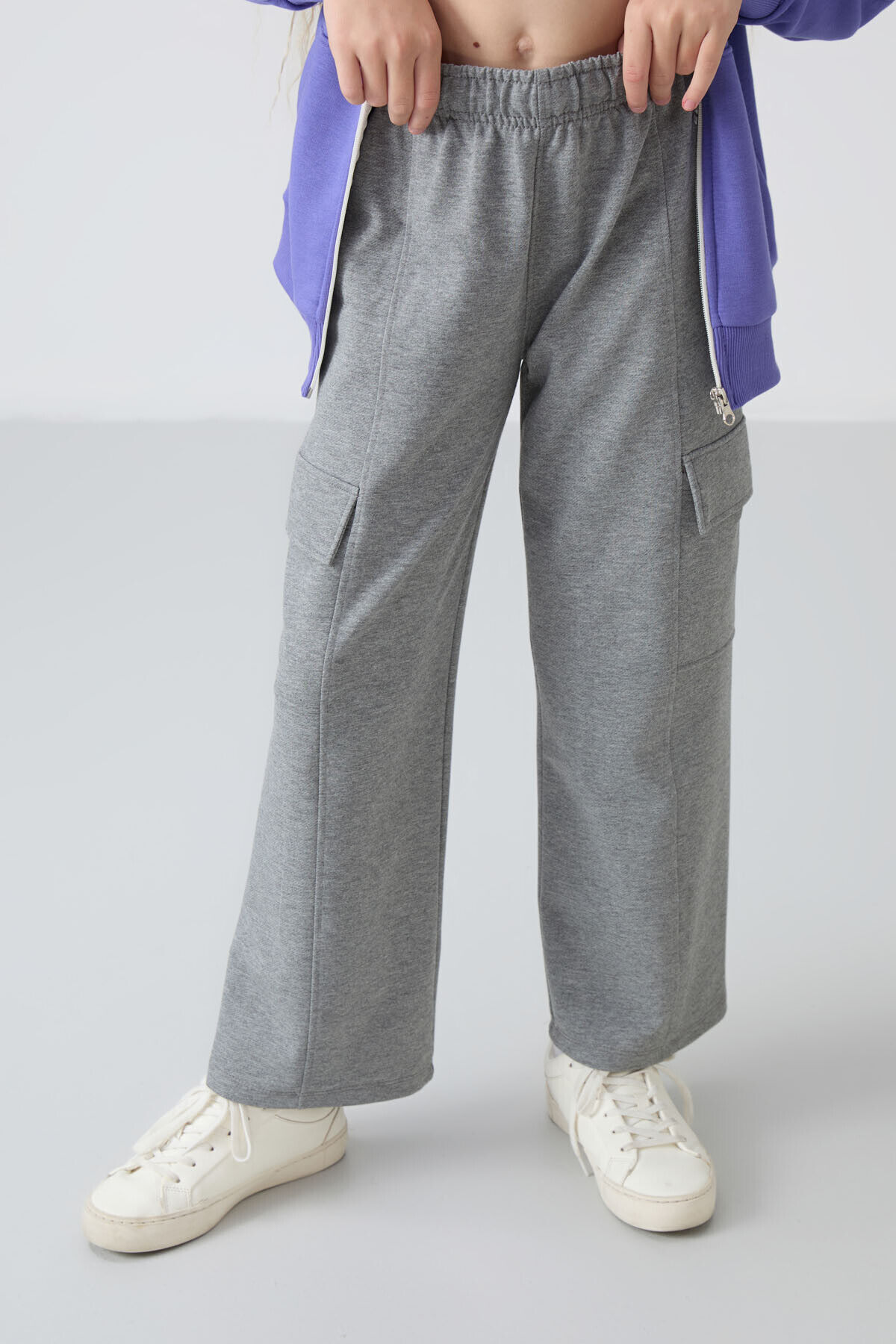 TommyLife Gri Melanj Kargo Cepli Ön Dikiş Detaylı Geniş Paça Kız Çocuk Eşofman Altı - 75143