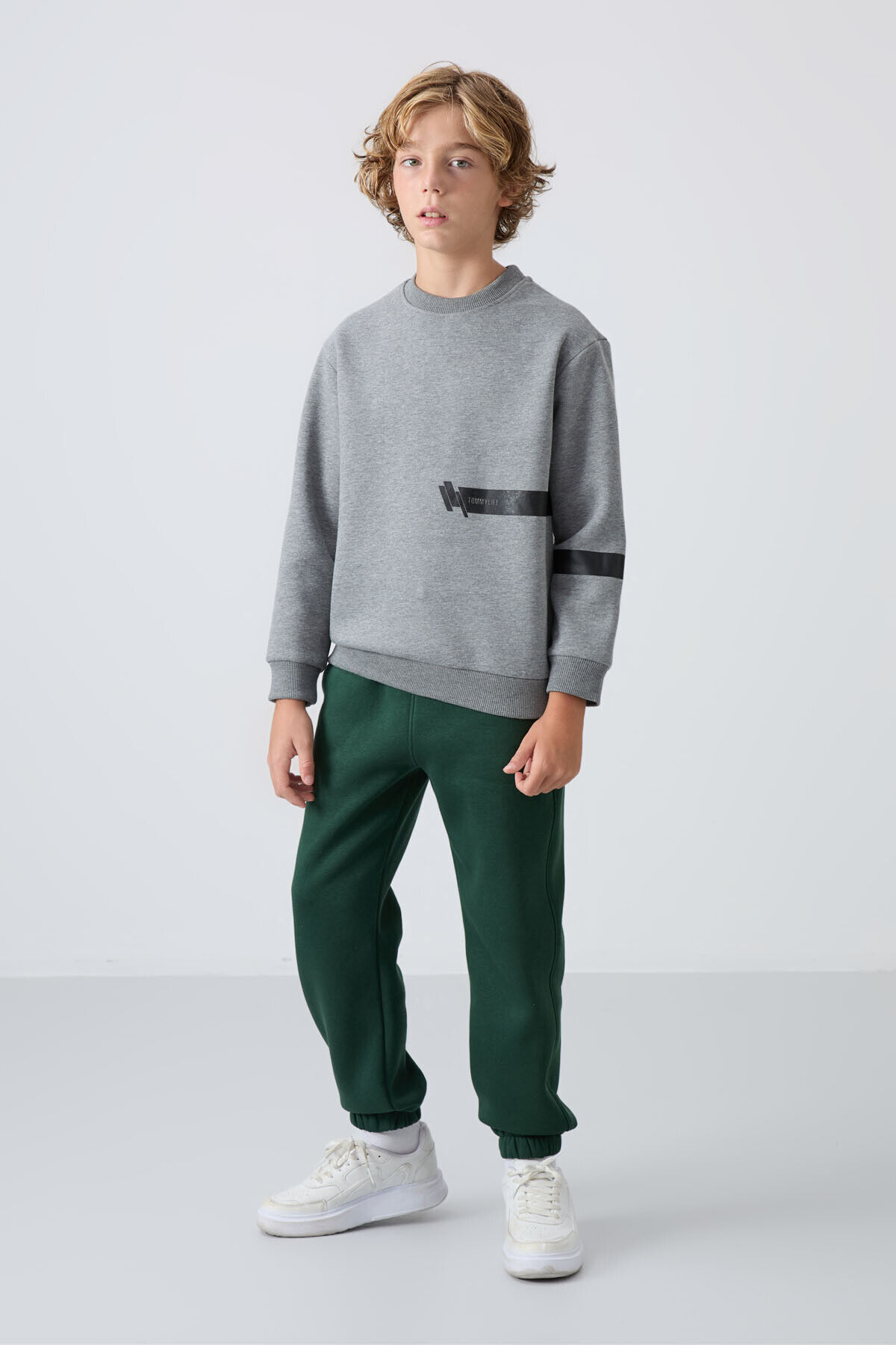 TommyLife Gri Melanj Pamuklu Kalın İçi Tüylü Standart Fit Baskılı Erkek Çocuk Sweatshirt - 11238