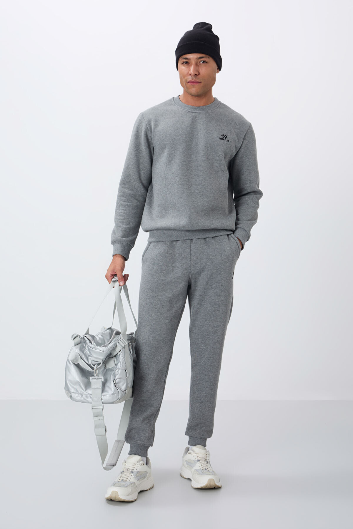 TommyLife Gri Melanj Pamuklu Kalın İçi Tüylü Yumuşak Dokulu Comfort Fit Nakışlı Erkek Eşofman Takım -85265