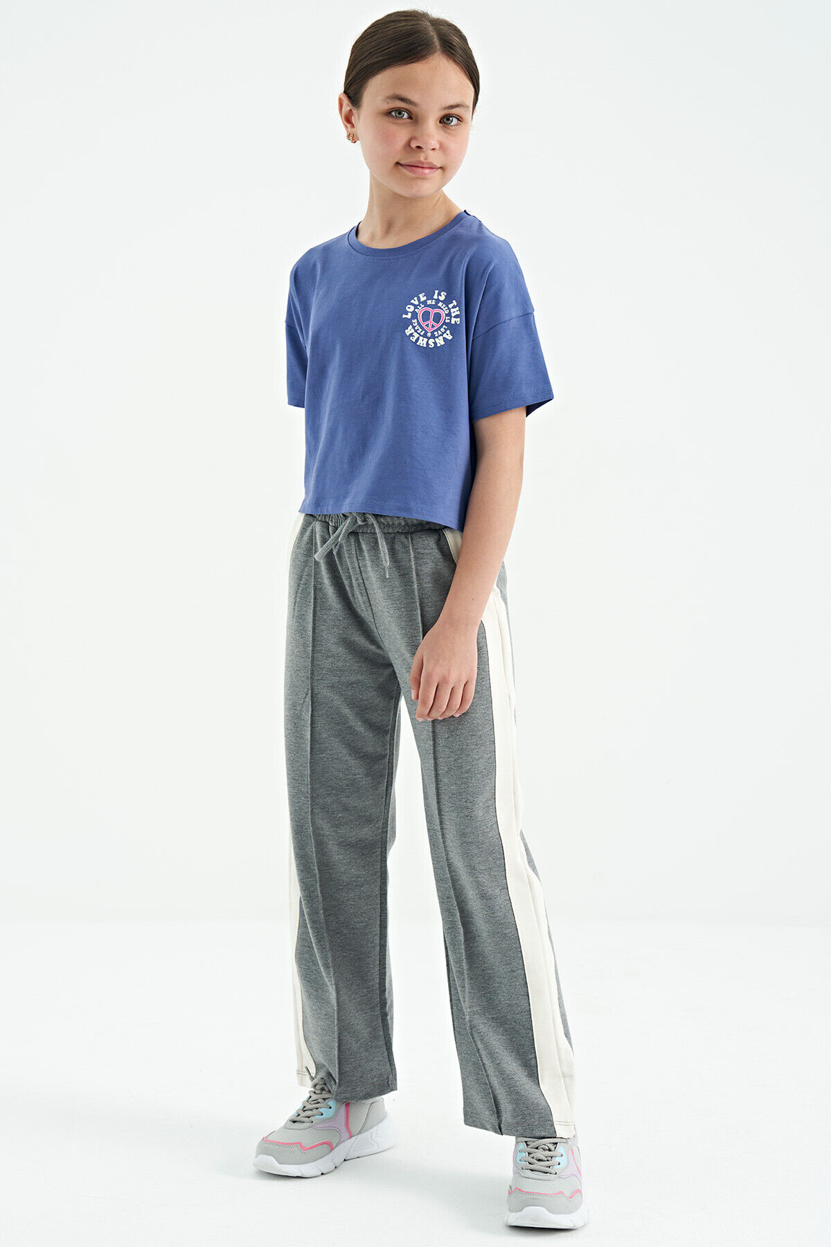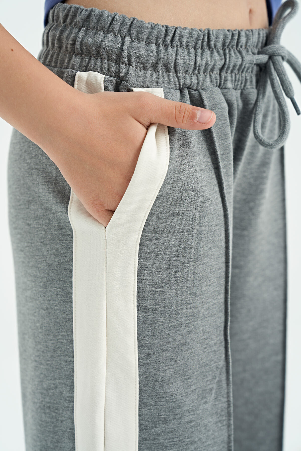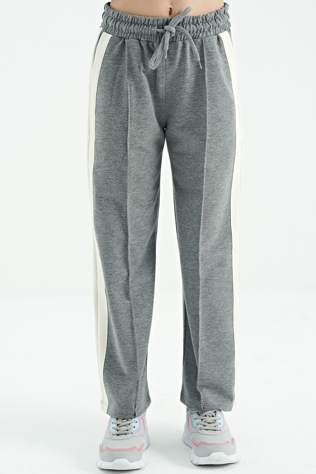 TommyLife Gri Melanj Yan Bant Detaylı Bağcıklı Rahat Kalıp Geniş Paça Kız Çocuk Eşofman Alt - 75119