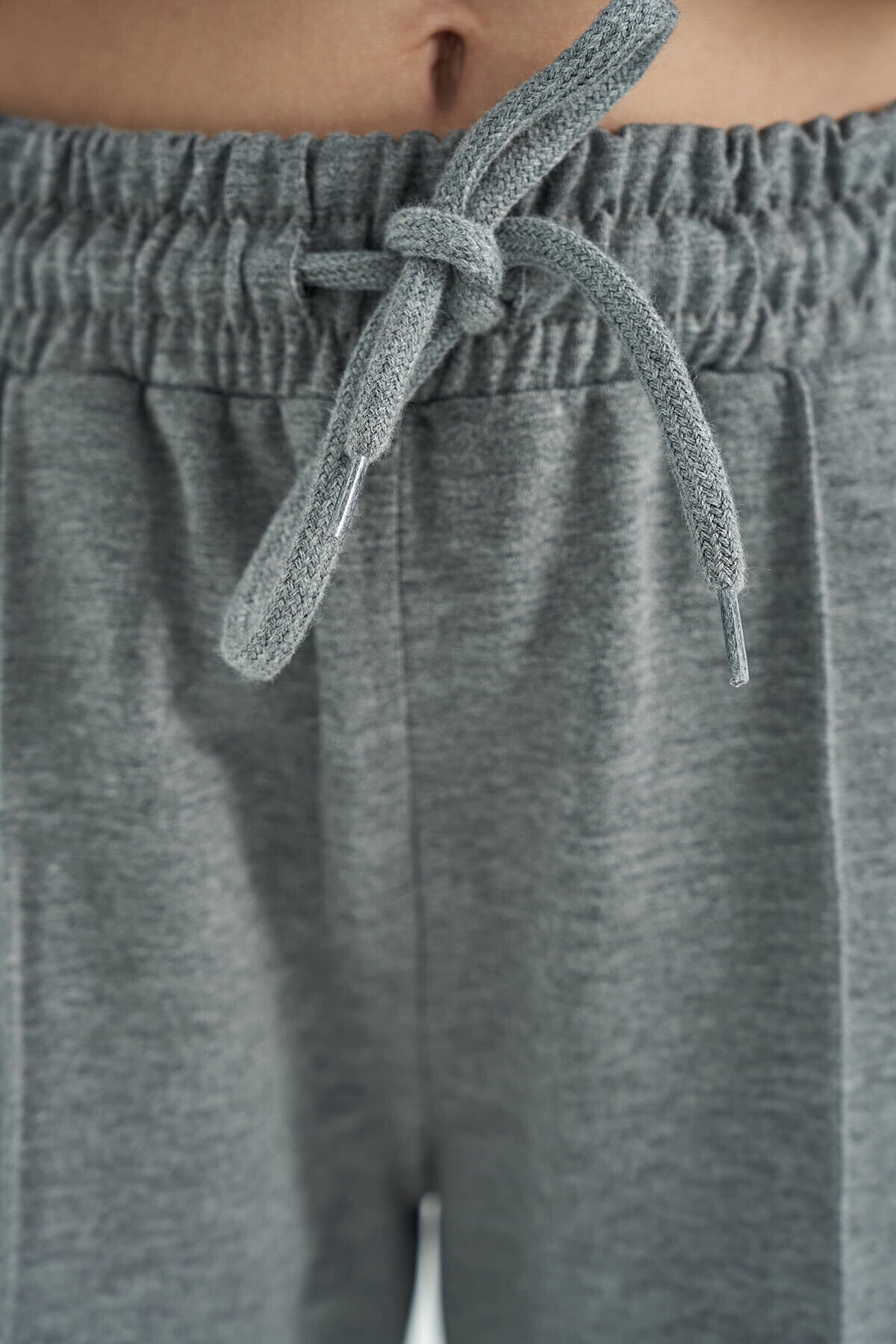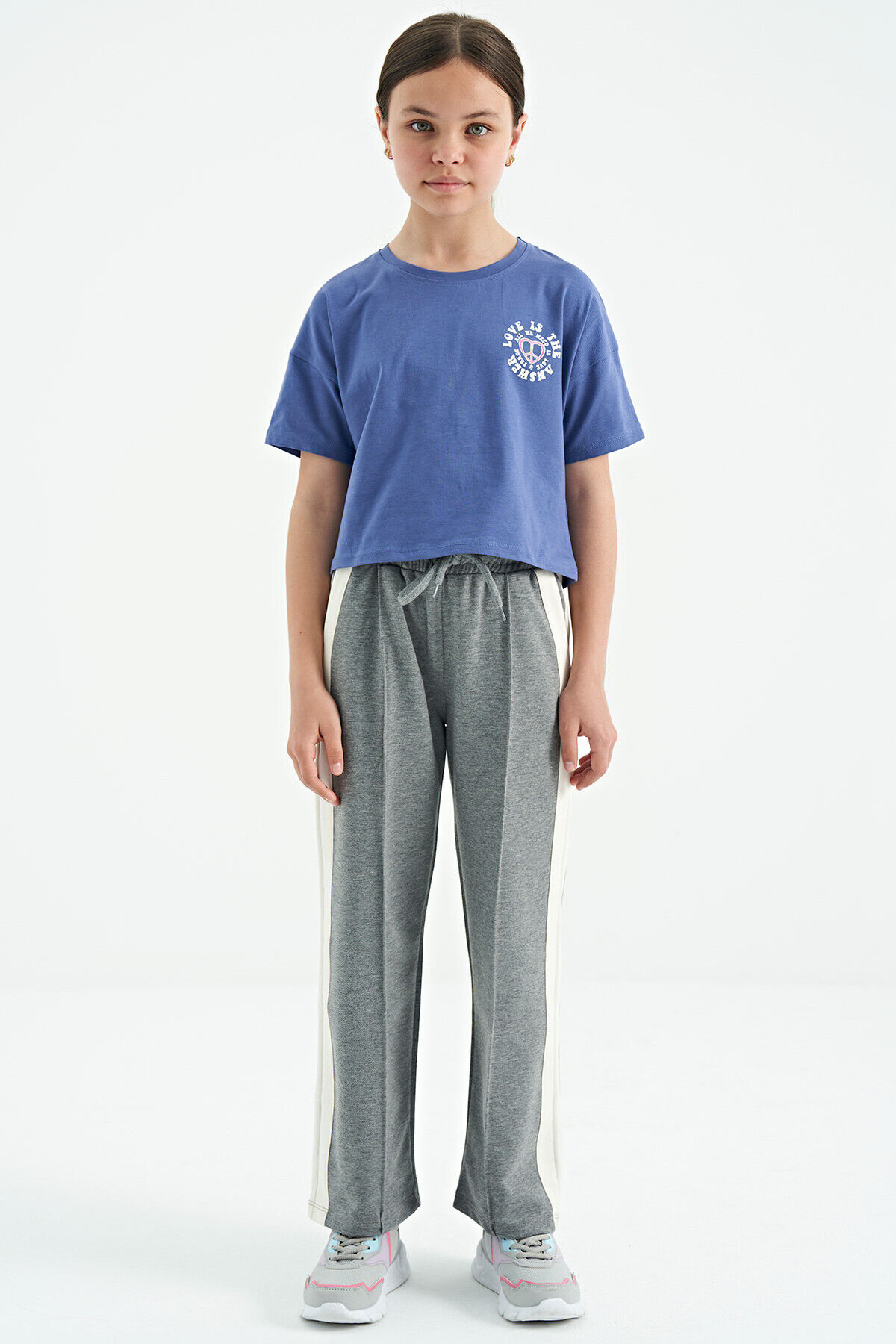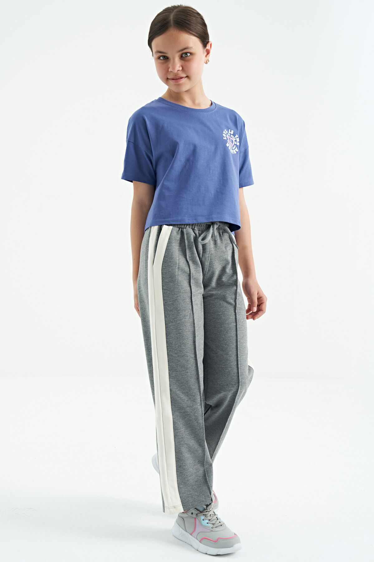 TommyLife Gri Melanj Yan Bant Detaylı Bağcıklı Rahat Kalıp Geniş Paça Kız Çocuk Eşofman Alt - 75119