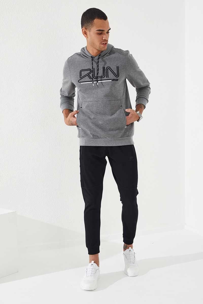TommyLife Gri Melanj Yazı Nakışlı Standart Kalıp Kapüşonlu Erkek Sweatshirt - 87887