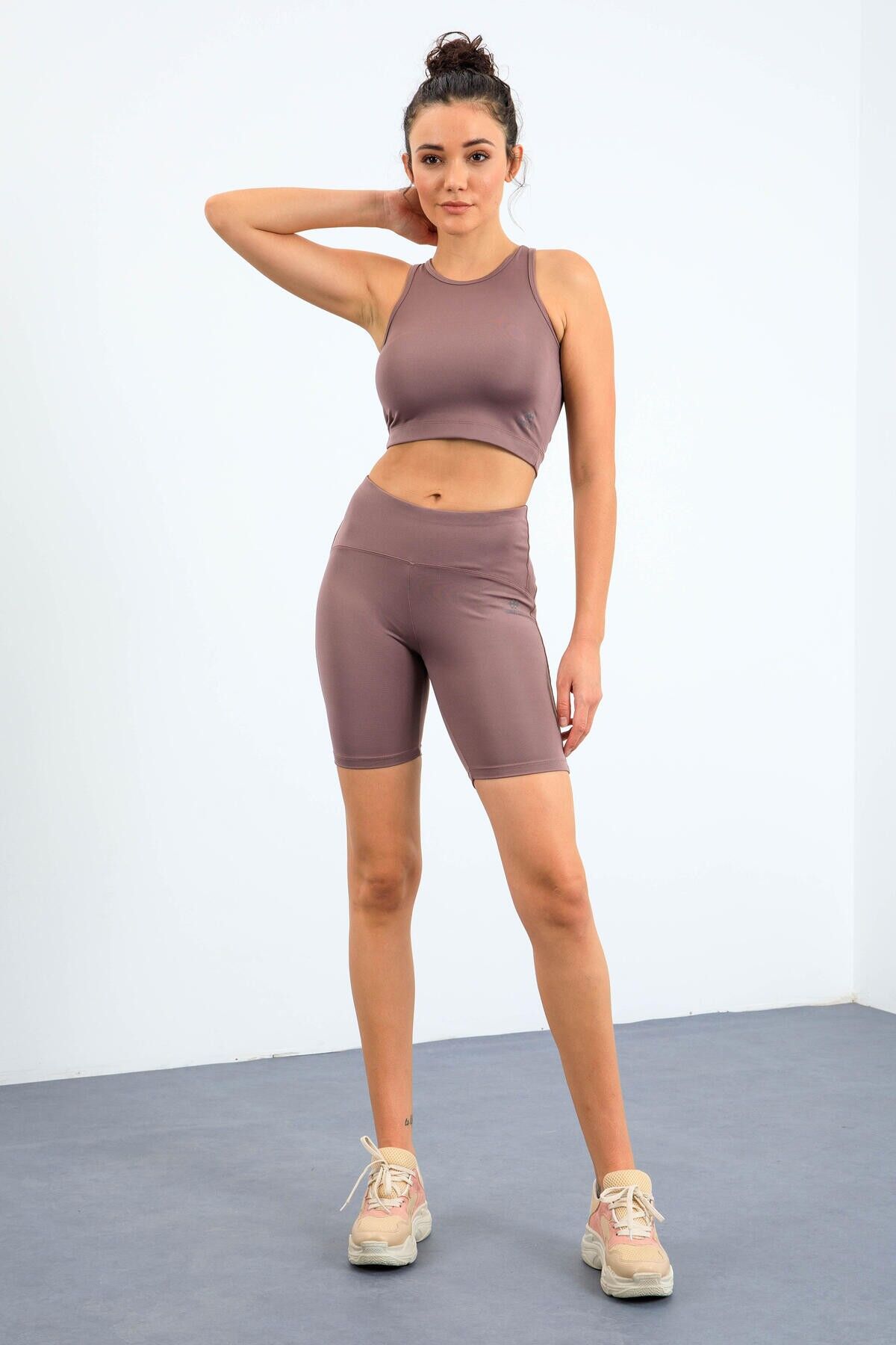 TommyLife Gül Kurusu Yüksek Bel Toparlayıcı Dar Kalıp Crop Biker Kadın Tayt Takım - 95302