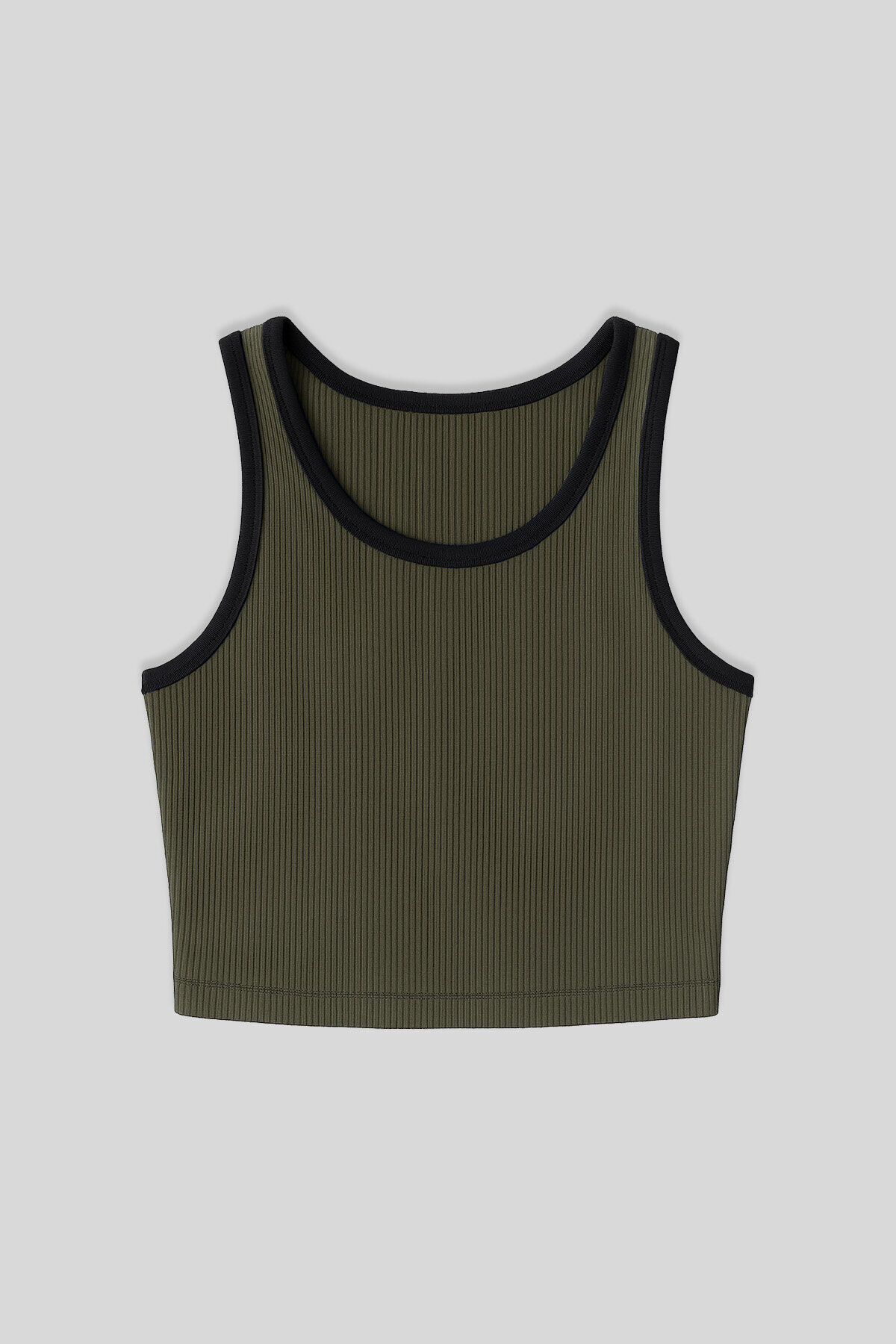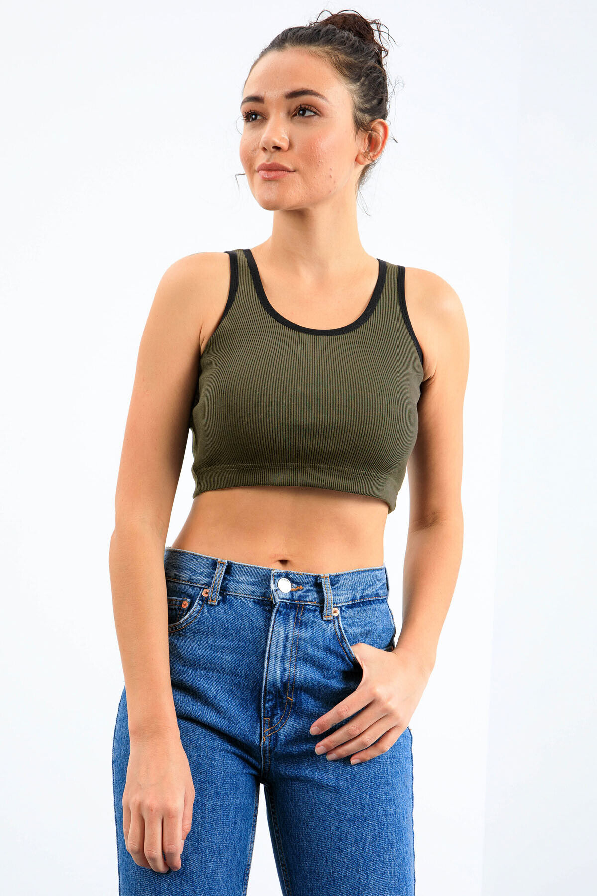 TommyLife Haki Basic Sıfır Kol Dar Kalıp U Yaka Kadın Crop Top Atlet - 97160