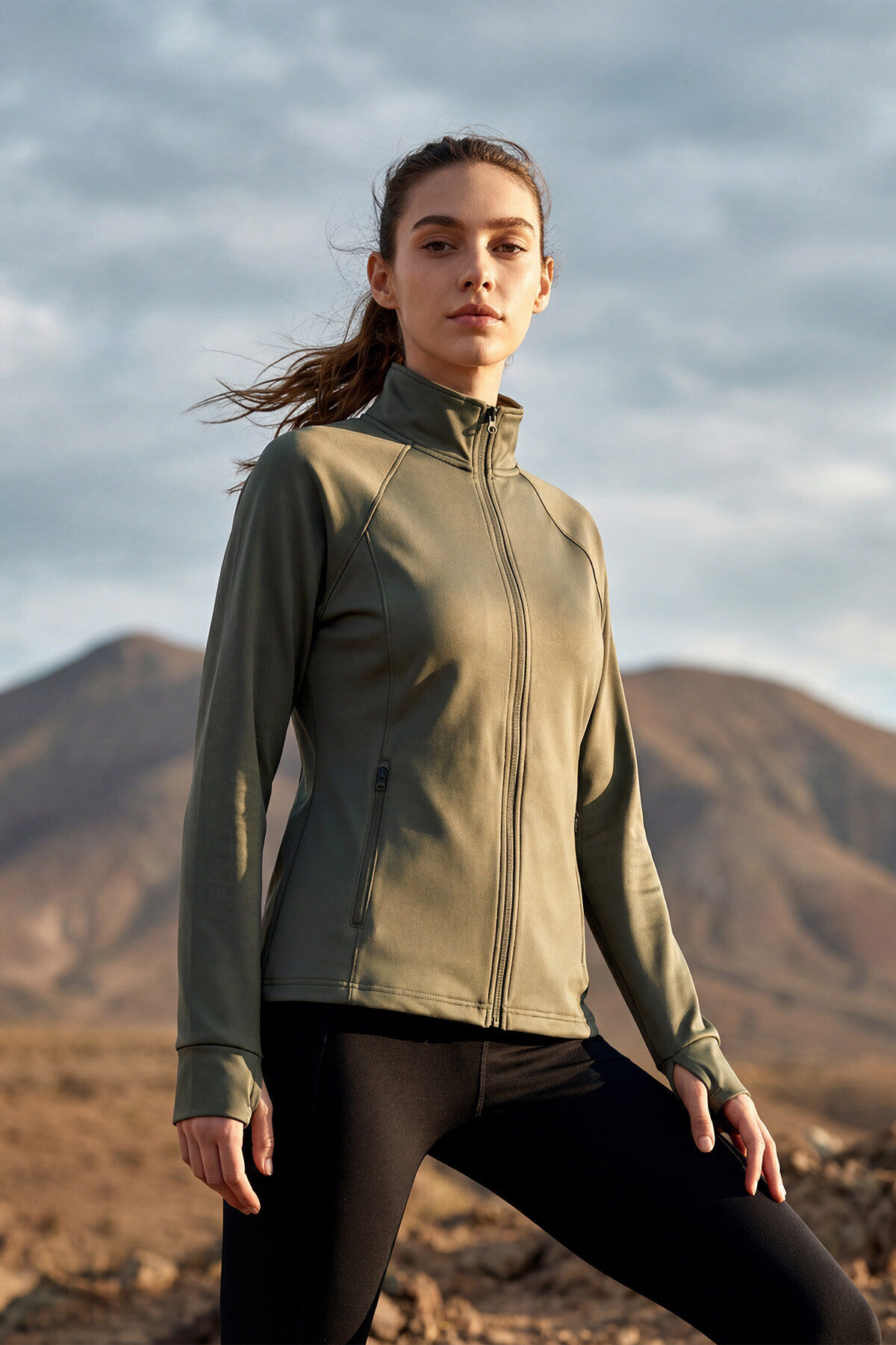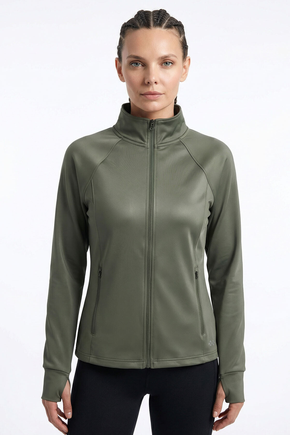 Haki Fermuarlı Dik Yaka Basic Rahat Form Kadın Koşu Ceketi - 97310