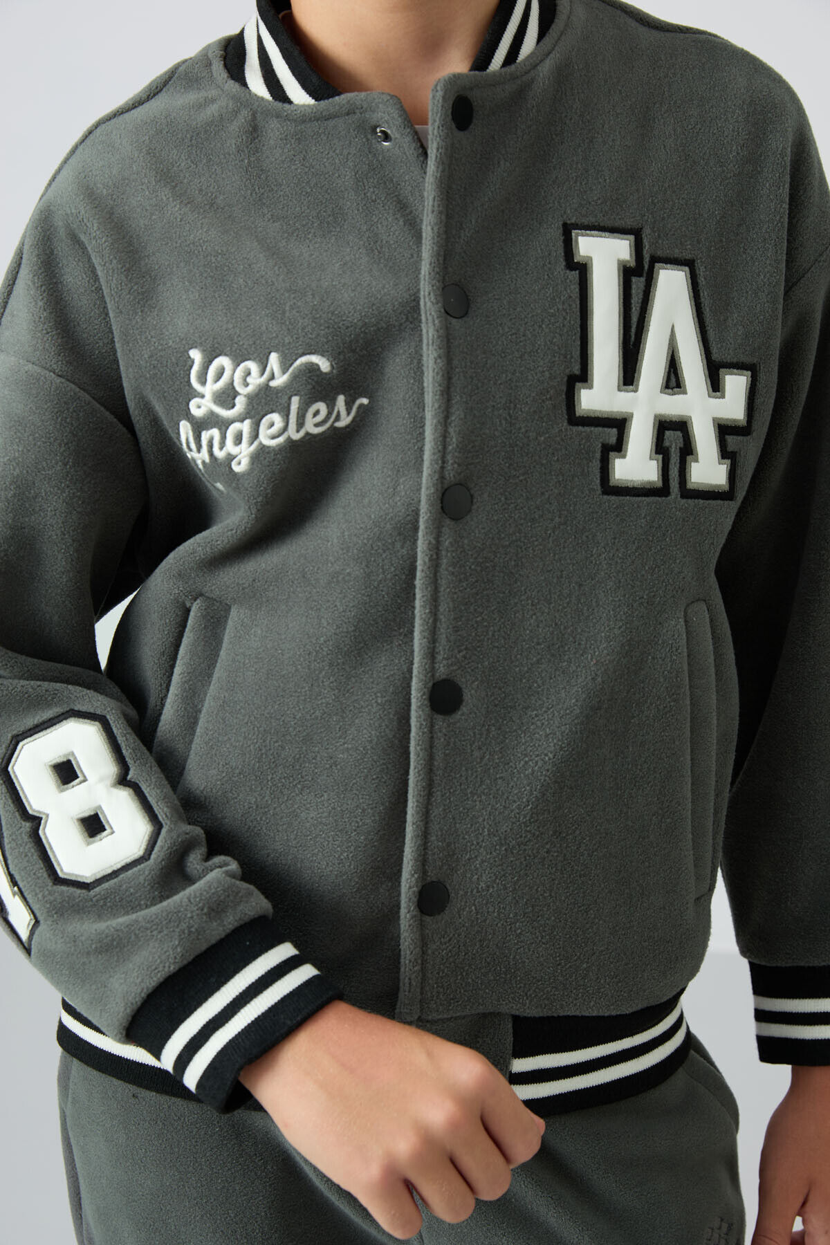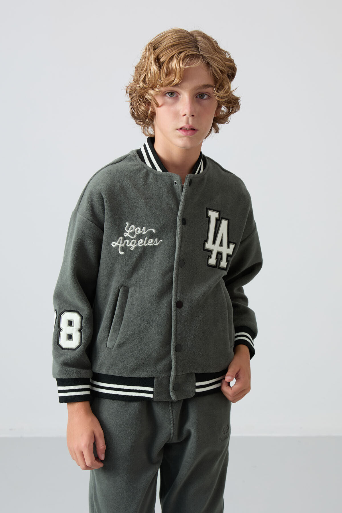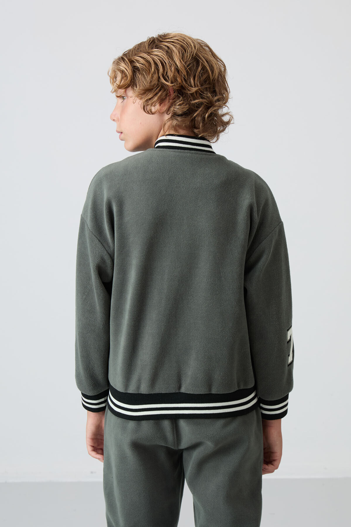 Haki Kalın Yumuşak Dokulu Standart Fit Nakışlı Polar Erkek Çocuk Kolej Ceket - 11227
