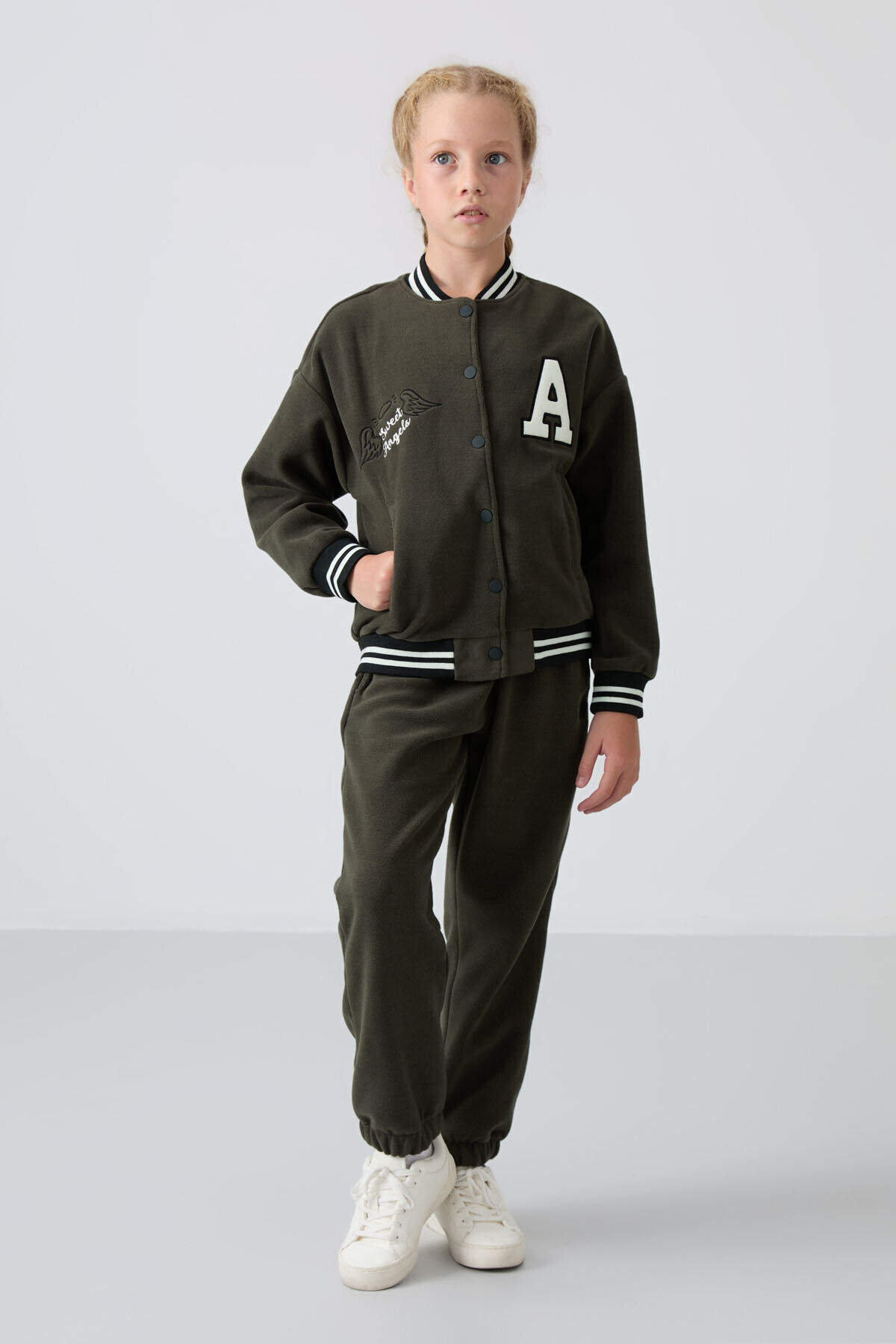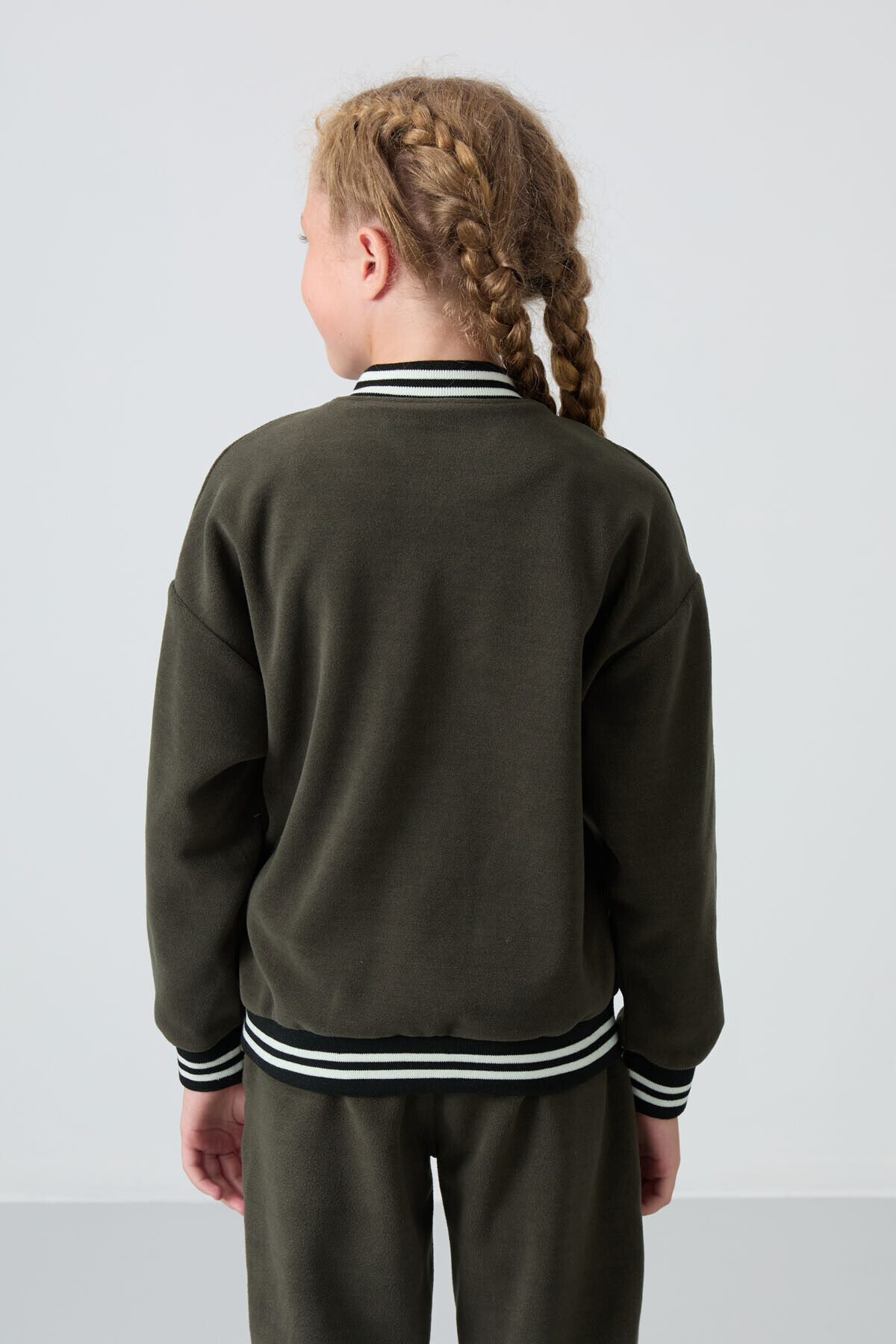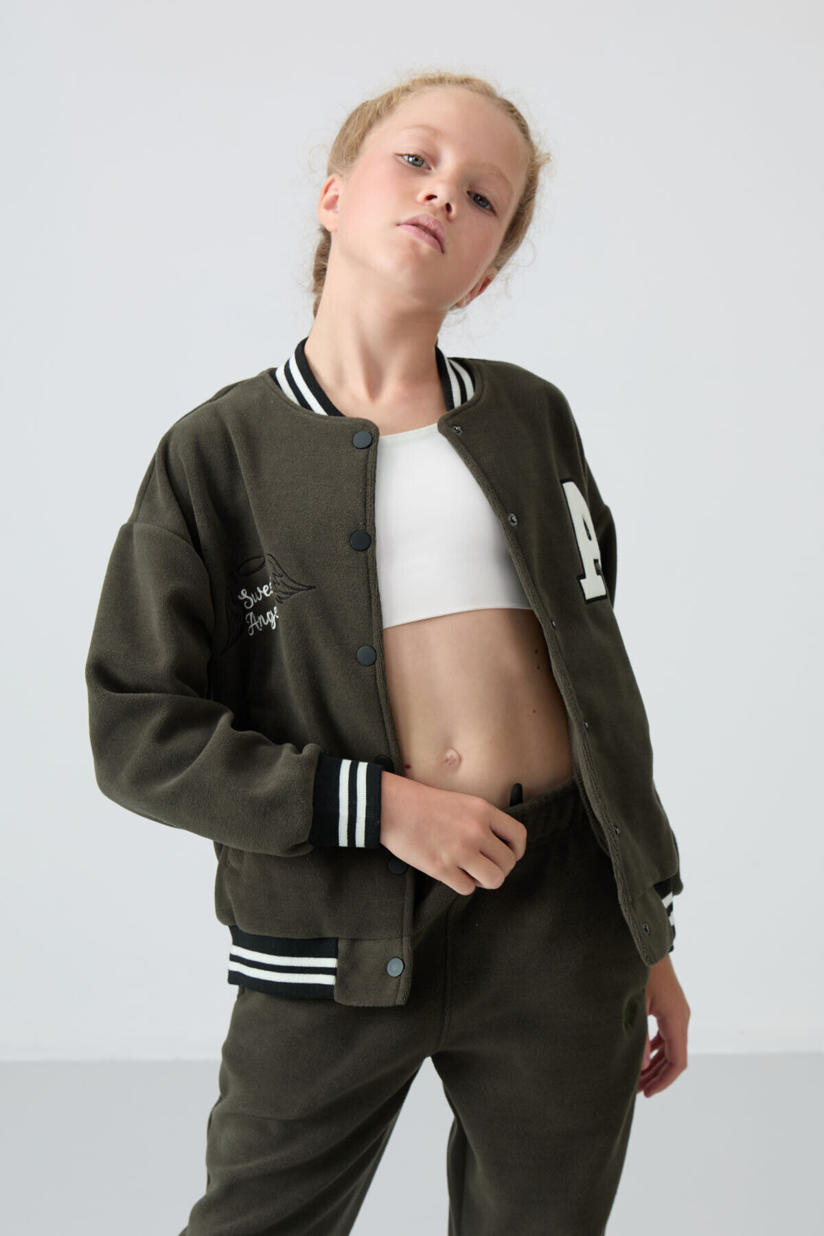 Haki Kalın Yumuşak Dokulu Standart Fit Nakışlı Polar Kız Çocuk Kolej Ceket - 75156