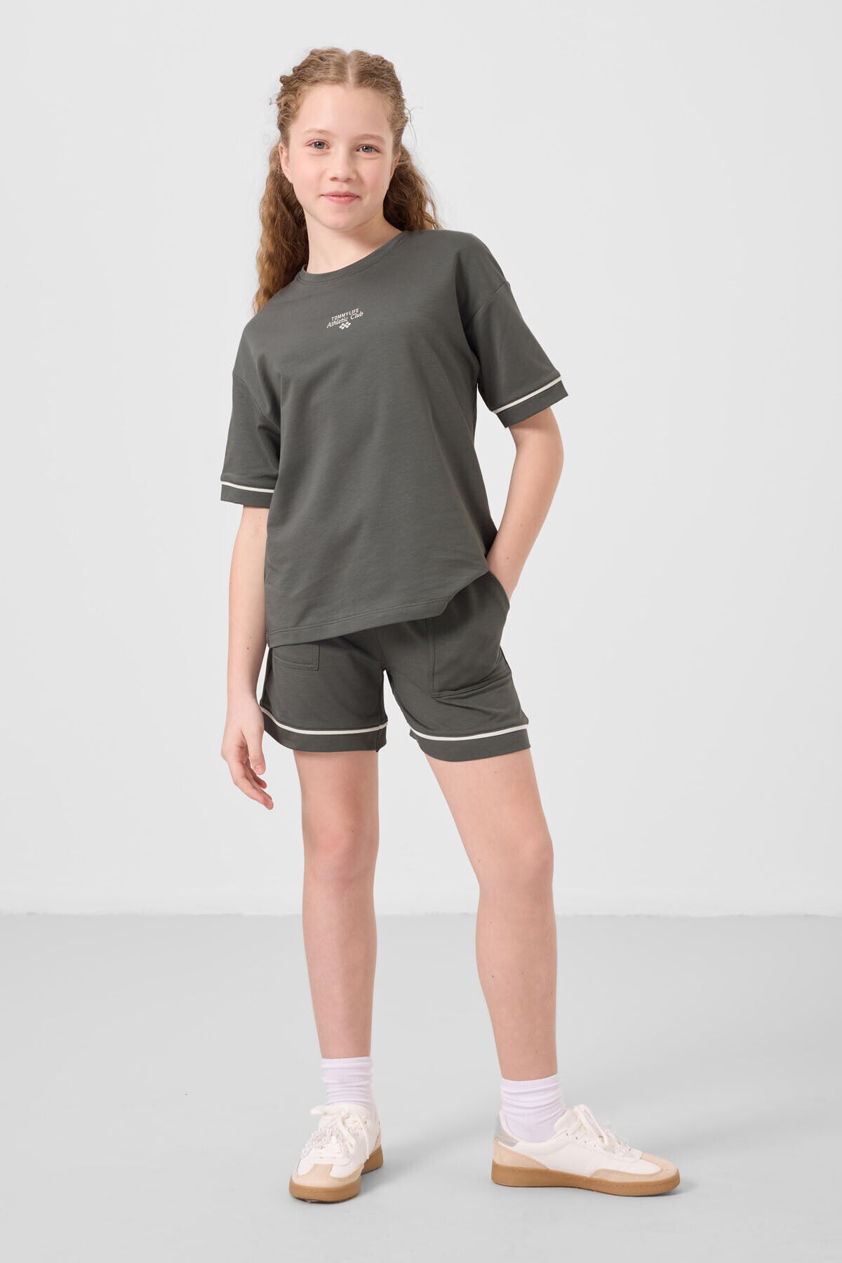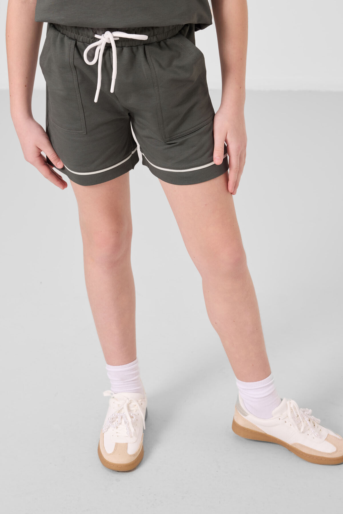 TommyLife Haki Pamuklu Yumuşak Dokulu Standart Fit Basic Kız Çocuk Şort Takım - 75183