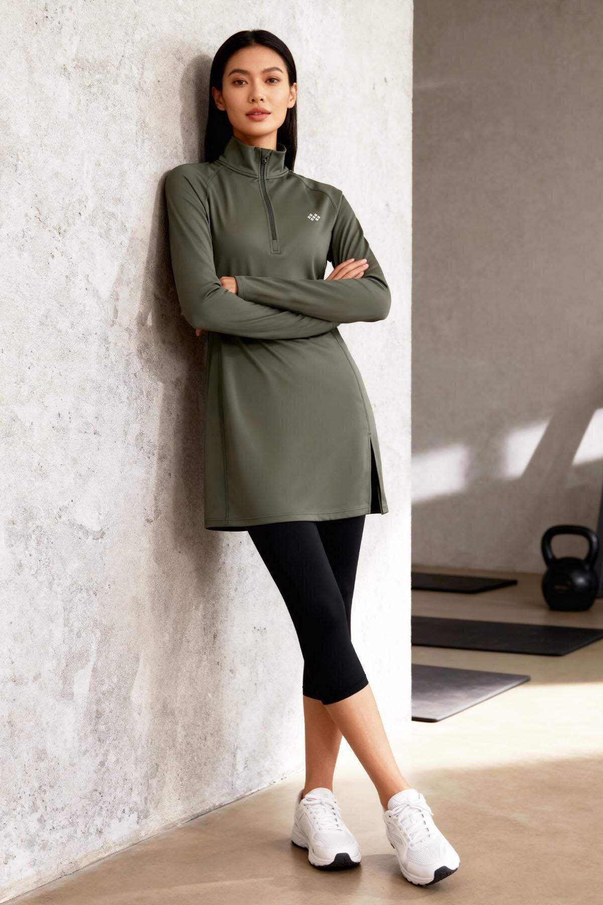 Haki Yarım Fermuarlı Dik Yaka Standart Kalıp Kadın Sporcu Tunik - 97309