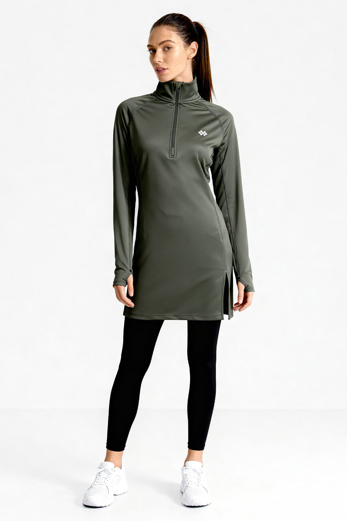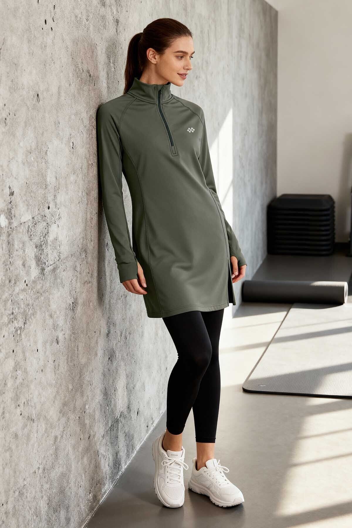 Haki Yarım Fermuarlı Dik Yaka Standart Kalıp Kadın Sporcu Tunik - 97309