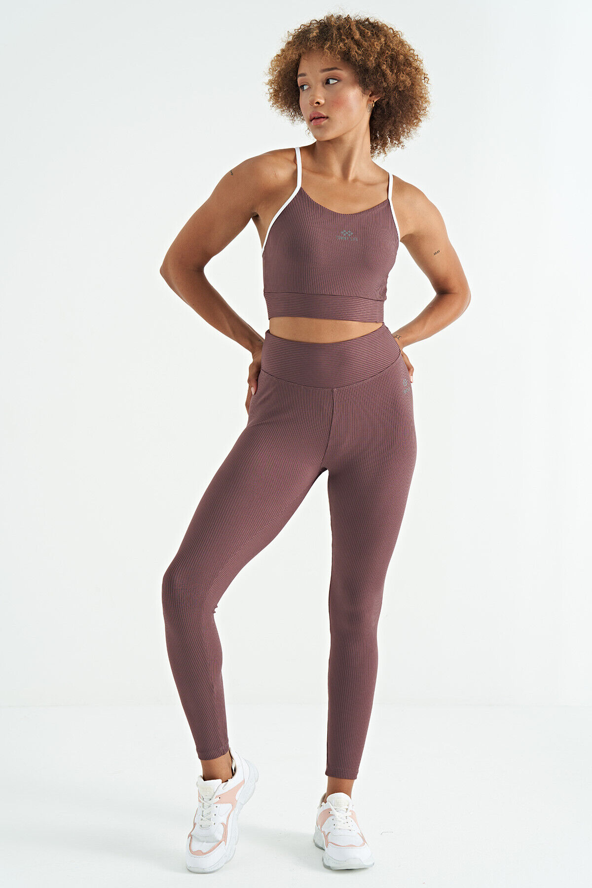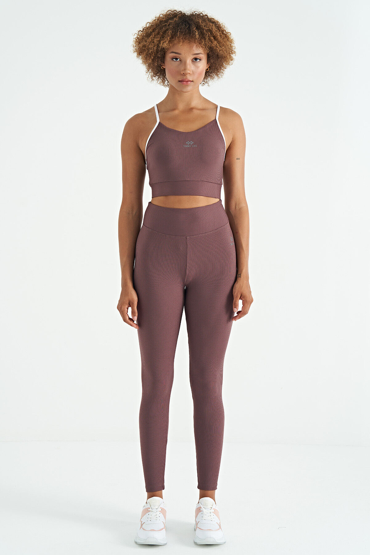 TommyLife Kahverengi Sırt Çapraz Detaylı Logo Baskılı Dar Kalıp Fitilli Kadın Büstiyer - 97274