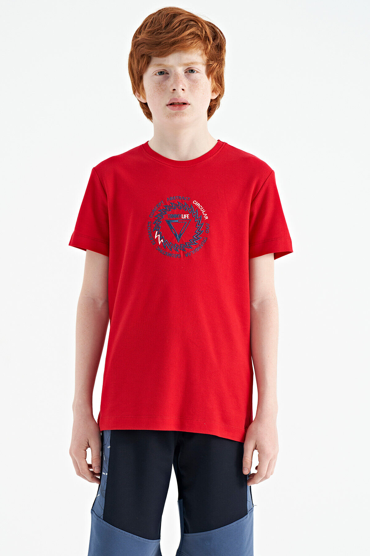 TommyLife Kırmızı Nakış İşleme Detaylı O Yaka Standart Kalıp Erkek Çocuk T-Shirt - 11115