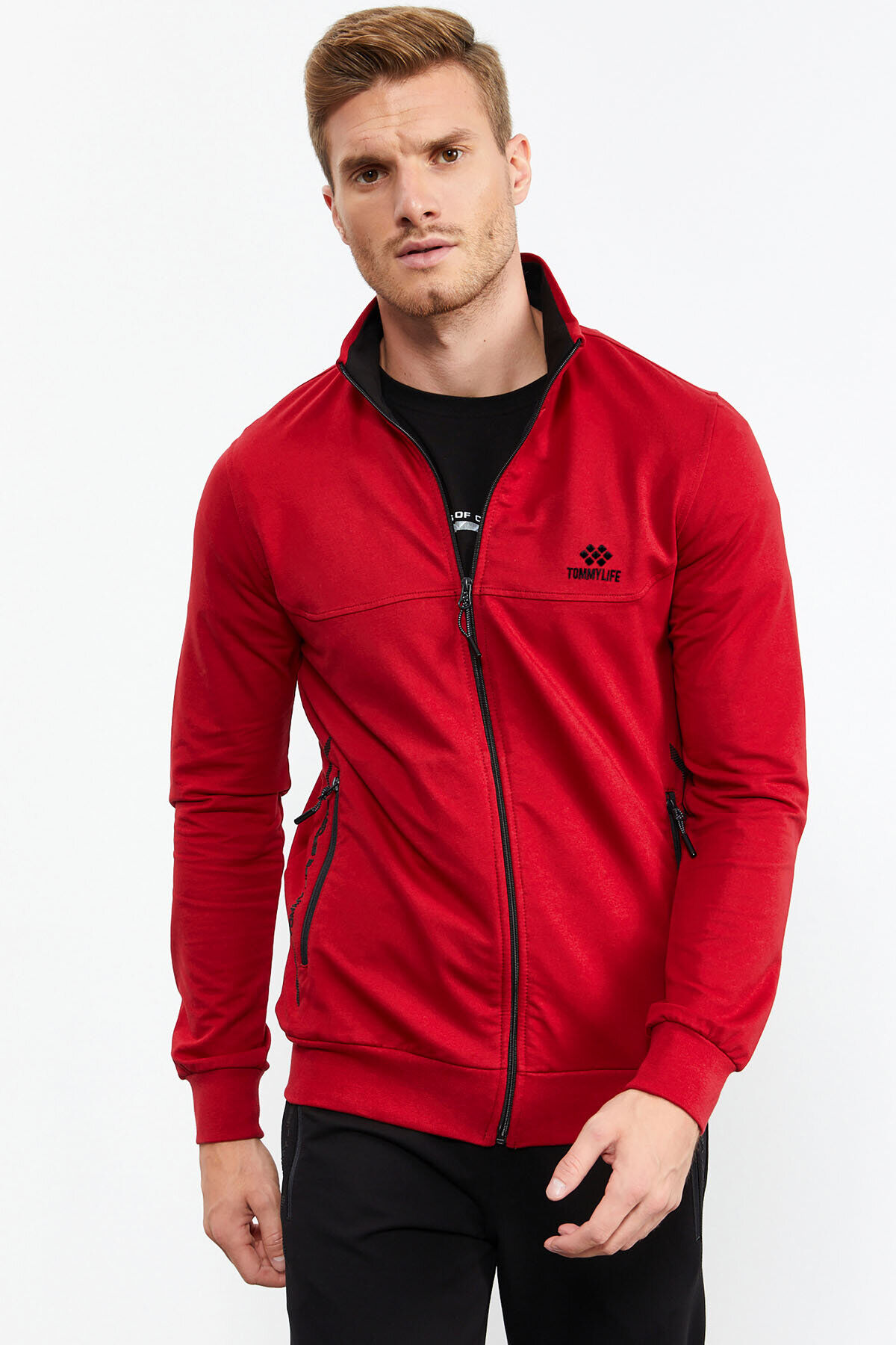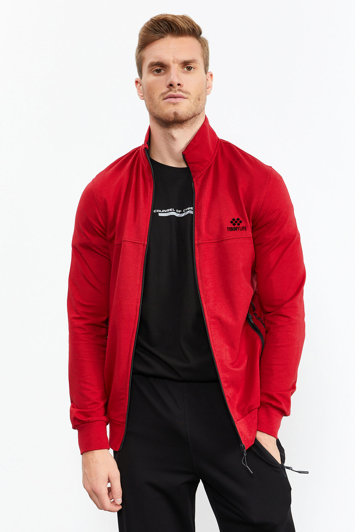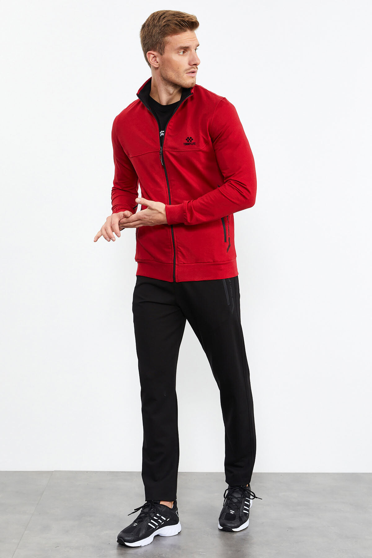 TommyLife Kırmızı - Siyah Dik Yaka Fermuarlı Standart Kalıp Klasik Paça Erkek Eşofman Takımı - 85152