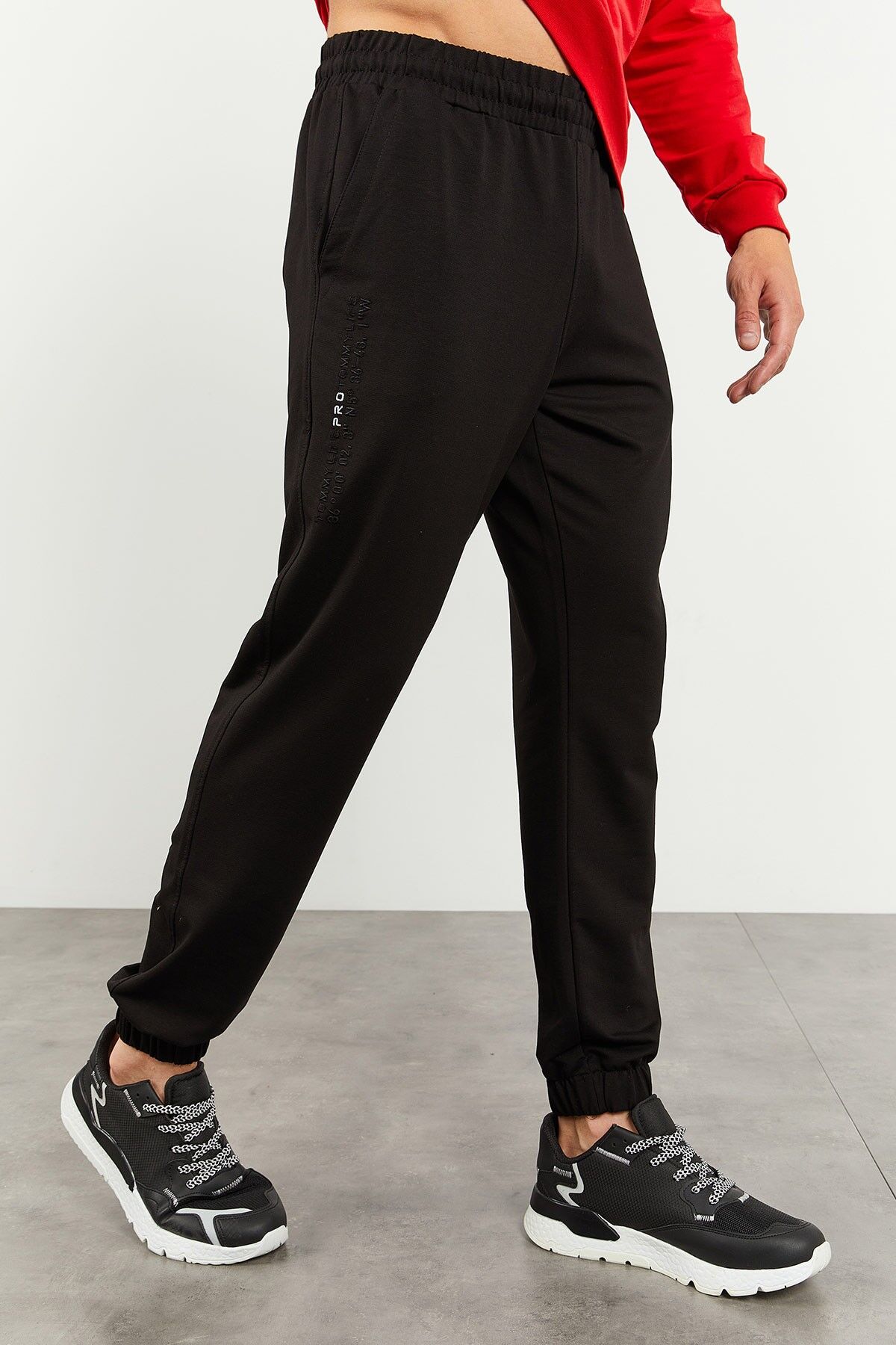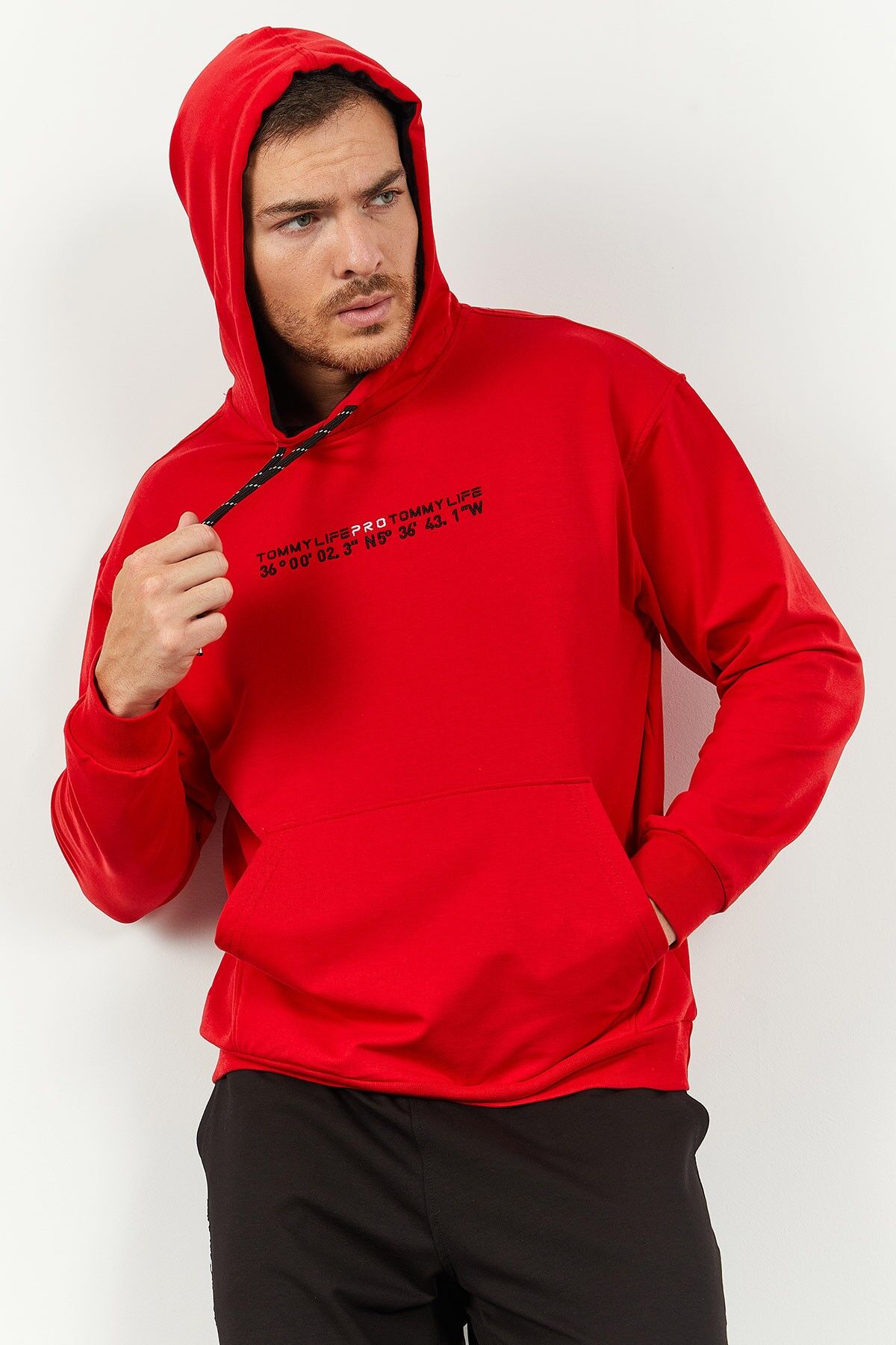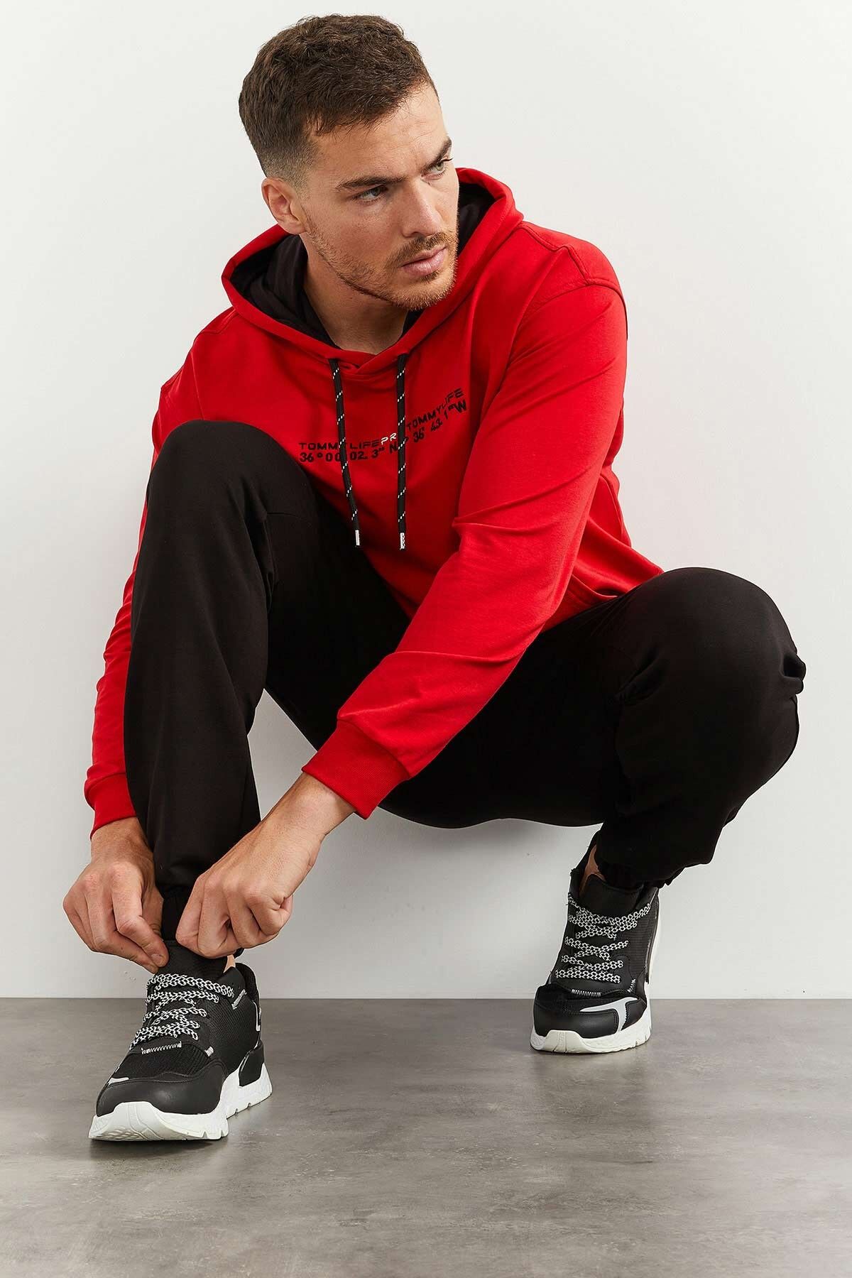 TommyLife Kırmızı - Siyah Kapüşonlu Kanguru Cep Lastik Paça Erkek Oversize Eşofman Takımı - 85117